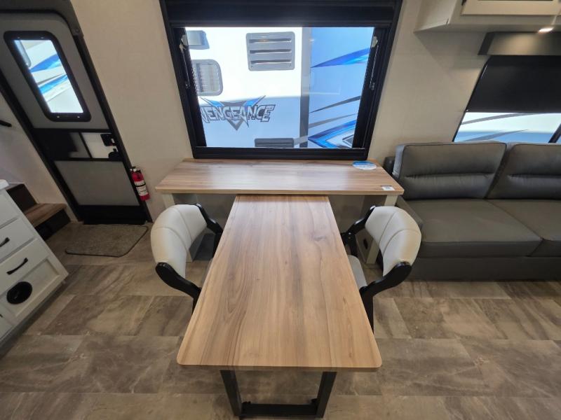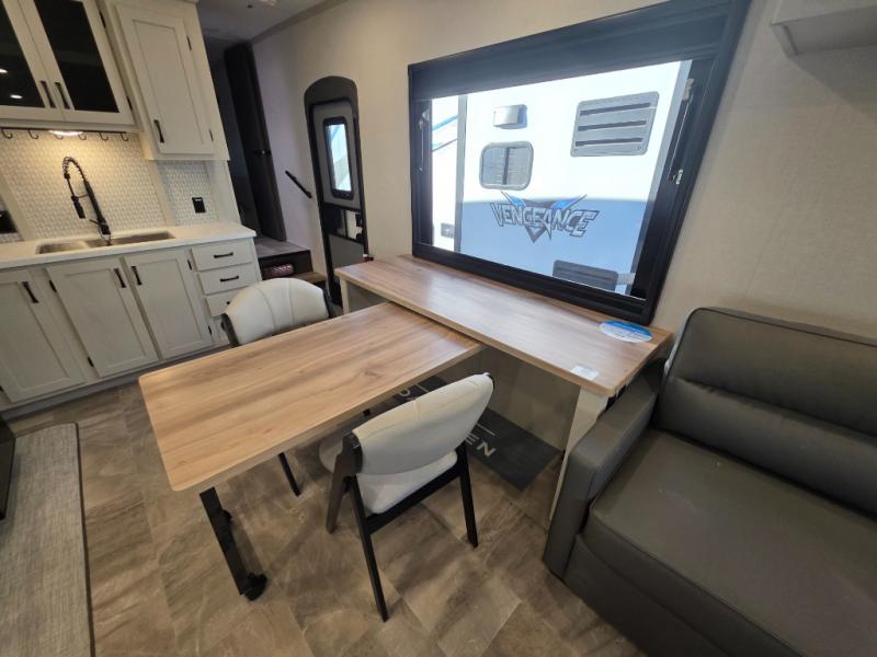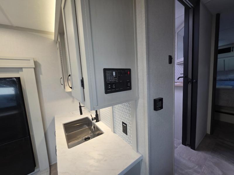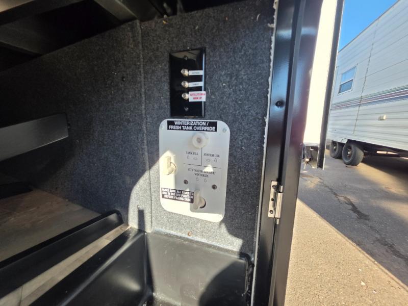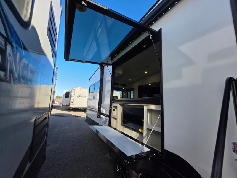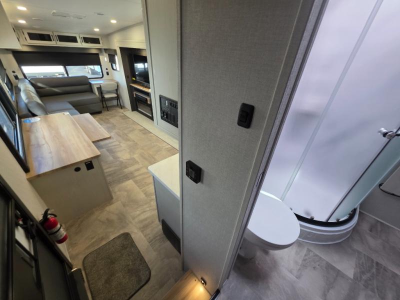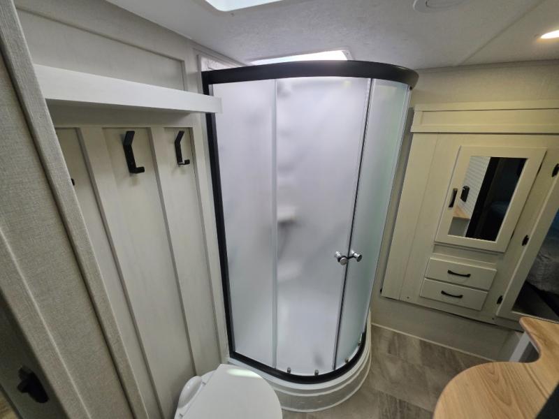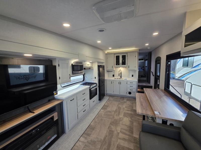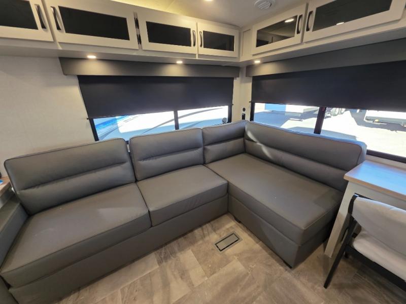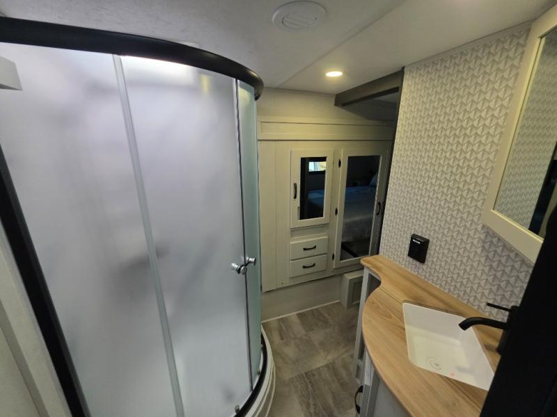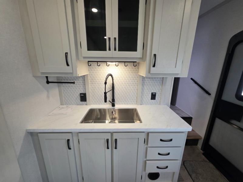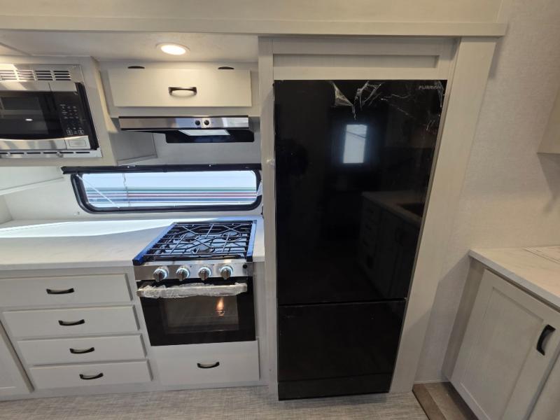 Enjoy the features this fifth wheeler has to offer for your next roadtrip! Have a great time with friends and family while you appreciate the pleasent outdoor view and enjoy some drinks at the table height fixed bar, or have a relaxing rest on the spacious j-lounge sofa that can turn into a bed so you can kick back and relax however you prefer. You can also enjoy a treat stored conveniently in the hidden swing-out pantry to maximize space and have easy access when craving a snack before enjoying some TV. Here you will find a front bedroom that includes great options for storage including a wardrobe to keep all your clothes wrinkle-free, after a day of adventure, refresh and recharge in your bathroom complete with a radius shower, modern fixtures, and everything you need to unwind before settling into your cozy queen bed.
