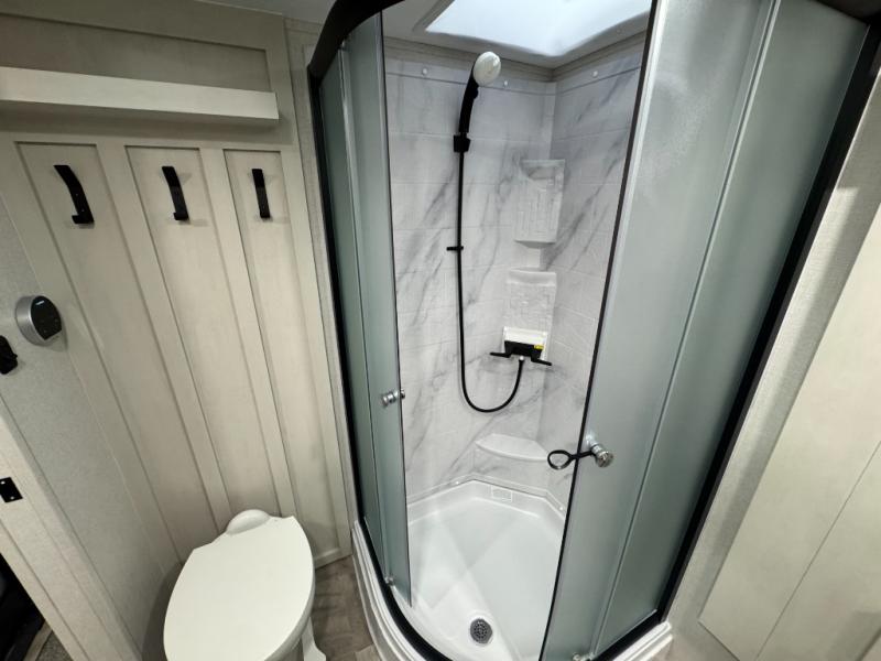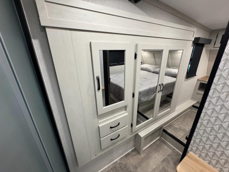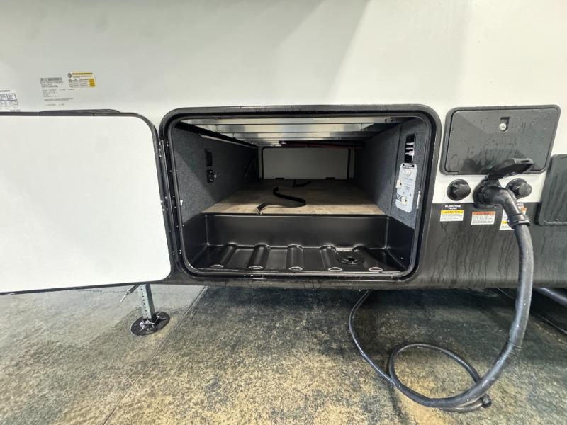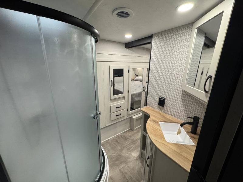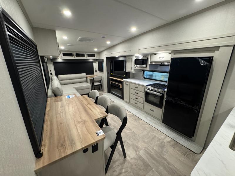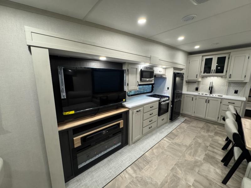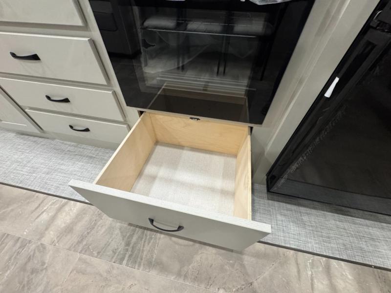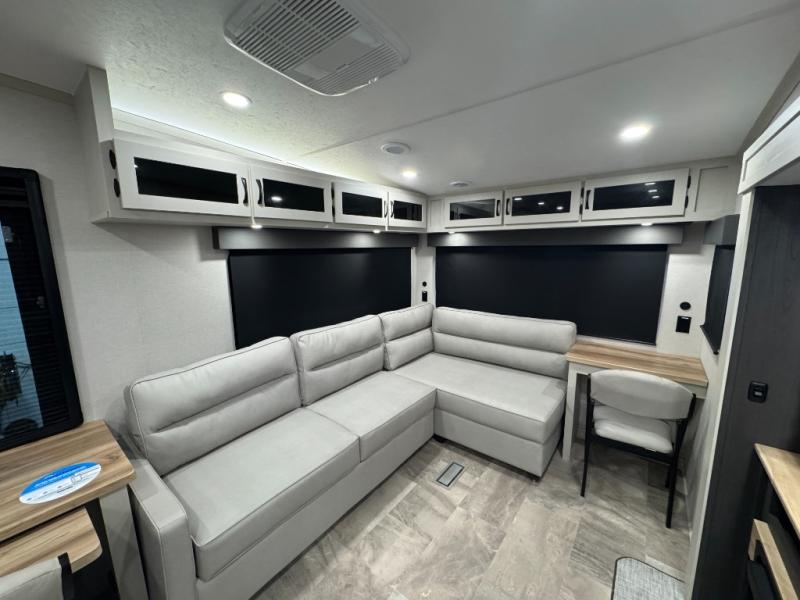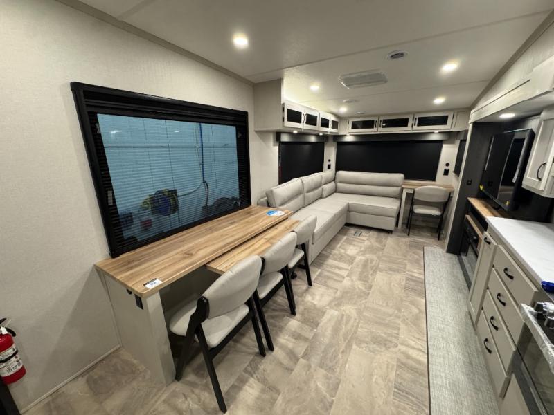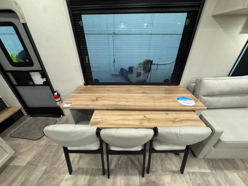 Enjoy the features this fifth wheeler has to offer for your next roadtrip! Have a great time with friends and family while you appreciate the pleasent outdoor view and enjoy some drinks at the table height fixed bar, or have a relaxing rest on the spacious j-lounge sofa that can turn into a bed so you can kick back and relax however you prefer. You can also enjoy a treat stored conveniently in the hidden swing-out pantry to maximize space and have easy access when craving a snack before enjoying some TV. Here you will find a front bedroom that includes great options for storage including a wardrobe to keep all your clothes wrinkle-free, after a day of adventure, refresh and recharge in your bathroom complete with a radius shower, modern fixtures, and everything you need to unwind before settling into your cozy queen bed.