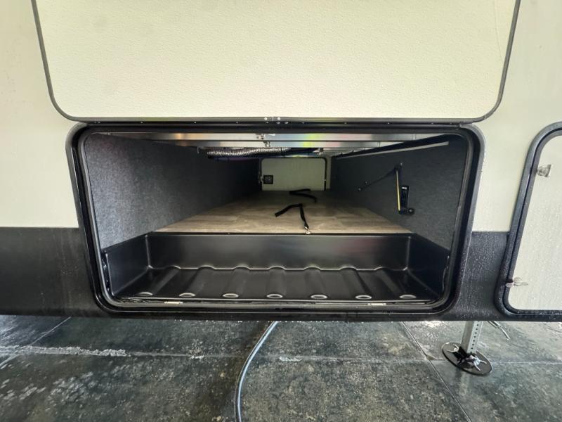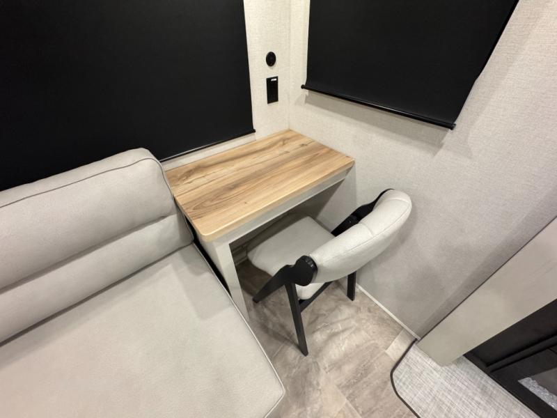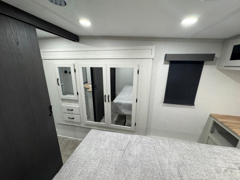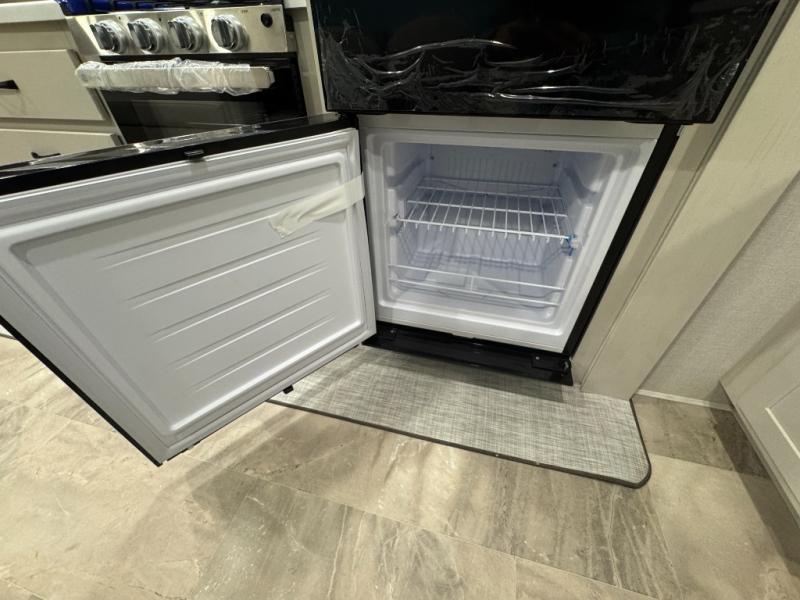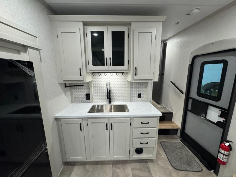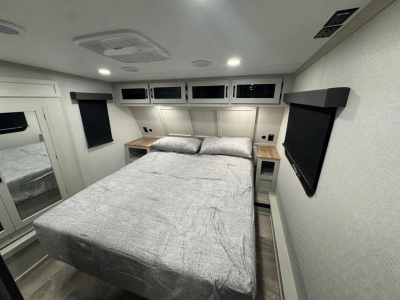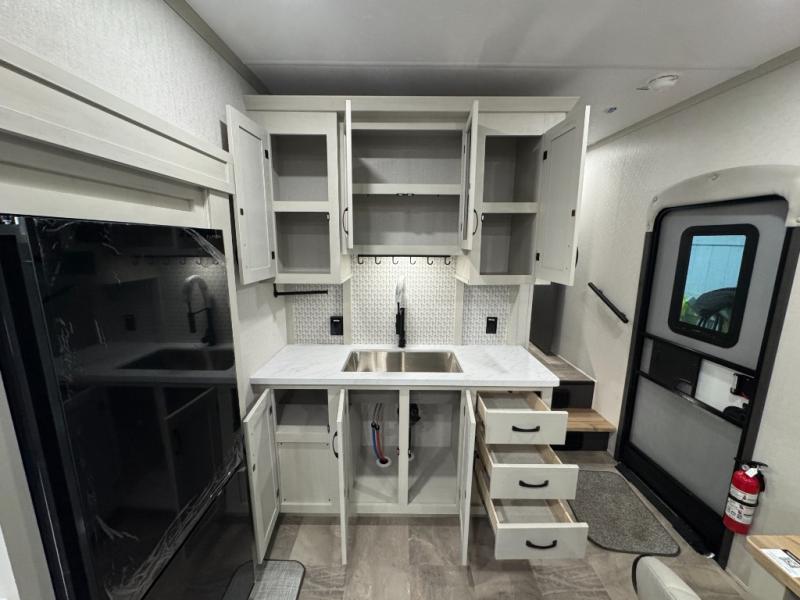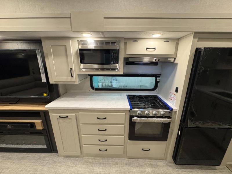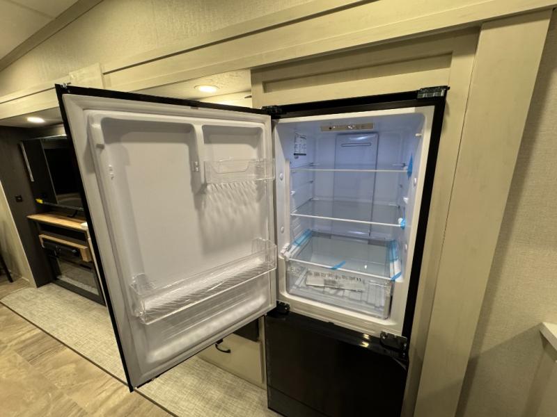 Enjoy the features this fifth wheeler has to offer for your next roadtrip! Have a great time with friends and family while you appreciate the pleasent outdoor view and enjoy some drinks at the table height fixed bar, or have a relaxing rest on the spacious j-lounge sofa that can turn into a bed so you can kick back and relax however you prefer. You can also enjoy a treat stored conveniently in the hidden swing-out pantry to maximize space and have easy access when craving a snack before enjoying some TV. Here you will find a front bedroom that includes great options for storage including a wardrobe to keep all your clothes wrinkle-free, after a day of adventure, refresh and recharge in your bathroom complete with a radius shower, modern fixtures, and everything you need to unwind before settling into your cozy queen bed.
