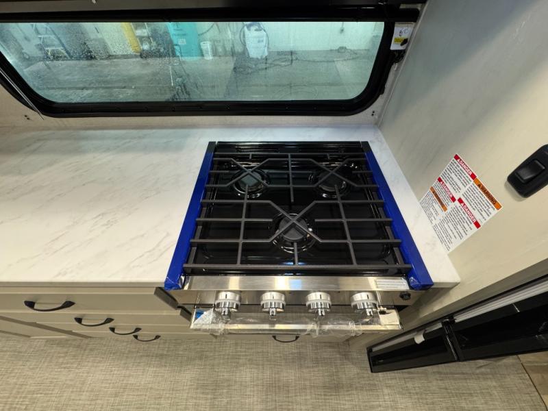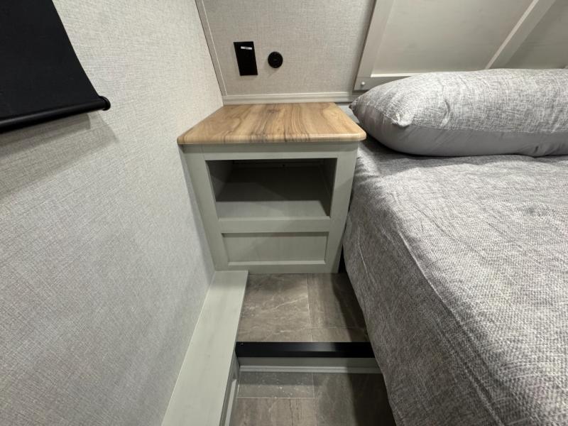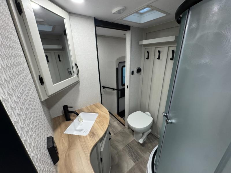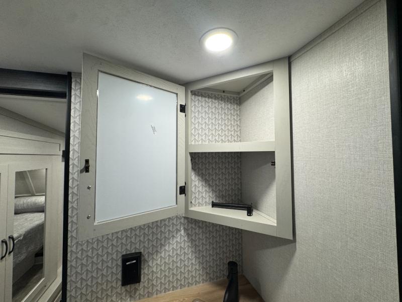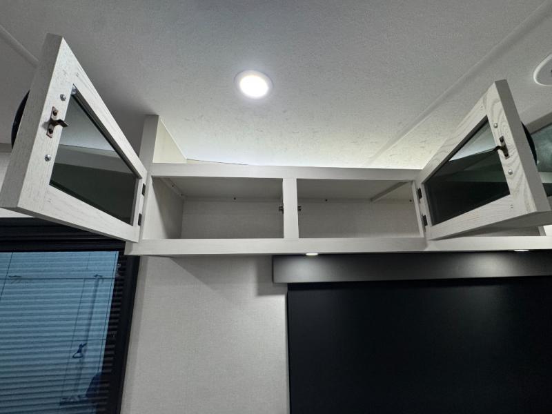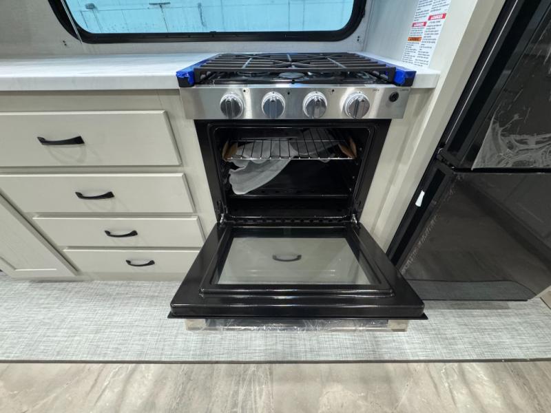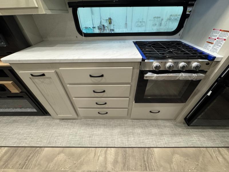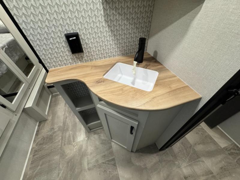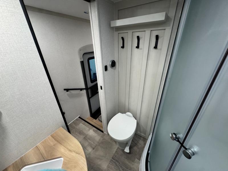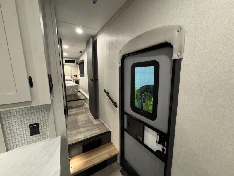 Enjoy the features this fifth wheeler has to offer for your next roadtrip! Have a great time with friends and family while you appreciate the pleasent outdoor view and enjoy some drinks at the table height fixed bar, or have a relaxing rest on the spacious j-lounge sofa that can turn into a bed so you can kick back and relax however you prefer. You can also enjoy a treat stored conveniently in the hidden swing-out pantry to maximize space and have easy access when craving a snack before enjoying some TV. Here you will find a front bedroom that includes great options for storage including a wardrobe to keep all your clothes wrinkle-free, after a day of adventure, refresh and recharge in your bathroom complete with a radius shower, modern fixtures, and everything you need to unwind before settling into your cozy queen bed.