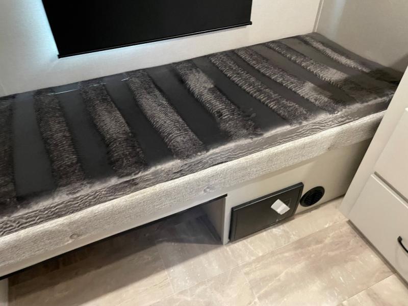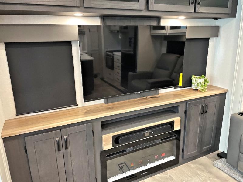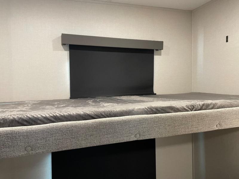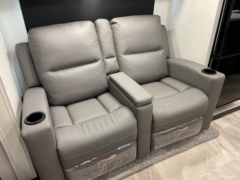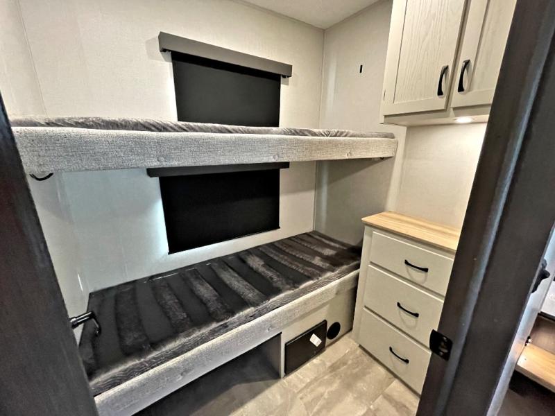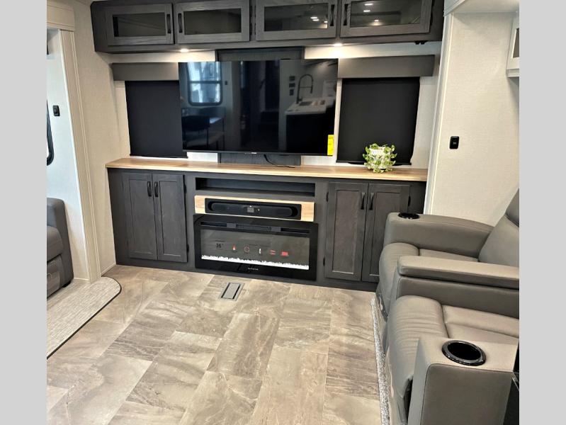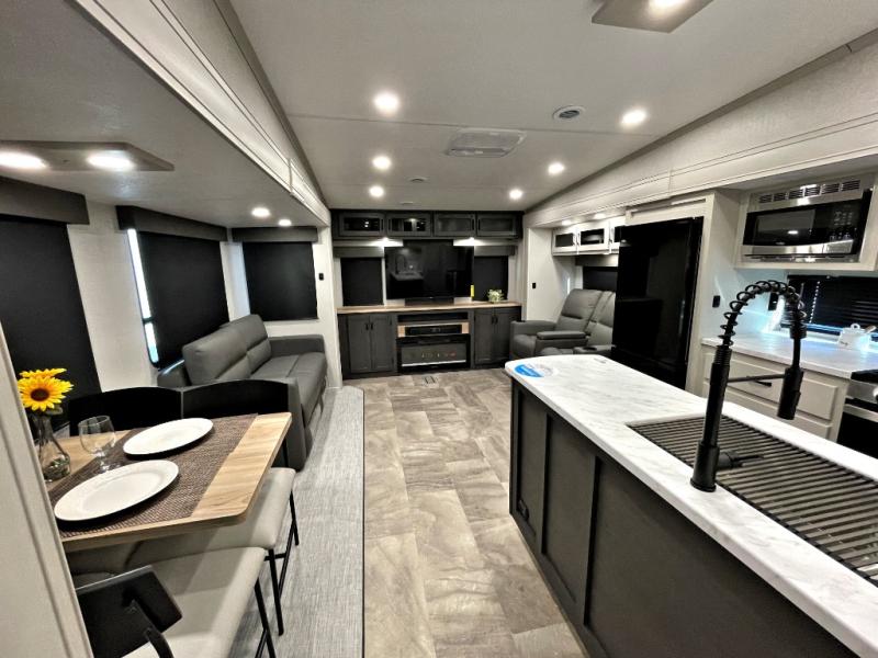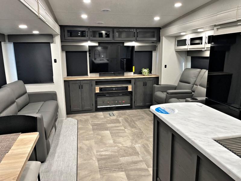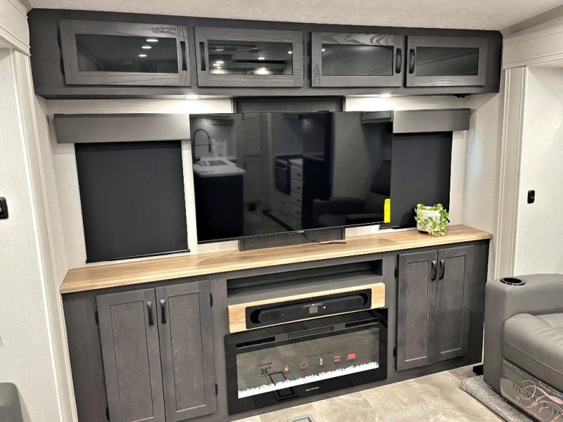 This fifth wheel is perfect for families or large groups since there is a front master bedroom and a middle bunkhouse! The front master suite not only has a queen bed to lay your head on at night and a wardrobe slide, but also an entrance into the dual entry bathroom. The middle bunkhouse has a 30" x 74" bunk bed and a flip-up bunk, shoe storage, and overhead cabinets to keep the clutter away. Grab some eggs from the 10 cu. ft. GE Stainless 12V refrigerator, fry them up on the three burner cooktop, and enjoy them at the free-spanning table. You can then read the morning newspaper on either the tri-fold hide-a-bed sofa and theater seating or watch the news with the rear entertainment center!