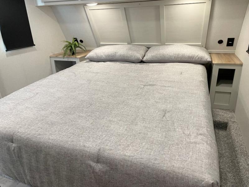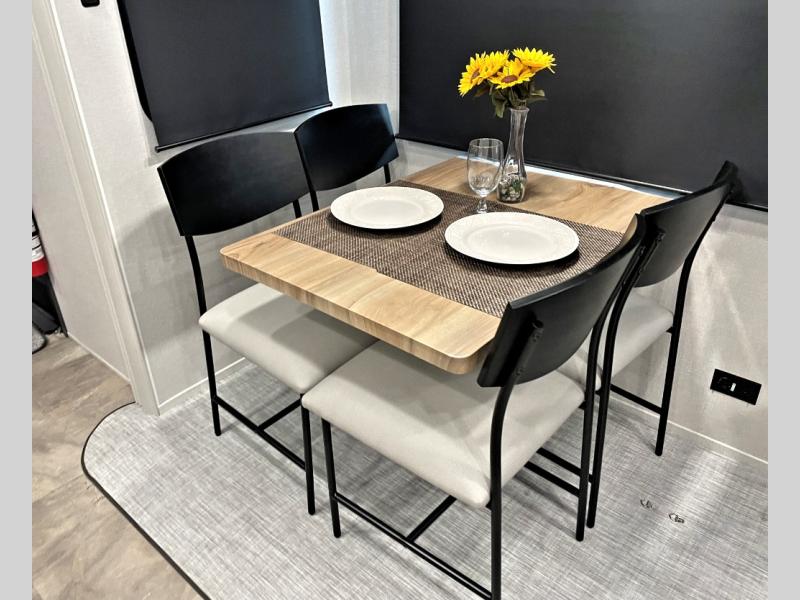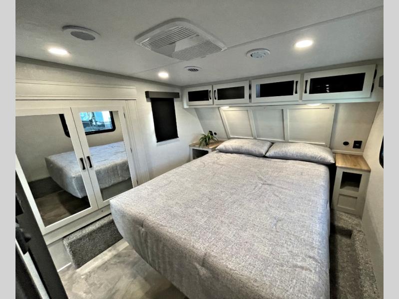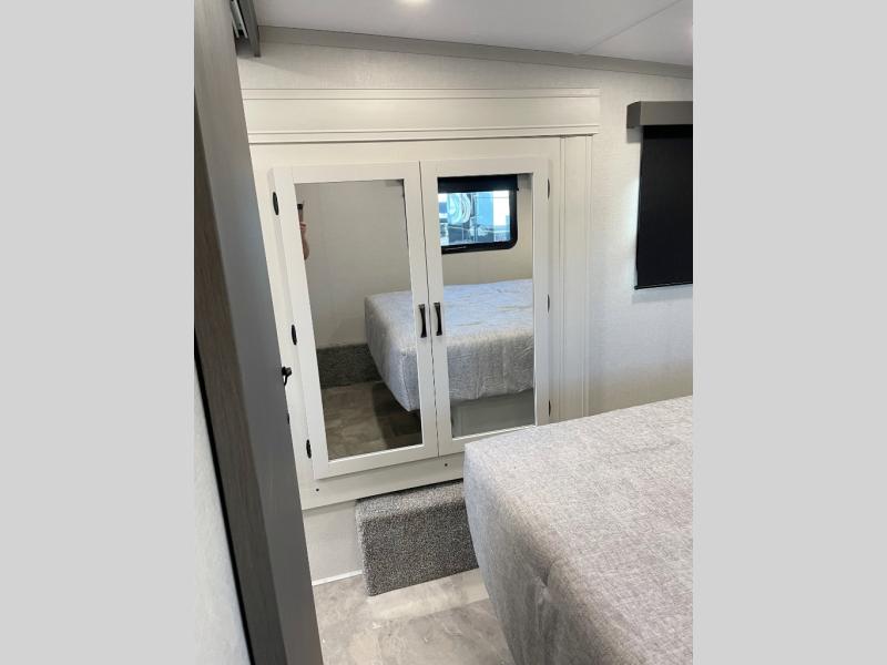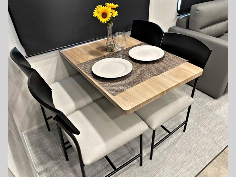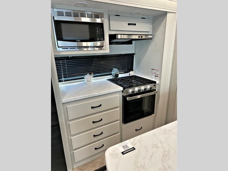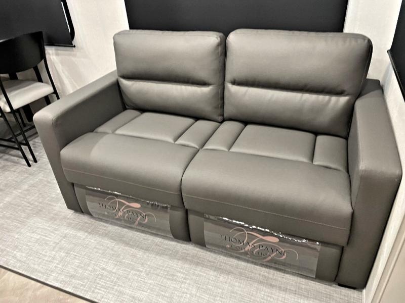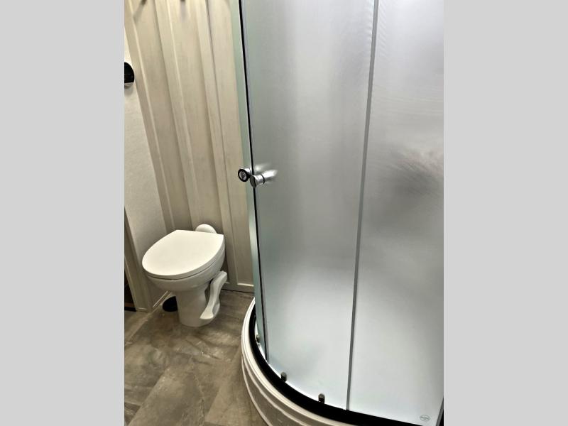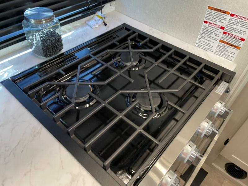 This fifth wheel is perfect for families or large groups since there is a front master bedroom and a middle bunkhouse! The front master suite not only has a queen bed to lay your head on at night and a wardrobe slide, but also an entrance into the dual entry bathroom. The middle bunkhouse has a 30" x 74" bunk bed and a flip-up bunk, shoe storage, and overhead cabinets to keep the clutter away. Grab some eggs from the 10 cu. ft. GE Stainless 12V refrigerator, fry them up on the three burner cooktop, and enjoy them at the free-spanning table. You can then read the morning newspaper on either the tri-fold hide-a-bed sofa and theater seating or watch the news with the rear entertainment center!