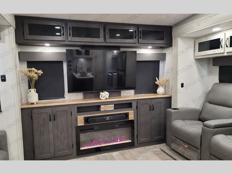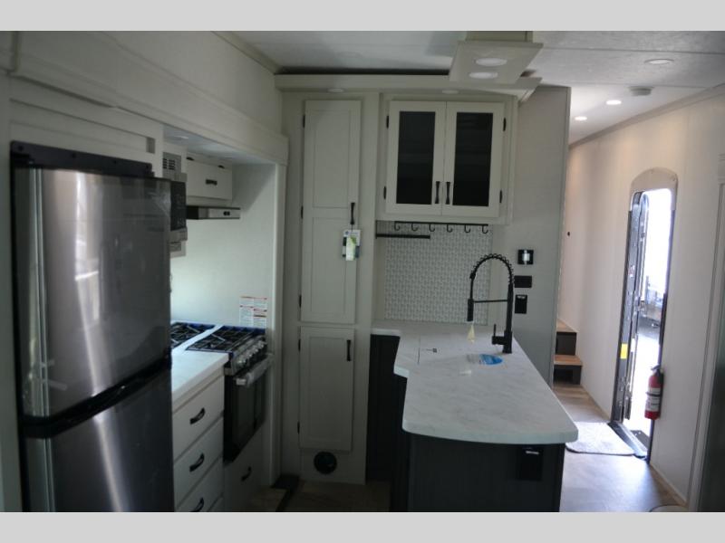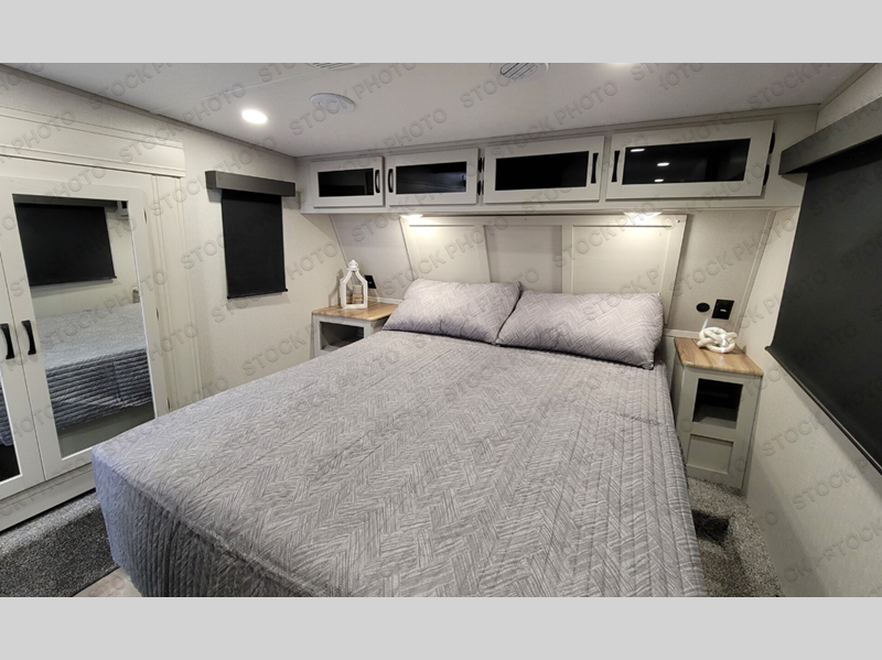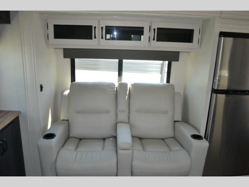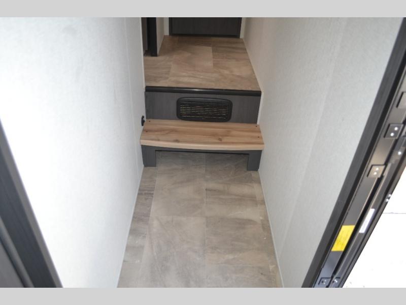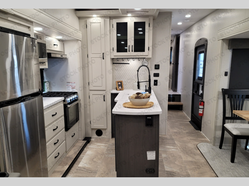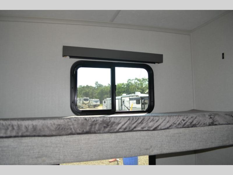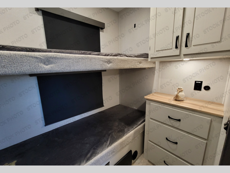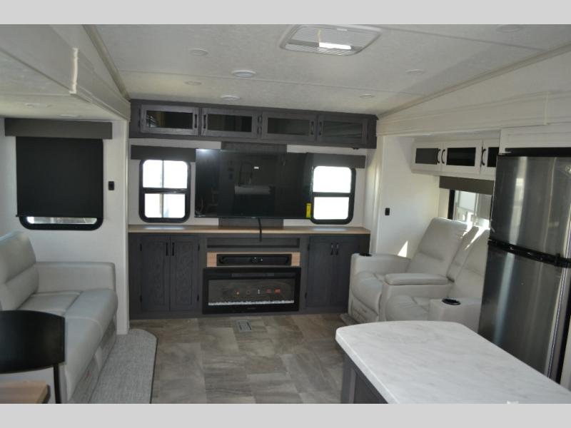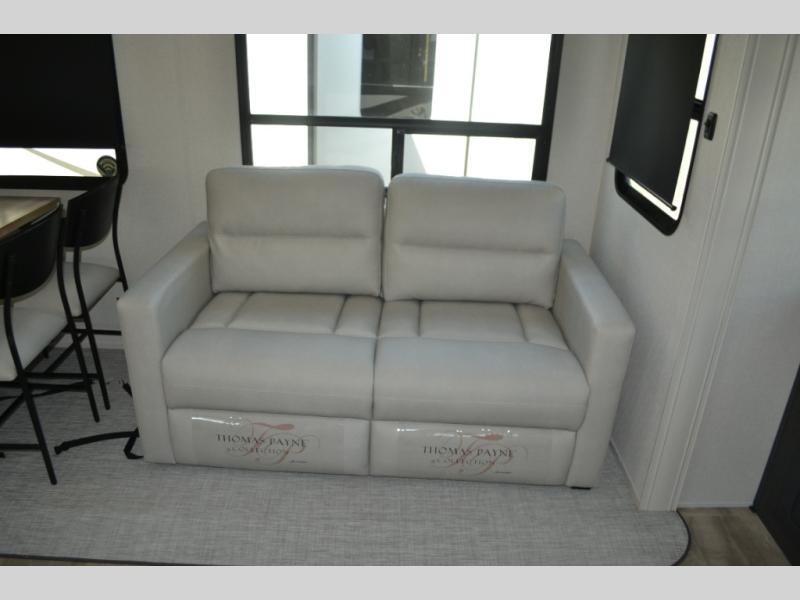 This fifth wheel is perfect for families or large groups since there is a front master bedroom and a middle bunkhouse! The front master suite not only has a queen bed to lay your head on at night and a wardrobe slide, but also an entrance into the dual entry bathroom. The middle bunkhouse has a 30" x 74" bunk bed and a flip-up bunk, shoe storage, and overhead cabinets to keep the clutter away. Grab some eggs from the 10 cu. ft. GE Stainless 12V refrigerator, fry them up on the three burner cooktop, and enjoy them at the free-spanning table. You can then read the morning newspaper on either the tri-fold hide-a-bed sofa and theater seating or watch the news with the rear entertainment center!