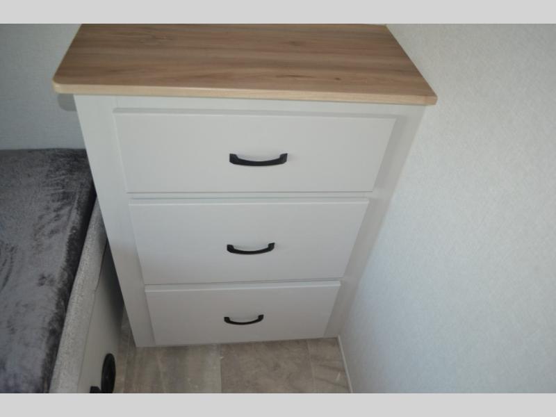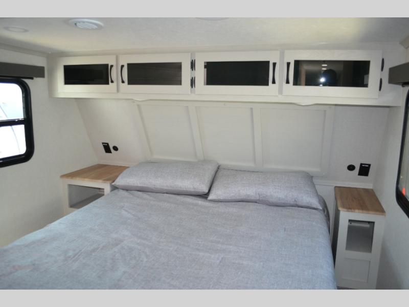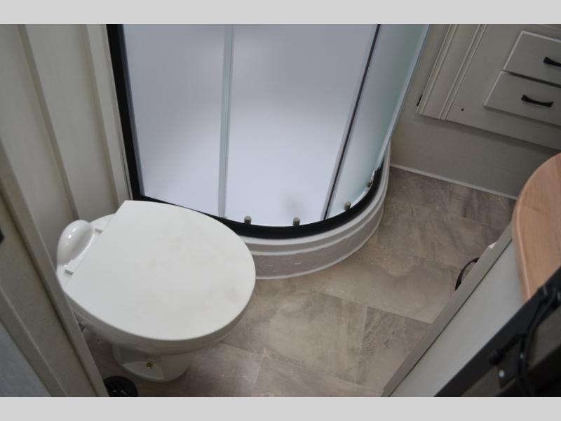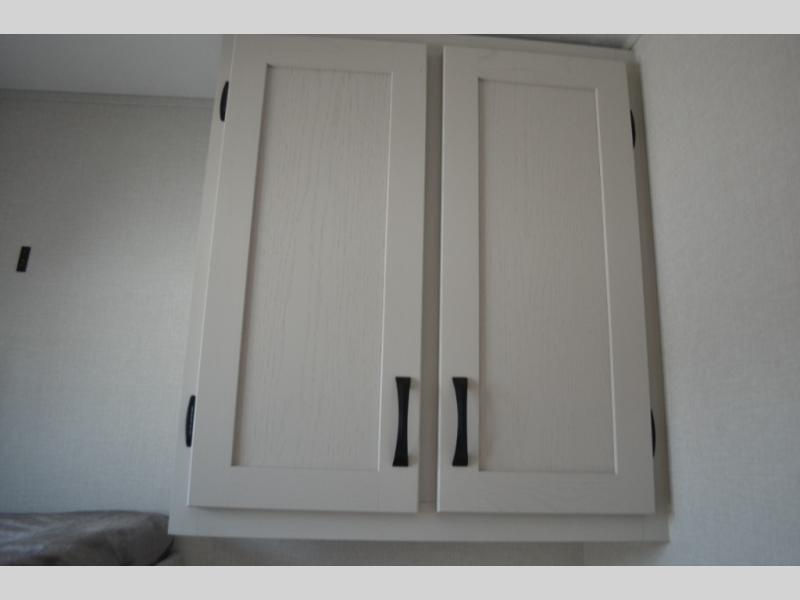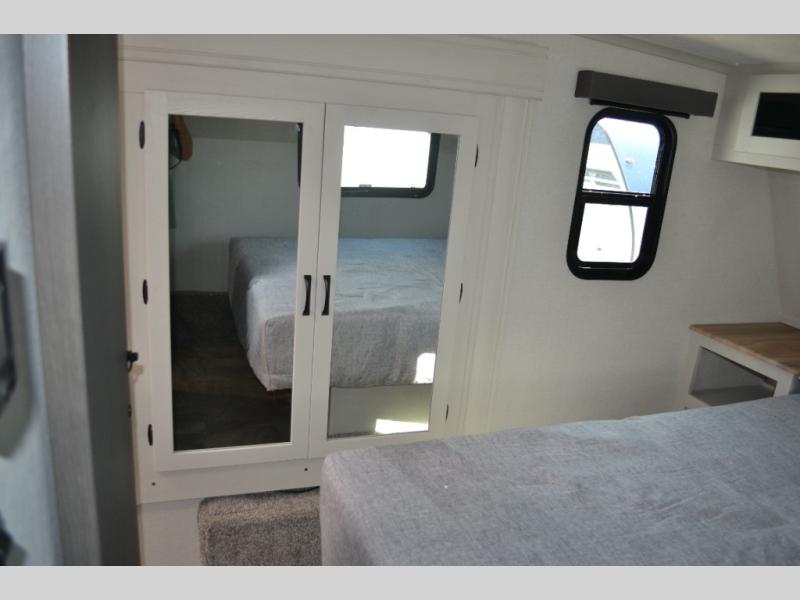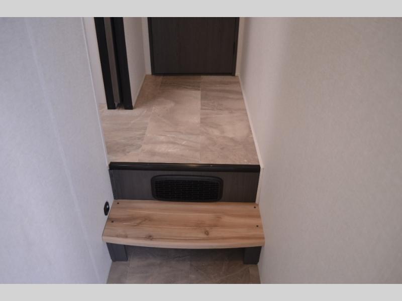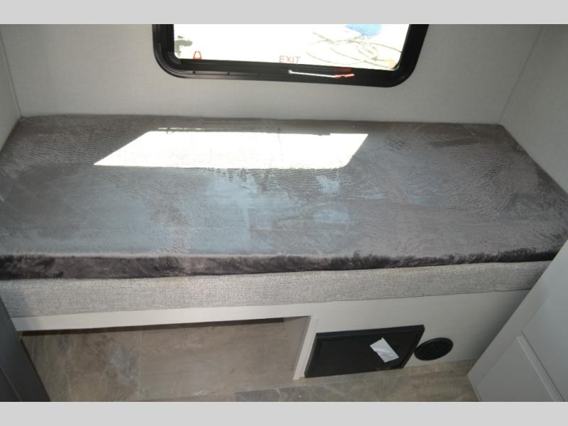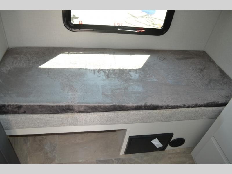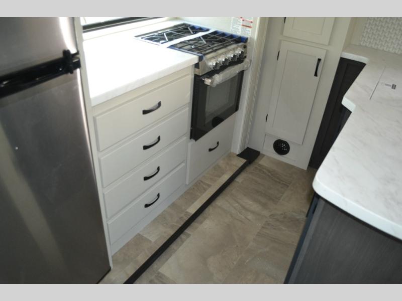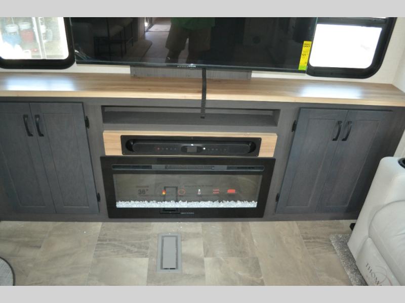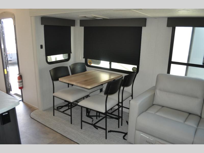 This fifth wheel is perfect for families or large groups since there is a front master bedroom and a middle bunkhouse! The front master suite not only has a queen bed to lay your head on at night and a wardrobe slide, but also an entrance into the dual entry bathroom. The middle bunkhouse has a 30" x 74" bunk bed and a flip-up bunk, shoe storage, and overhead cabinets to keep the clutter away. Grab some eggs from the 10 cu. ft. GE Stainless 12V refrigerator, fry them up on the three burner cooktop, and enjoy them at the free-spanning table. You can then read the morning newspaper on either the tri-fold hide-a-bed sofa and theater seating or watch the news with the rear entertainment center!