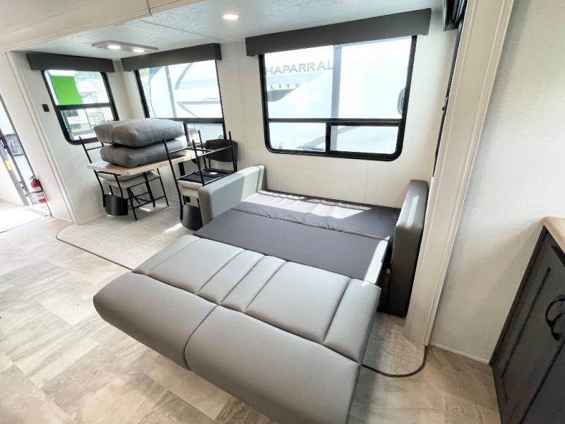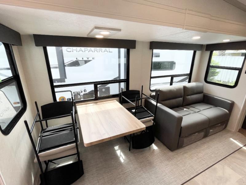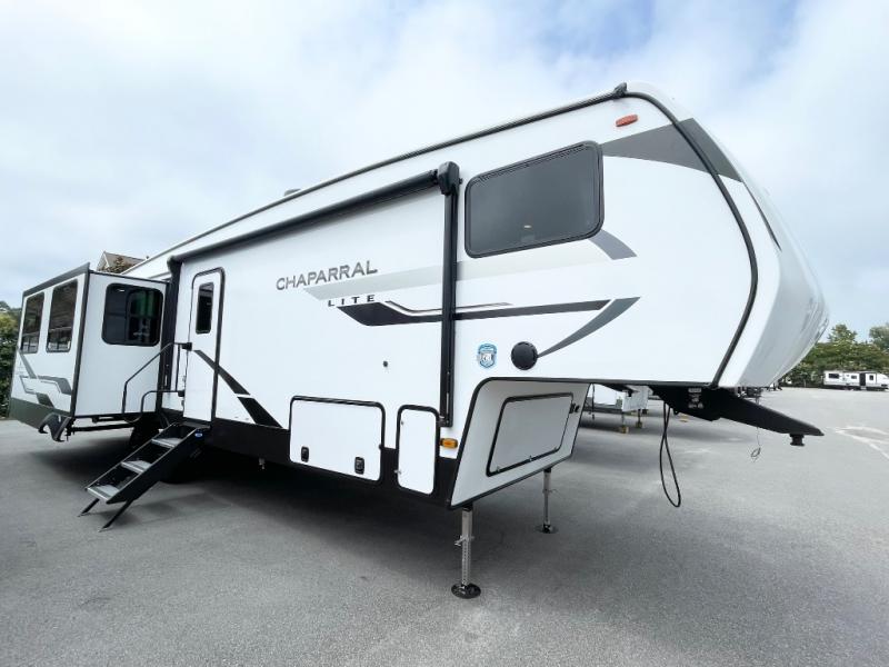 Comfort, convenience, and an easy haul is what you will find with each one of these Coachmen RV Chaparral Lite fifth wheels! Their Tri-Tex powder coated frame technology is up to 5X more weather resistant, and the dual-sided Azdel composite sidewall panels are ultra durable. The Road Armor suspension by Trail Air comes with heavy duty shackles and wet bolts so you can be sure it will hold up through every adventure, and you might want to add the exterior back-up and sideview camera prep for easy parking. You will feel right at home inside with slow rise blackout roller night shades, an upgraded Carbon and Walnut entertainment center, a modern high-rise kitchen faucet, and many more comforts! The exterior is just as inviting with its electric awning with LED lights, Solid Step entry steps, and pass-through storage for all your gear!