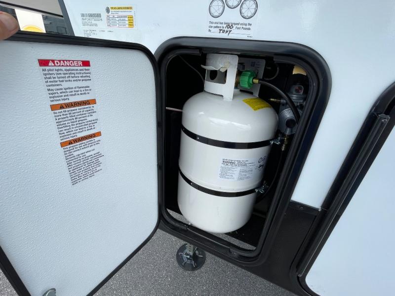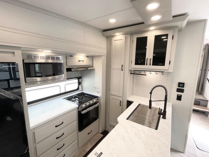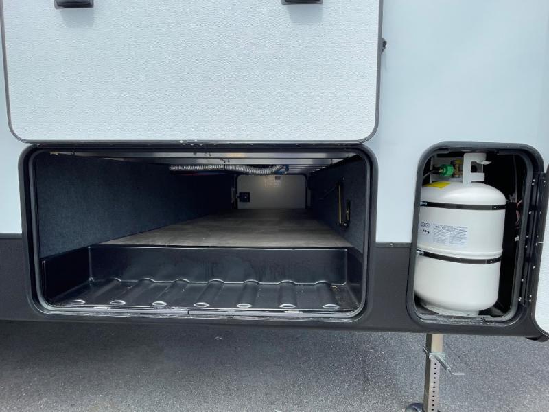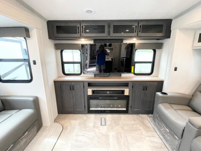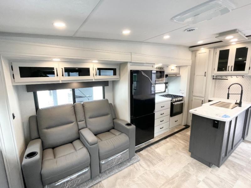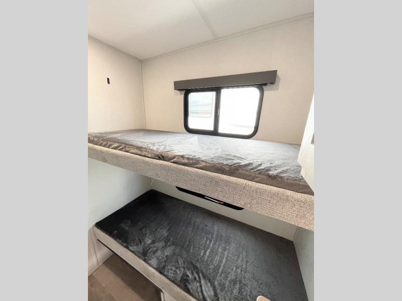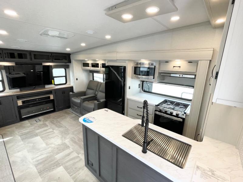 This fifth wheel is perfect for families or large groups since there is a front master bedroom and a middle bunkhouse! The front master suite not only has a queen bed to lay your head on at night and a wardrobe slide, but also an entrance into the dual entry bathroom. The middle bunkhouse has a 30" x 74" bunk bed and a flip-up bunk, shoe storage, and overhead cabinets to keep the clutter away. Grab some eggs from the 10 cu. ft. GE Stainless 12V refrigerator, fry them up on the three burner cooktop, and enjoy them at the free-spanning table. You can then read the morning newspaper on either the tri-fold hide-a-bed sofa and theater seating or watch the news with the rear entertainment center!