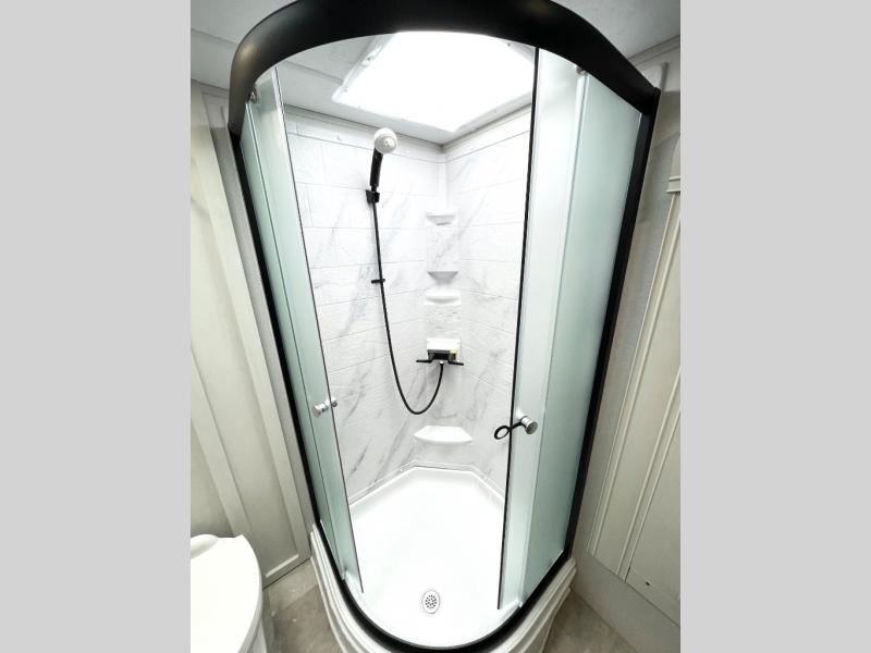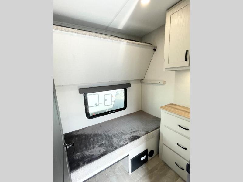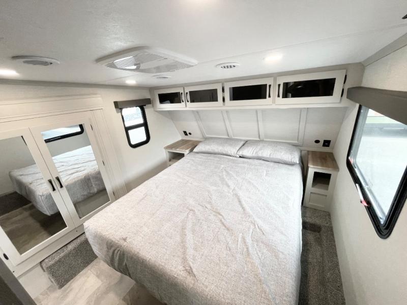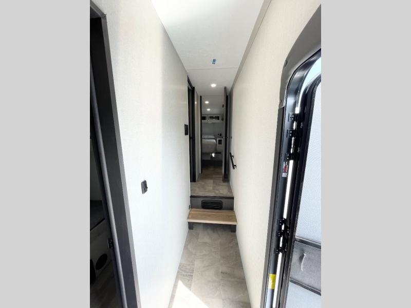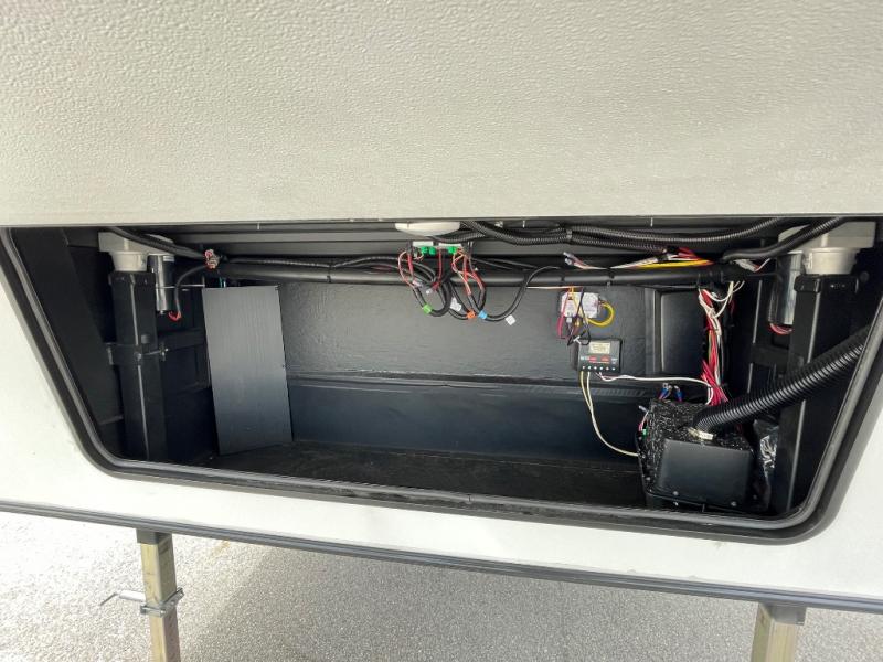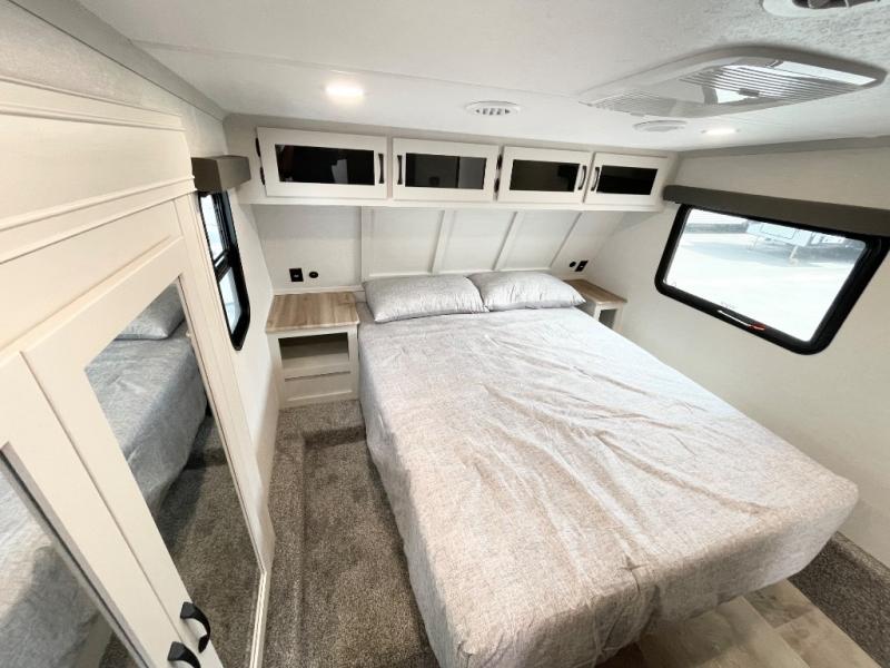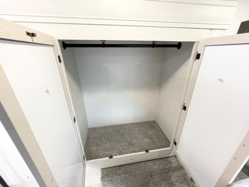 This fifth wheel is perfect for families or large groups since there is a front master bedroom and a middle bunkhouse! The front master suite not only has a queen bed to lay your head on at night and a wardrobe slide, but also an entrance into the dual entry bathroom. The middle bunkhouse has a 30" x 74" bunk bed and a flip-up bunk, shoe storage, and overhead cabinets to keep the clutter away. Grab some eggs from the 10 cu. ft. GE Stainless 12V refrigerator, fry them up on the three burner cooktop, and enjoy them at the free-spanning table. You can then read the morning newspaper on either the tri-fold hide-a-bed sofa and theater seating or watch the news with the rear entertainment center!