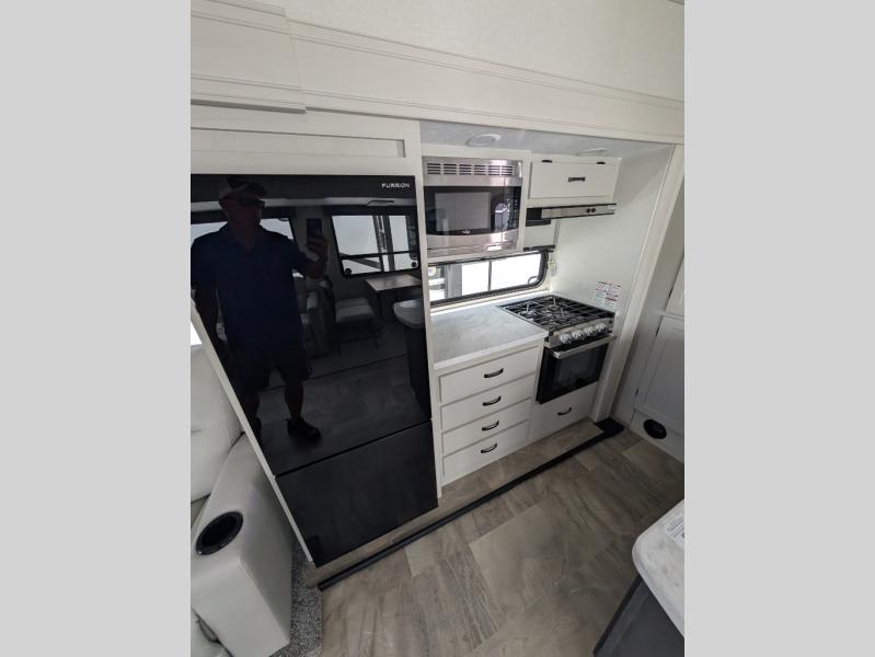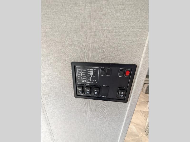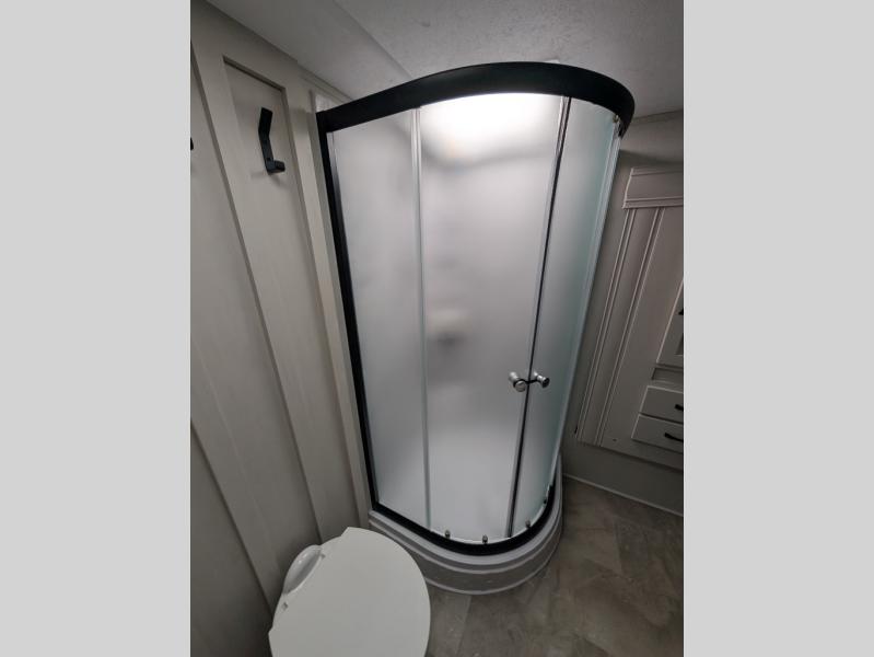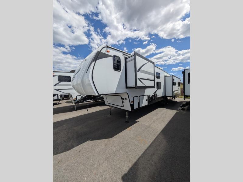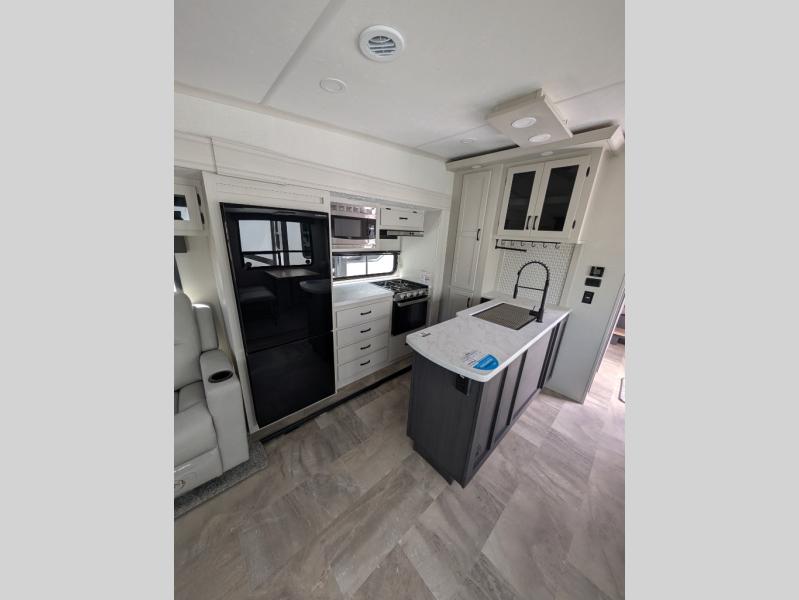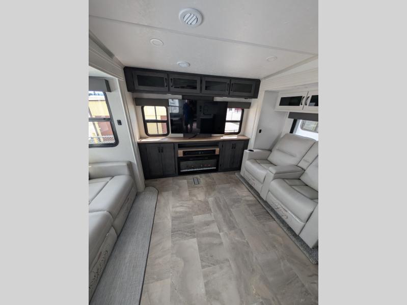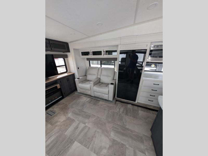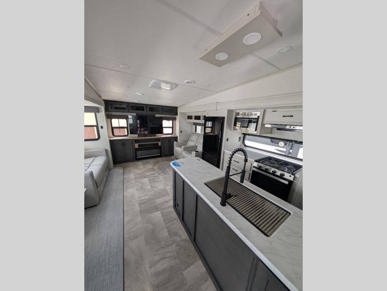 This fifth wheel is perfect for families or large groups since there is a front master bedroom and a middle bunkhouse! The front master suite not only has a queen bed to lay your head on at night and a wardrobe slide, but also an entrance into the dual entry bathroom. The middle bunkhouse has a 30" x 74" bunk bed and a flip-up bunk, shoe storage, and overhead cabinets to keep the clutter away. Grab some eggs from the 10 cu. ft. GE Stainless 12V refrigerator, fry them up on the three burner cooktop, and enjoy them at the free-spanning table. You can then read the morning newspaper on either the tri-fold hide-a-bed sofa and theater seating or watch the news with the rear entertainment center!