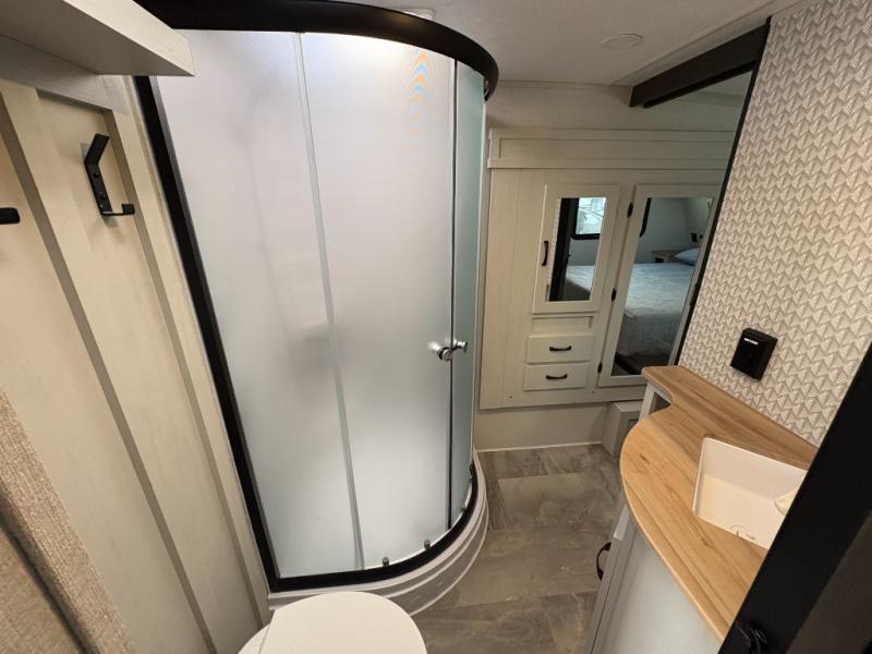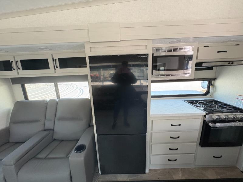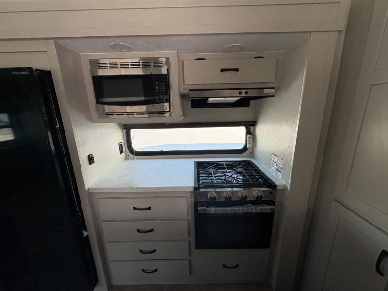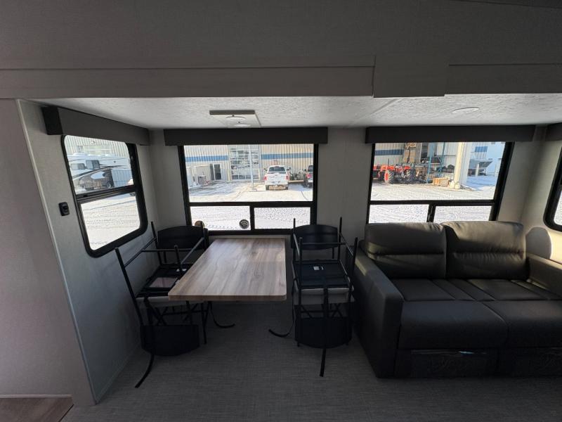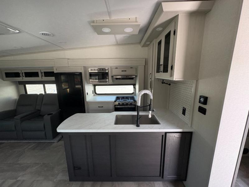 This fifth wheel is perfect for families or large groups since there is a front master bedroom and a middle bunkhouse! The front master suite not only has a queen bed to lay your head on at night and a wardrobe slide, but also an entrance into the dual entry bathroom. The middle bunkhouse has a 30" x 74" bunk bed and a flip-up bunk, shoe storage, and overhead cabinets to keep the clutter away. Grab some eggs from the 10 cu. ft. GE Dual Swing 12V refrigerator, fry them up on the three burner cooktop, and enjoy them at the free-spanning table. You can then read the morning newspaper on either the tri-fold hide-a-bed sofa and theater seating or watch the news with the rear entertainment center!