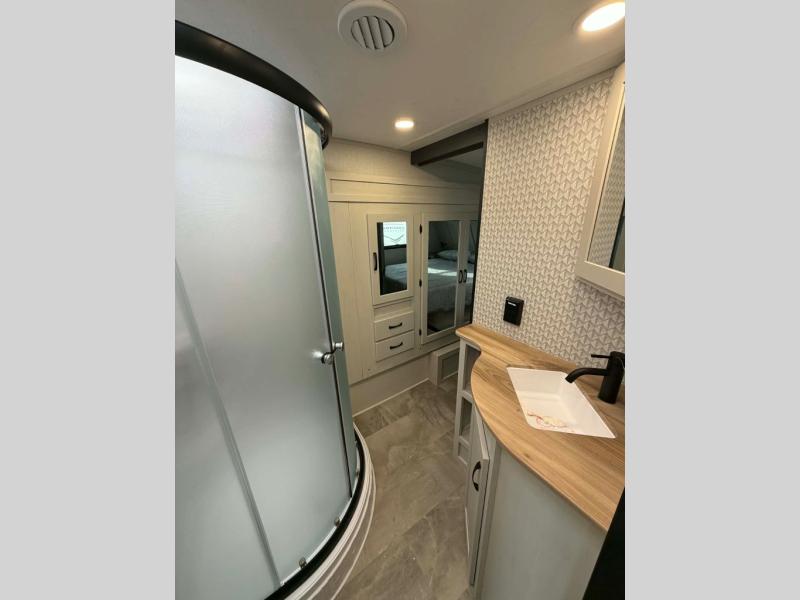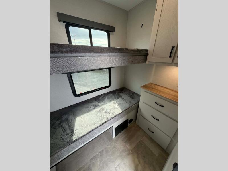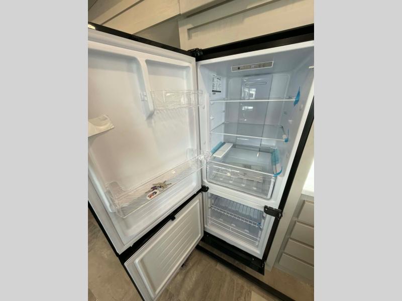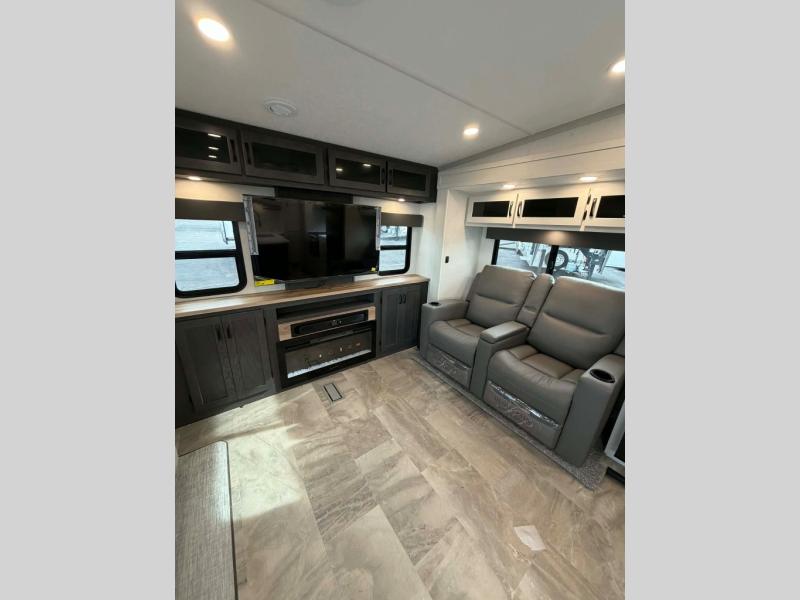 This fifth wheel is perfect for families or large groups since there is a front master bedroom and a middle bunkhouse! The front master suite not only has a queen bed to lay your head on at night and a wardrobe slide, but also an entrance into the dual entry bathroom. The middle bunkhouse has a 30" x 74" bunk bed and a flip-up bunk, shoe storage, and overhead cabinets to keep the clutter away. Grab some eggs from the 10 cu. ft. GE Dual Swing 12V refrigerator, fry them up on the three burner cooktop, and enjoy them at the free-spanning table. You can then read the morning newspaper on either the tri-fold hide-a-bed sofa and theater seating or watch the news with the rear entertainment center!