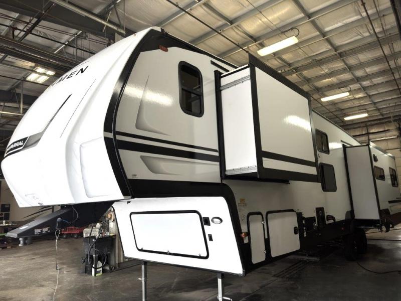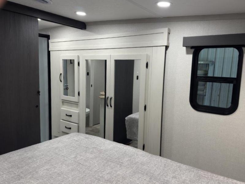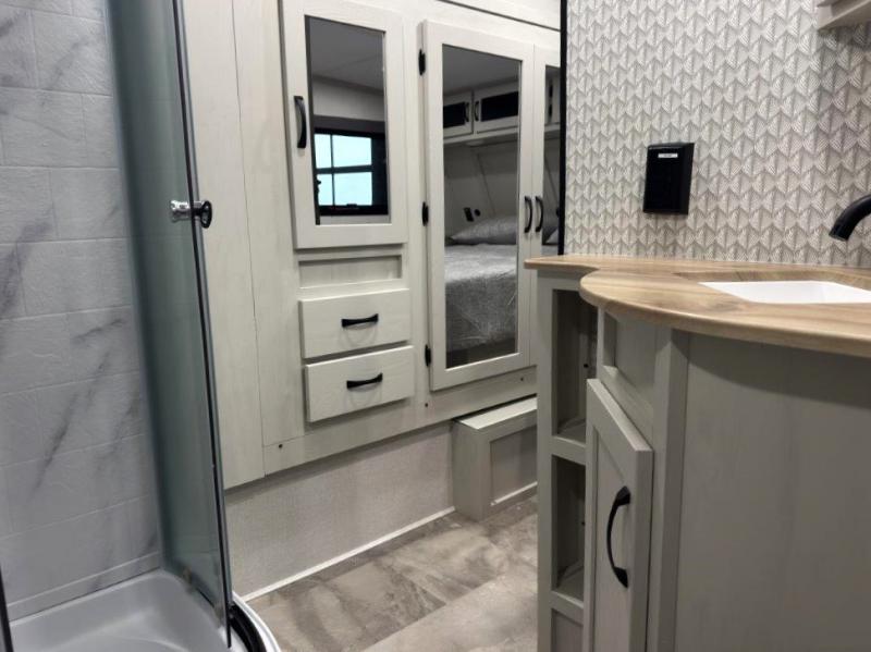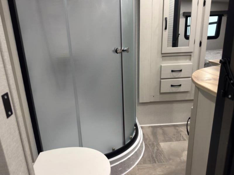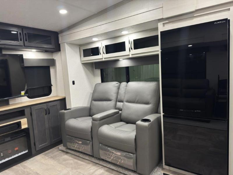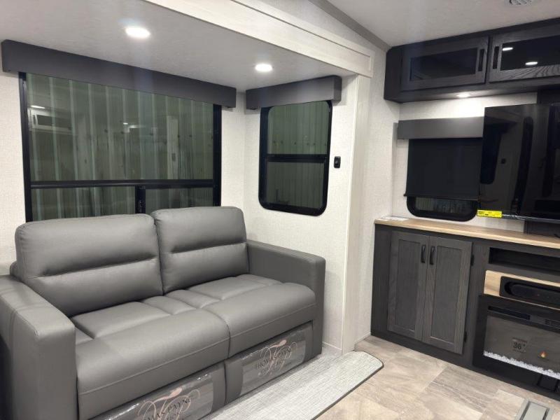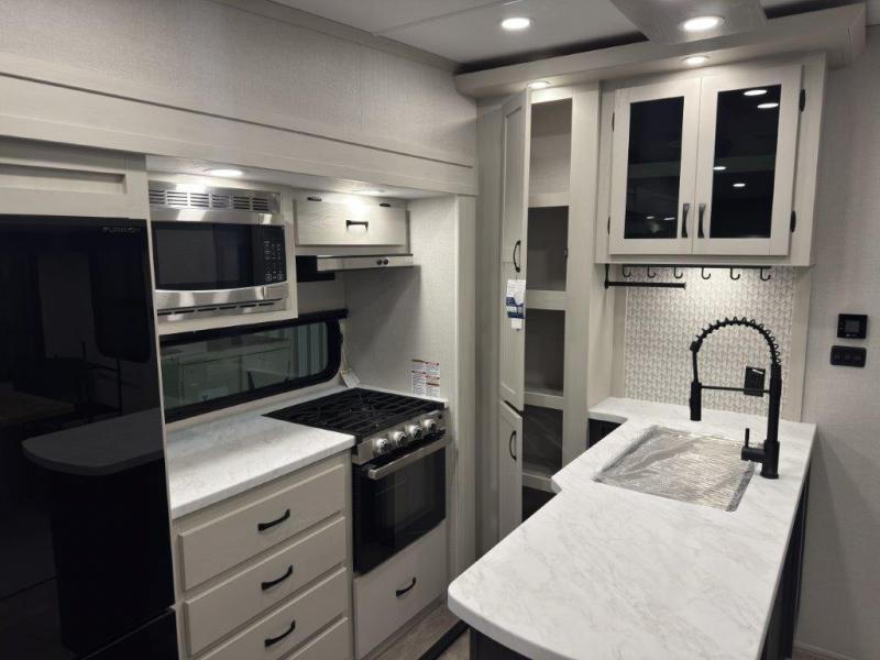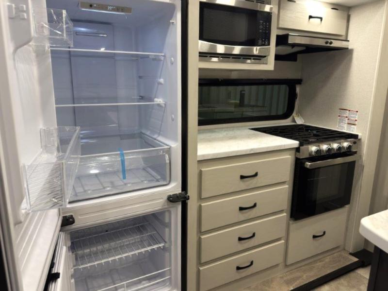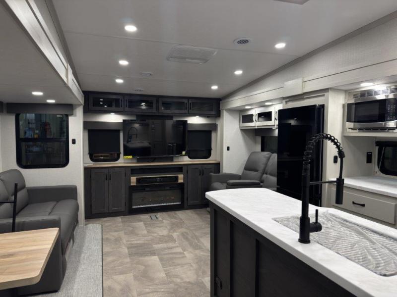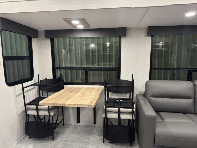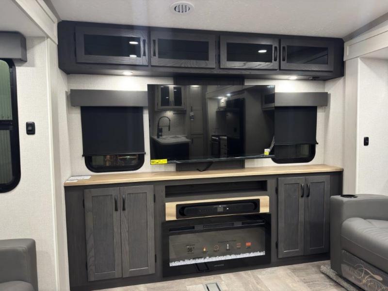 This fifth wheel is perfect for families or large groups since there is a front master bedroom and a middle bunkhouse! The front master suite not only has a queen bed to lay your head on at night and a wardrobe slide, but also an entrance into the dual entry bathroom. The middle bunkhouse has a 30" x 74" bunk bed and a flip-up bunk, shoe storage, and overhead cabinets to keep the clutter away. Grab some eggs from the 10 cu. ft. GE Dual Swing 12V refrigerator, fry them up on the three burner cooktop, and enjoy them at the free-spanning table. You can then read the morning newspaper on either the tri-fold hide-a-bed sofa and theater seating or watch the news with the rear entertainment center!