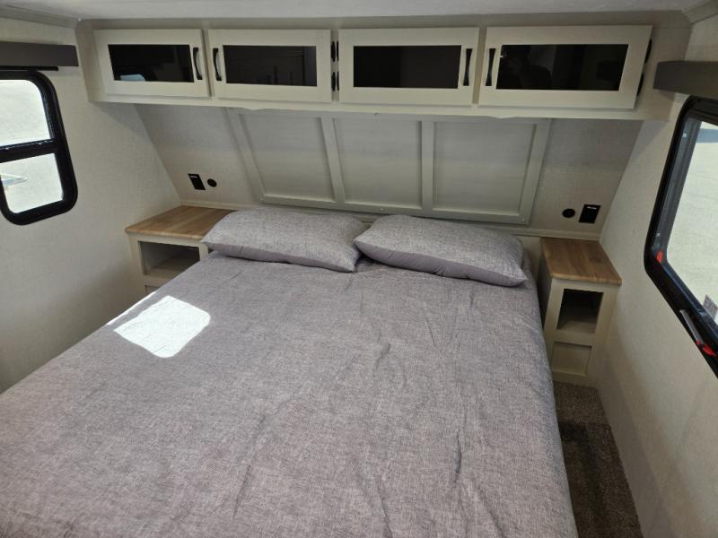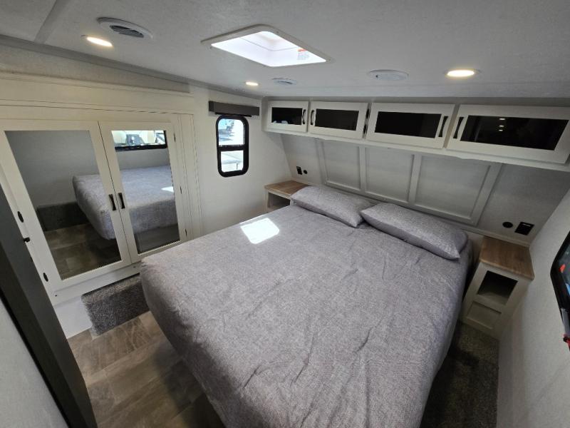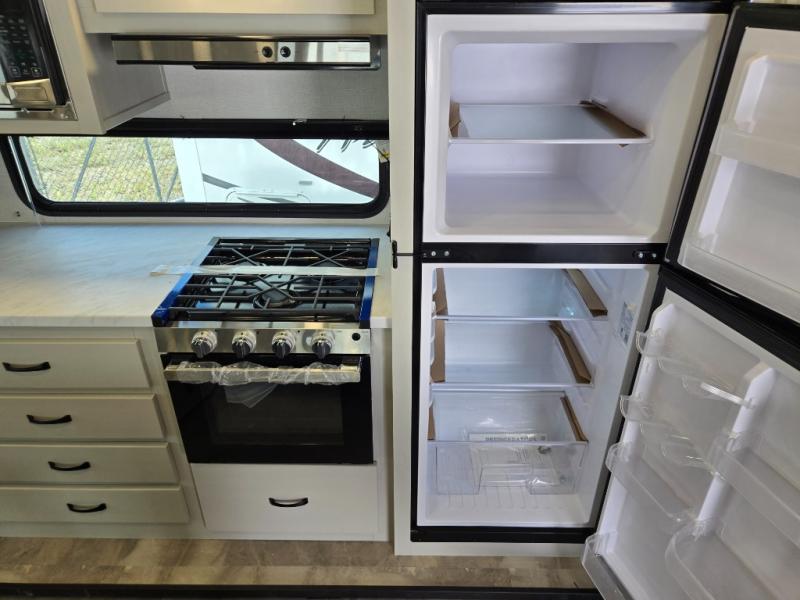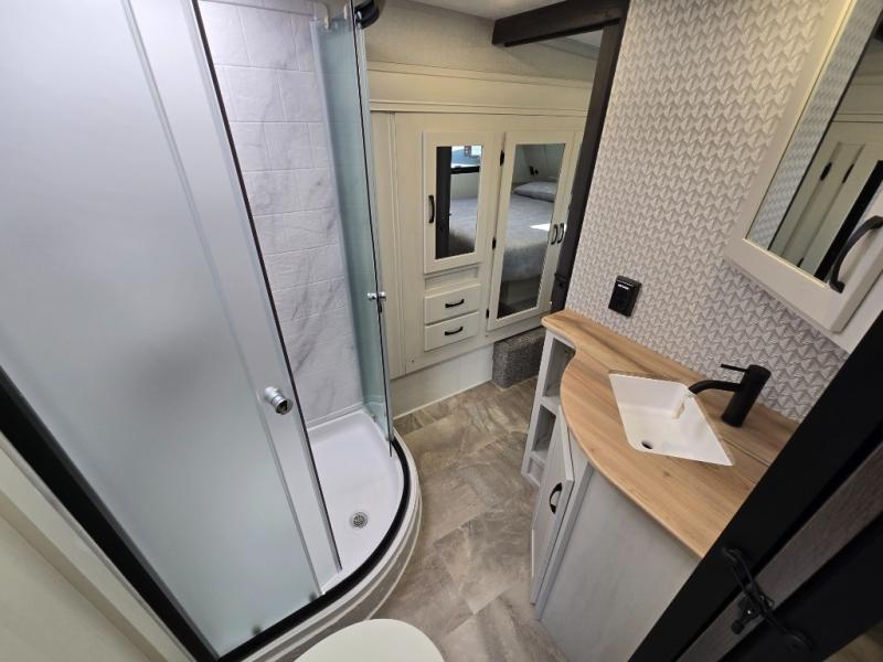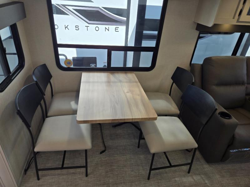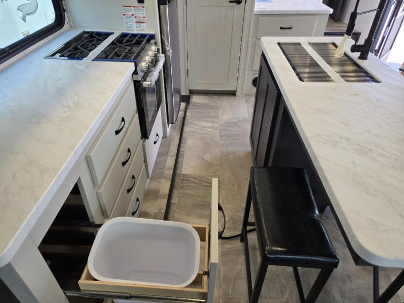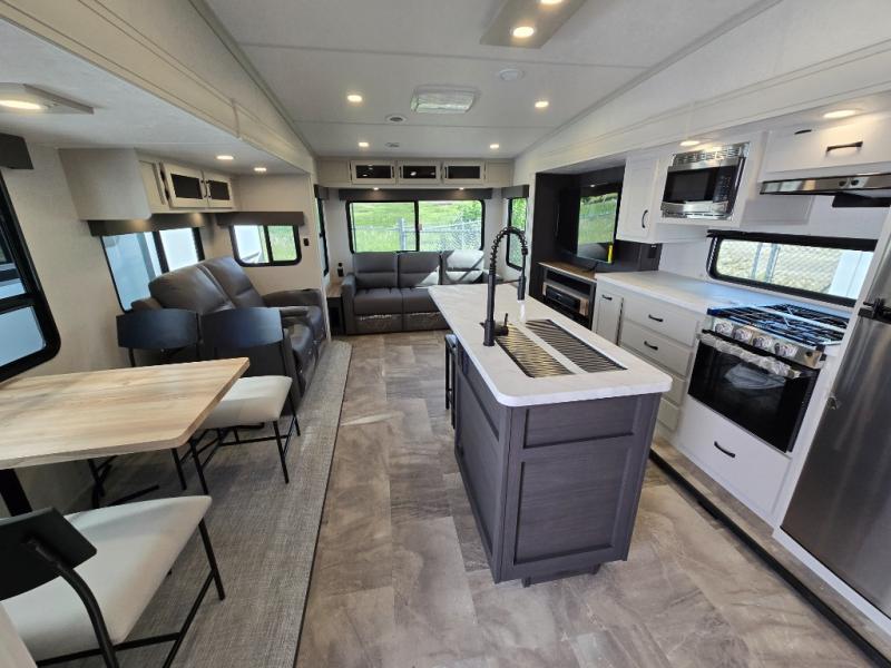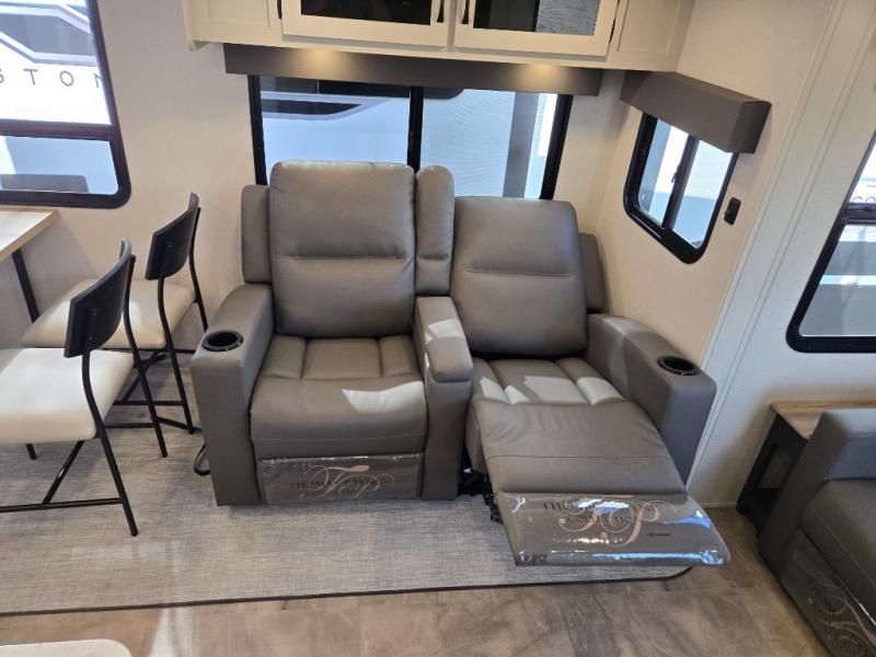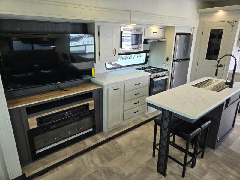 Get ready for a luxurious getaway in this fifth wheel! The rear living area is the perfect place to wind down your nights by relaxing on either the 78" tri-fold hide-a-bed sofa or the theater seating across from the entertainment center. You could even play a few card games at the free-spanning table while enjoying snacks that were stored in the pantry. The kitchen island comes with two bar stools so you can have two helpers get dinner ready while you're cooking on the three burner cooktop. The dual entry bathroom is easy for everyone to access and has a radius shower with glass doors to freshen up in, plus it leads directly into the front master suite where you will find a queen bed to lay your head on at night and a wardrobe/linen slide to keep your clothes looking their best!