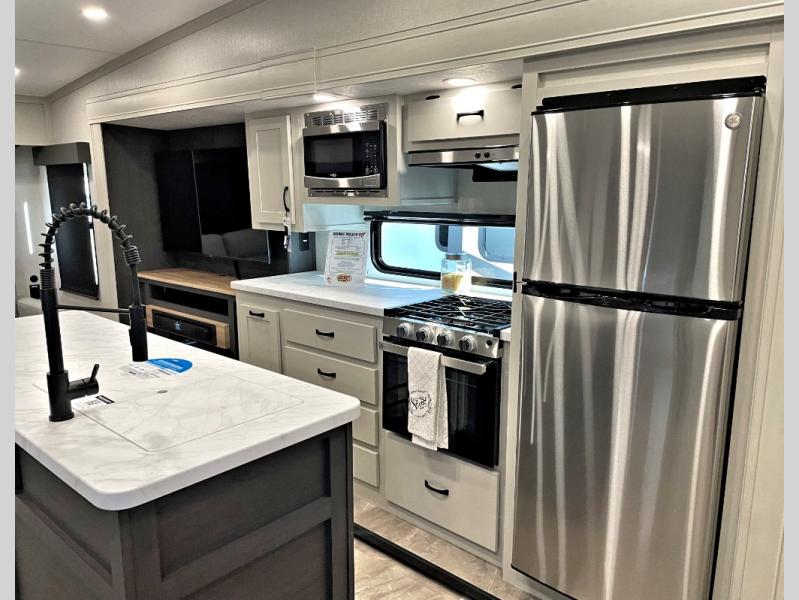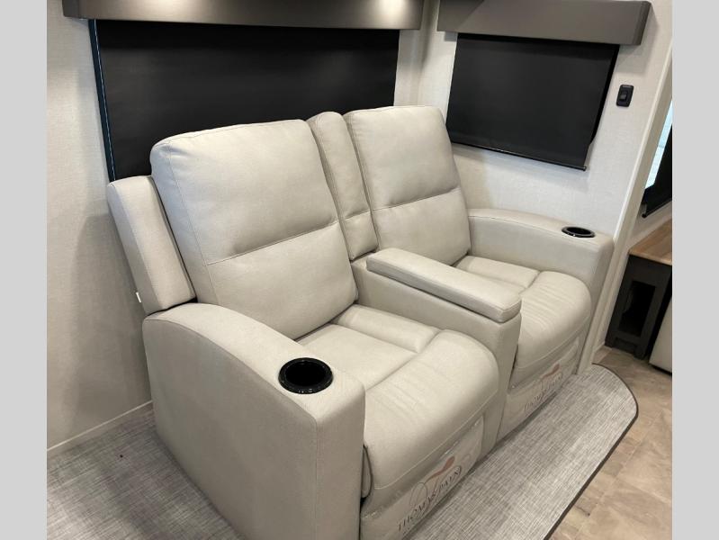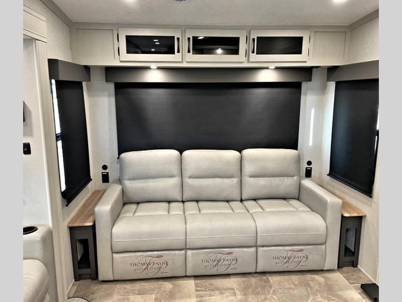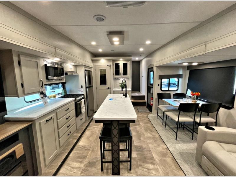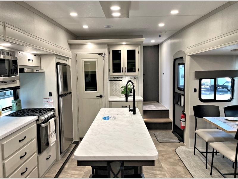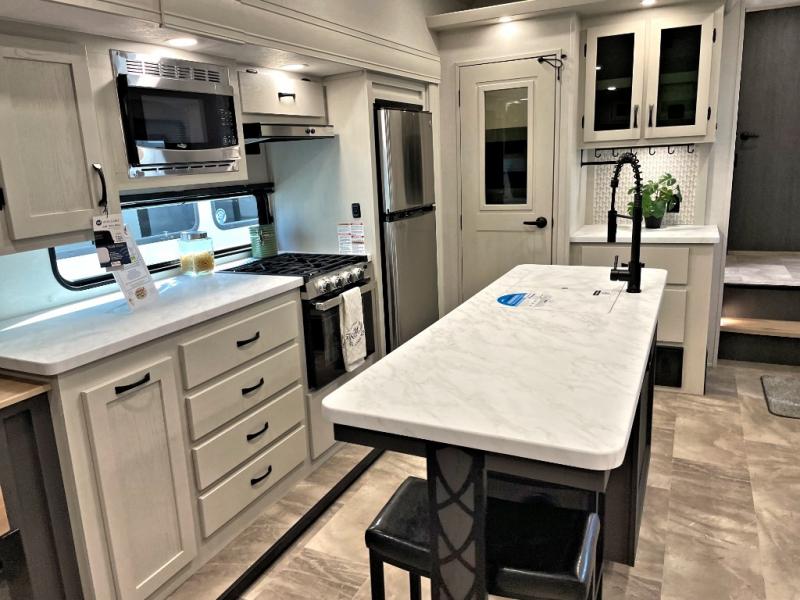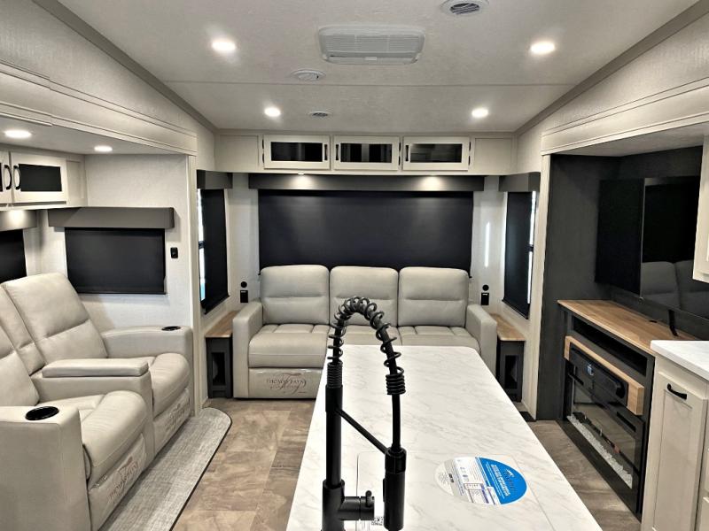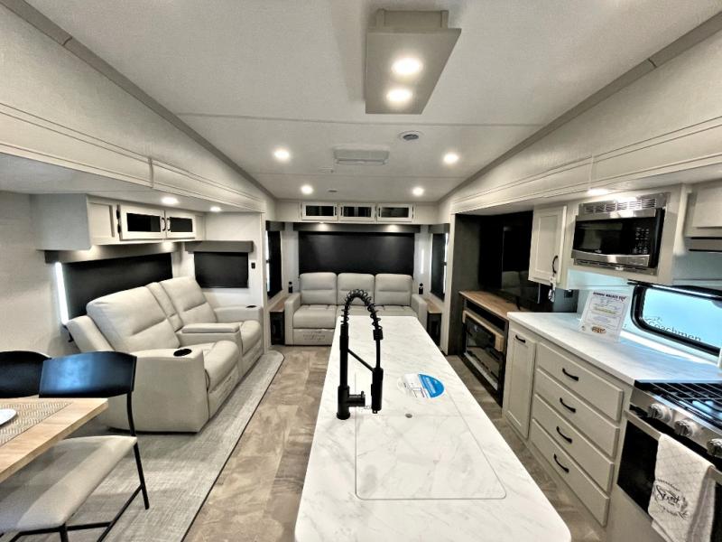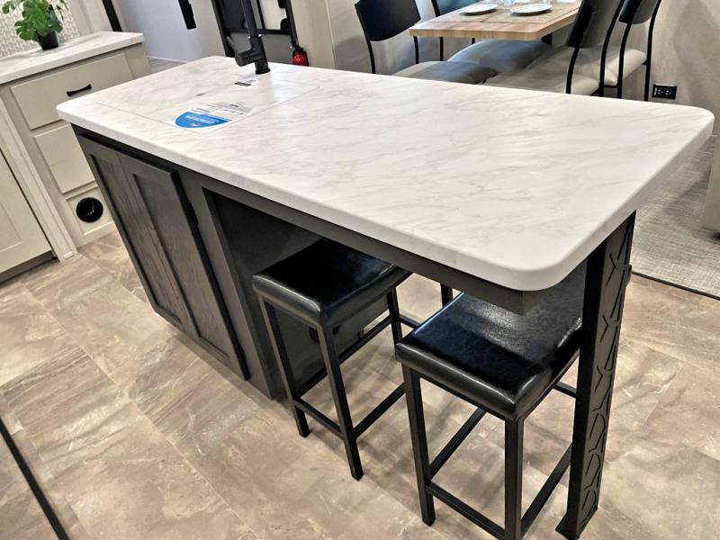 Get ready for a luxurious getaway in this fifth wheel! The rear living area is the perfect place to wind down your nights by relaxing on either the 78" tri-fold hide-a-bed sofa or the theater seating across from the entertainment center. You could even play a few card games at the free-spanning table while enjoying snacks that were stored in the pantry. The kitchen island comes with two bar stools so you can have two helpers get dinner ready while you're cooking on the three burner cooktop. The dual entry bathroom is easy for everyone to access and has a radius shower with glass doors to freshen up in, plus it leads directly into the front master suite where you will find a queen bed to lay your head on at night and a wardrobe/linen slide to keep your clothes looking their best!