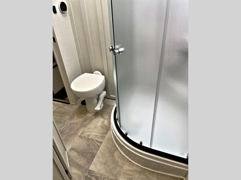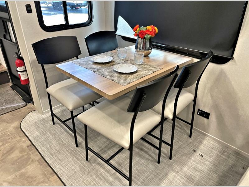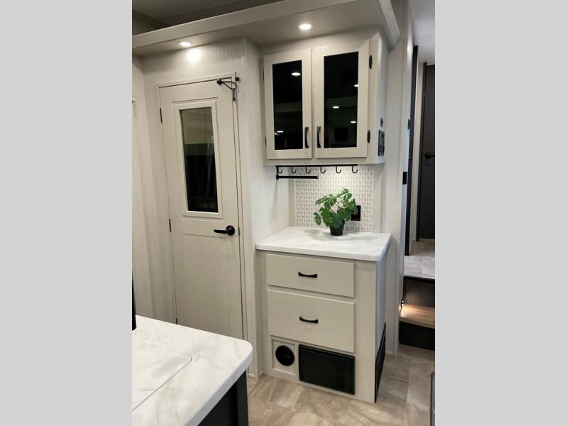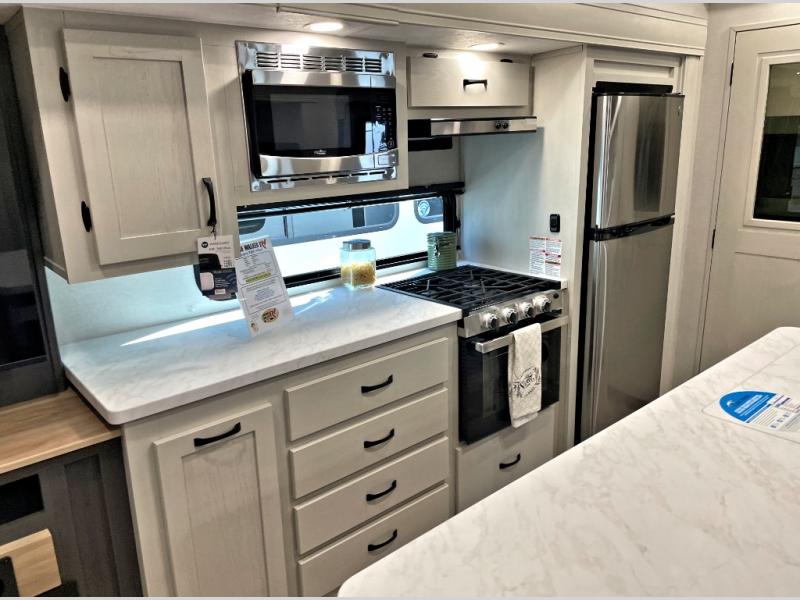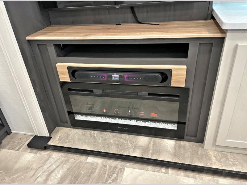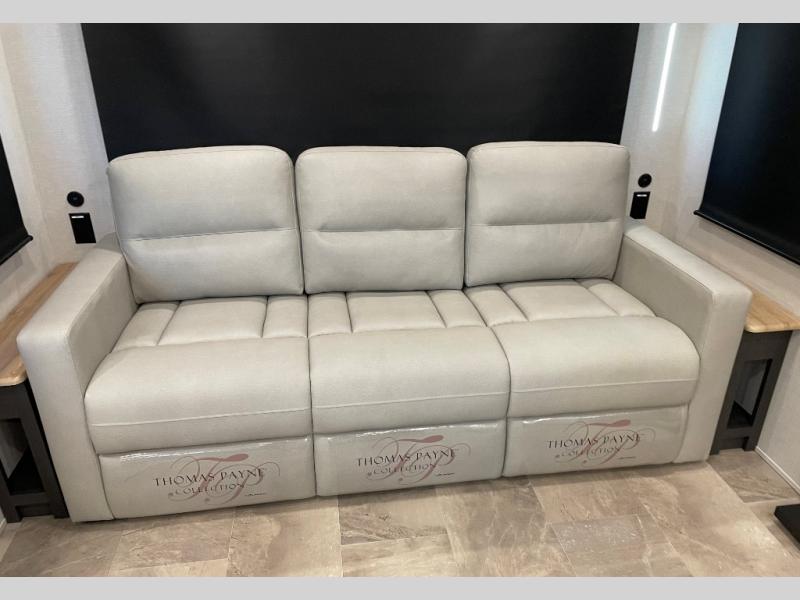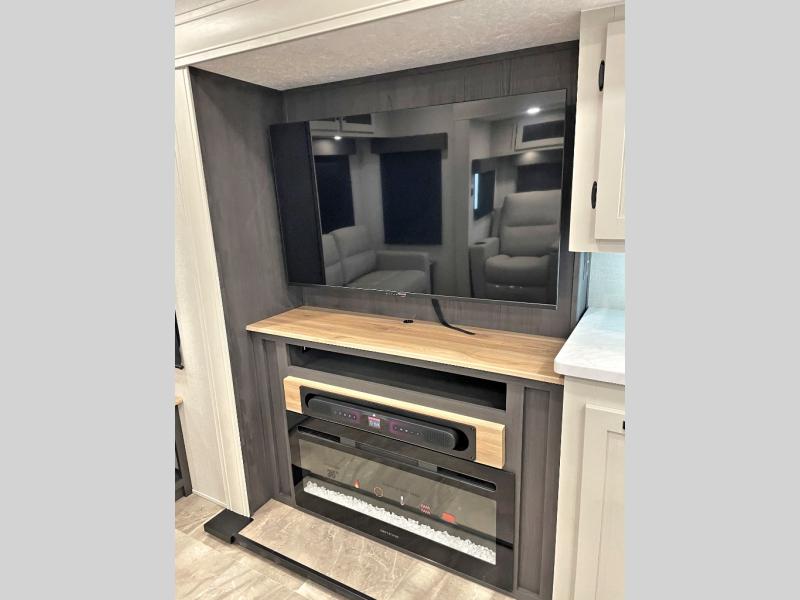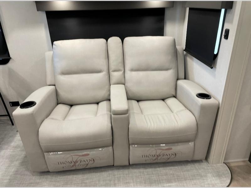 Get ready for a luxurious getaway in this fifth wheel! The rear living area is the perfect place to wind down your nights by relaxing on either the 78" tri-fold hide-a-bed sofa or the theater seating across from the entertainment center. You could even play a few card games at the free-spanning table while enjoying snacks that were stored in the pantry. The kitchen island comes with two bar stools so you can have two helpers get dinner ready while you're cooking on the three burner cooktop. The dual entry bathroom is easy for everyone to access and has a radius shower with glass doors to freshen up in, plus it leads directly into the front master suite where you will find a queen bed to lay your head on at night and a wardrobe/linen slide to keep your clothes looking their best!
