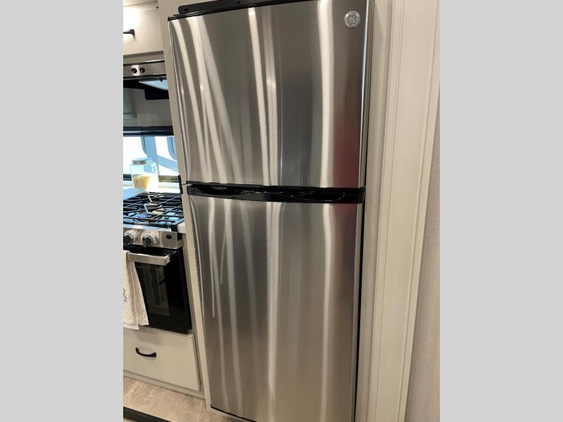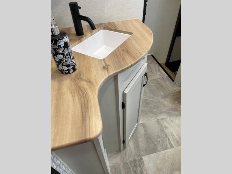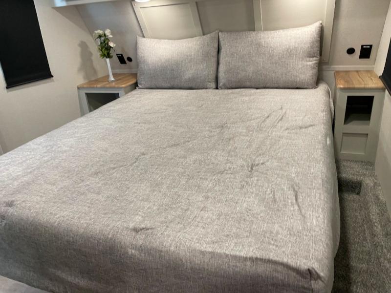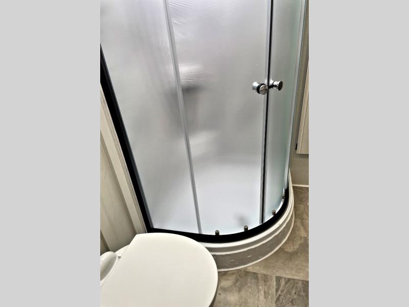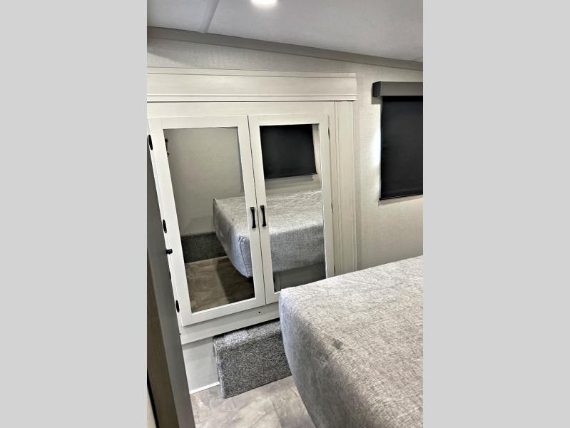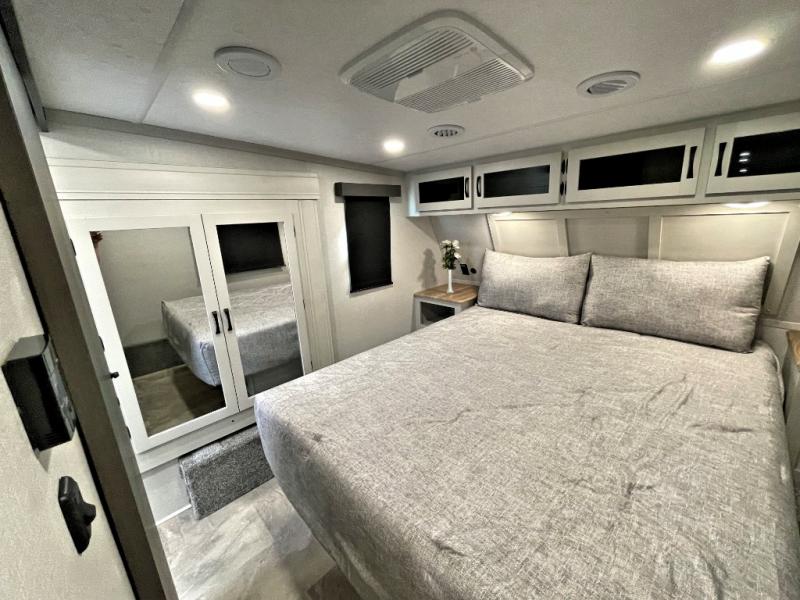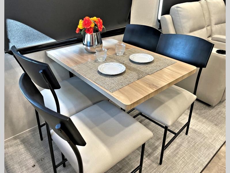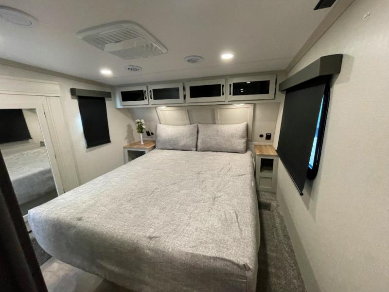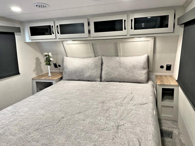 Get ready for a luxurious getaway in this fifth wheel! The rear living area is the perfect place to wind down your nights by relaxing on either the 78" tri-fold hide-a-bed sofa or the theater seating across from the entertainment center. You could even play a few card games at the free-spanning table while enjoying snacks that were stored in the pantry. The kitchen island comes with two bar stools so you can have two helpers get dinner ready while you're cooking on the three burner cooktop. The dual entry bathroom is easy for everyone to access and has a radius shower with glass doors to freshen up in, plus it leads directly into the front master suite where you will find a queen bed to lay your head on at night and a wardrobe/linen slide to keep your clothes looking their best!