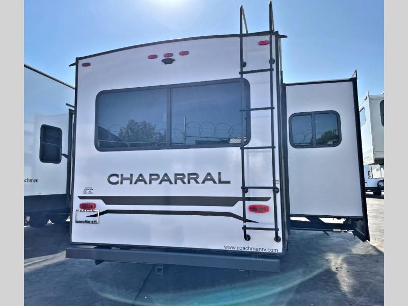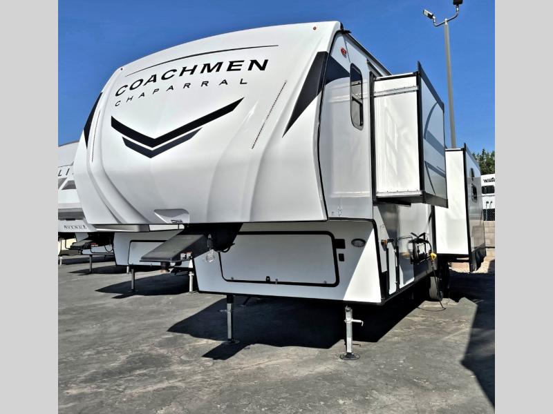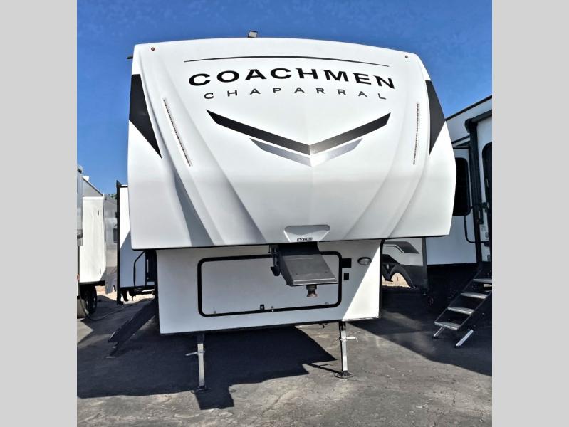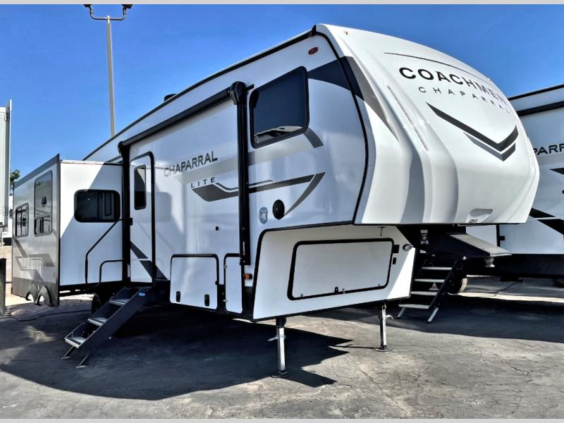 Comfort, convenience, and an easy haul is what you will find with each one of these Coachmen RV Chaparral Lite fifth wheels! Their Tri-Tex powder coated frame technology is up to 5X more weather resistant, and the dual-sided Azdel composite sidewall panels are ultra durable. The Road Armor suspension by Trail Air comes with heavy duty shackles and wet bolts so you can be sure it will hold up through every adventure, and you might want to add the exterior back-up and sideview camera prep for easy parking. You will feel right at home inside with slow rise blackout roller night shades, an upgraded Carbon and Walnut entertainment center, a modern high-rise kitchen faucet, and many more comforts! The exterior is just as inviting with its electric awning with LED lights, Solid Step entry steps, and pass-through storage for all your gear!