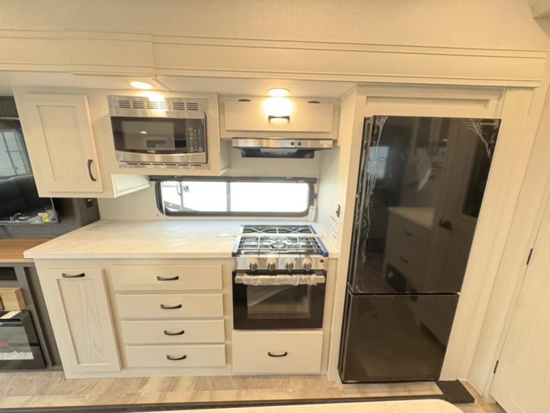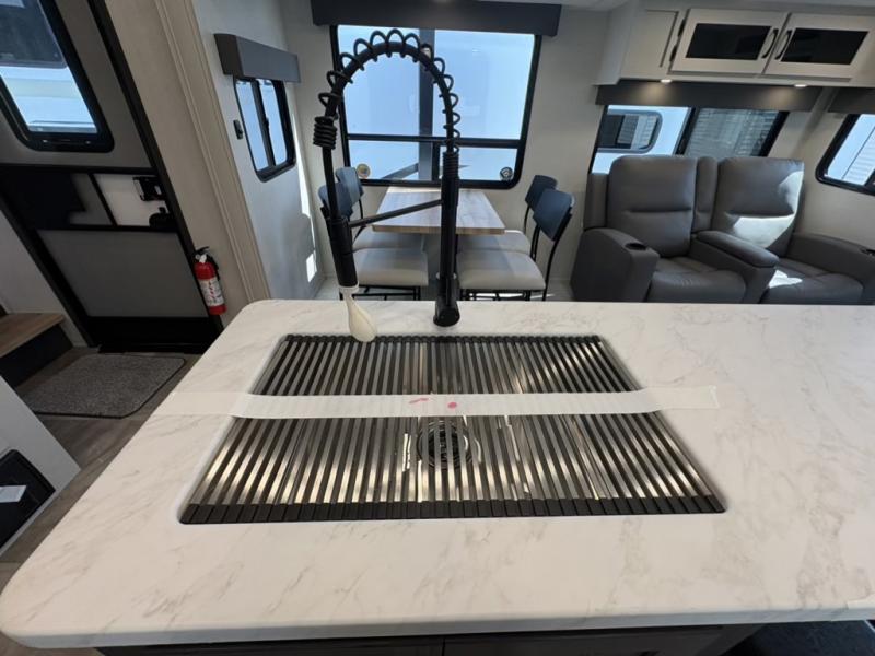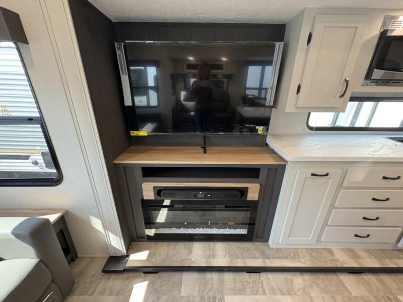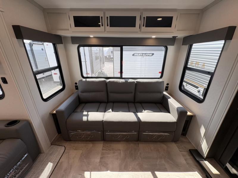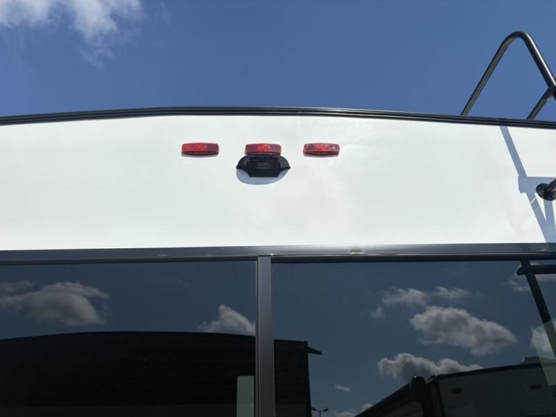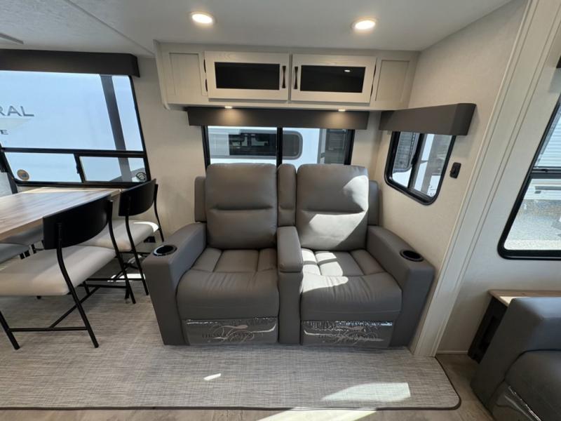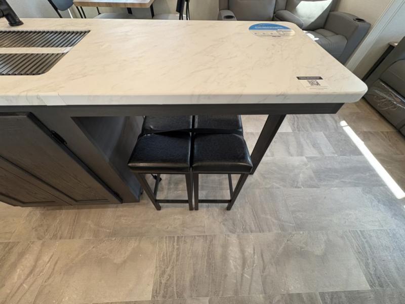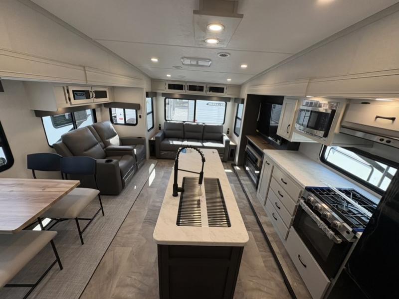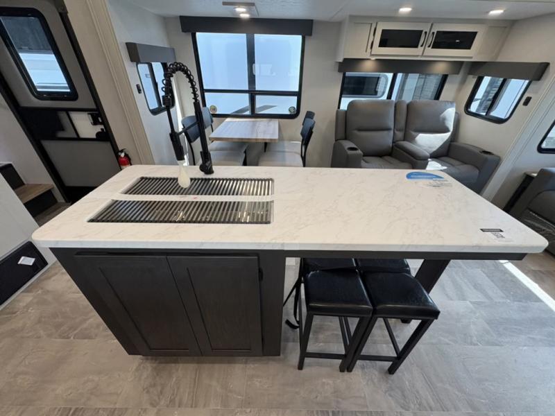 Get ready for a luxurious getaway in this fifth wheel! The rear living area is the perfect place to wind down your nights by relaxing on either the 78" tri-fold hide-a-bed sofa or the theater seating across from the entertainment center. You could even play a few card games at the free-spanning table while enjoying snacks that were stored in the pantry. The kitchen island comes with two bar stools so you can have two helpers get dinner ready while you're cooking on the three burner cooktop. The dual entry bathroom is easy for everyone to access and has a radius shower with glass doors to freshen up in, plus it leads directly into the front master suite where you will find a queen bed to lay your head on at night and a wardrobe/linen slide to keep your clothes looking their best!