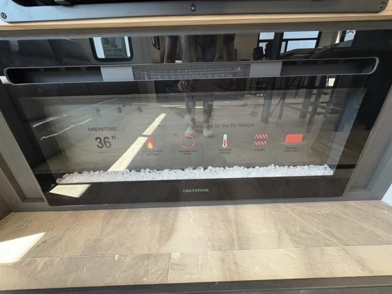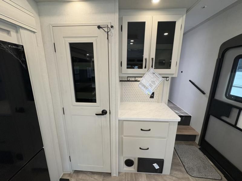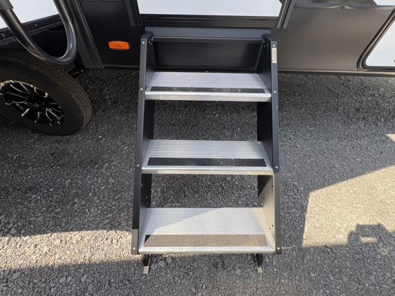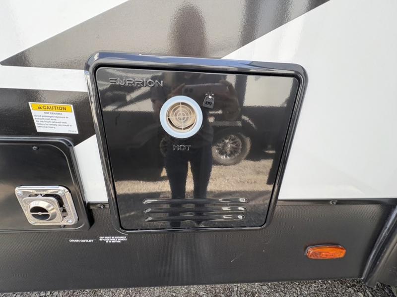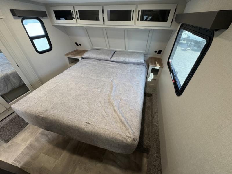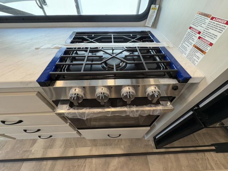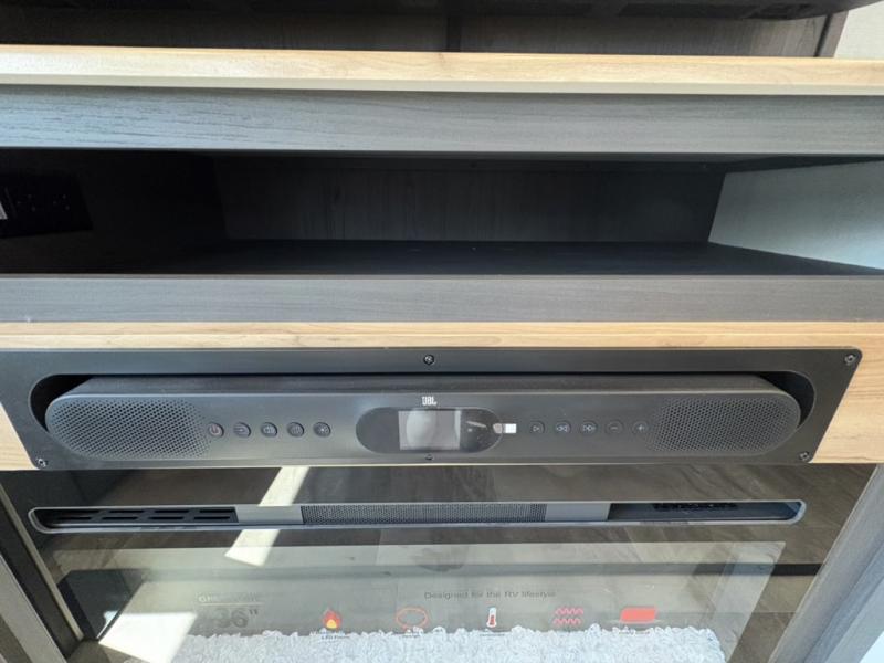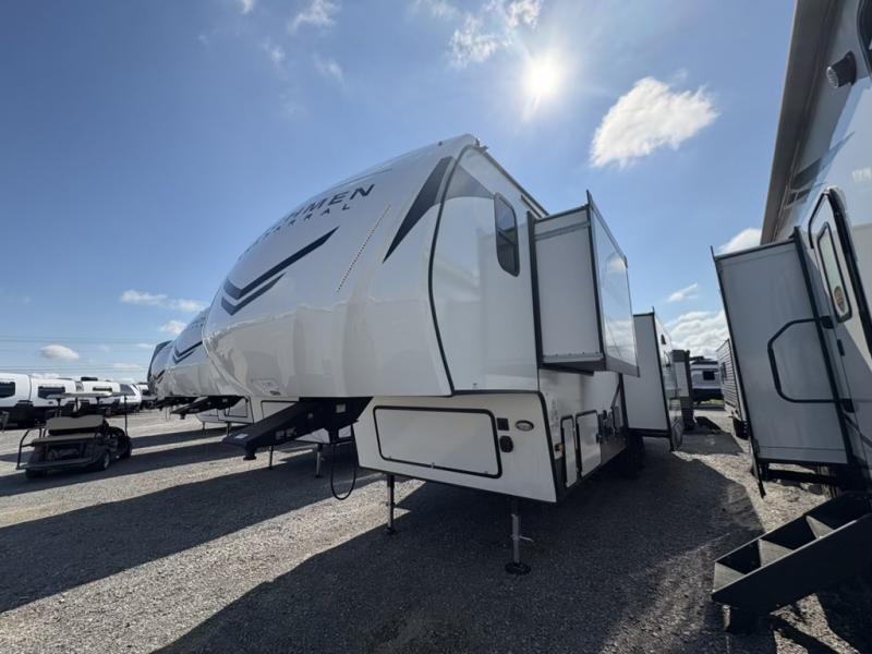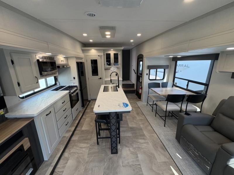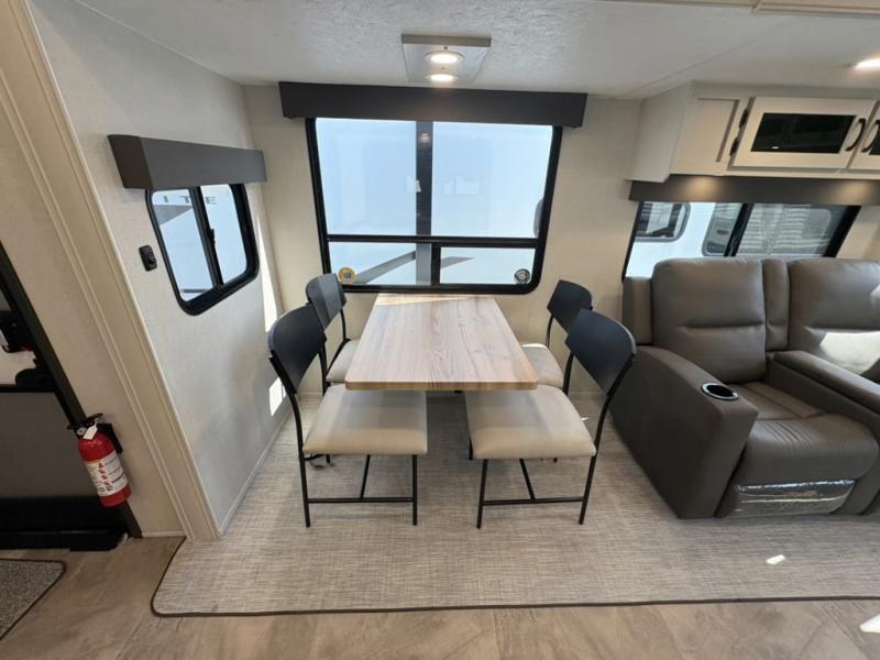 Get ready for a luxurious getaway in this fifth wheel! The rear living area is the perfect place to wind down your nights by relaxing on either the 78" tri-fold hide-a-bed sofa or the theater seating across from the entertainment center. You could even play a few card games at the free-spanning table while enjoying snacks that were stored in the pantry. The kitchen island comes with two bar stools so you can have two helpers get dinner ready while you're cooking on the three burner cooktop. The dual entry bathroom is easy for everyone to access and has a radius shower with glass doors to freshen up in, plus it leads directly into the front master suite where you will find a queen bed to lay your head on at night and a wardrobe/linen slide to keep your clothes looking their best!