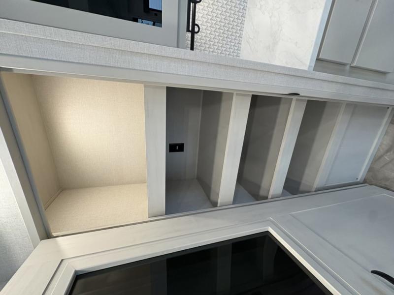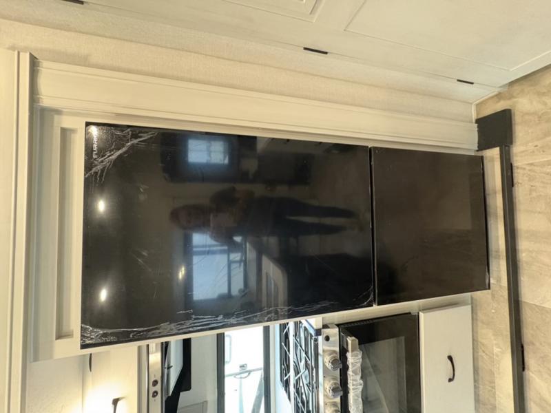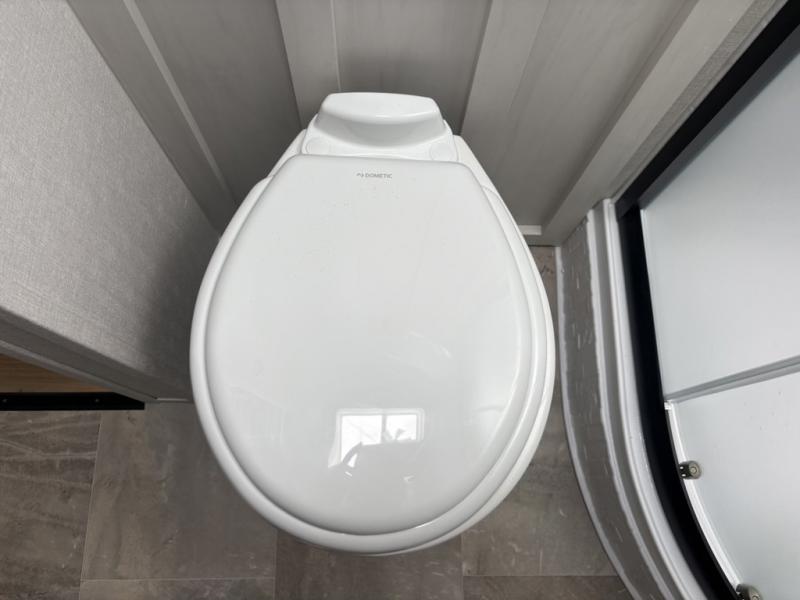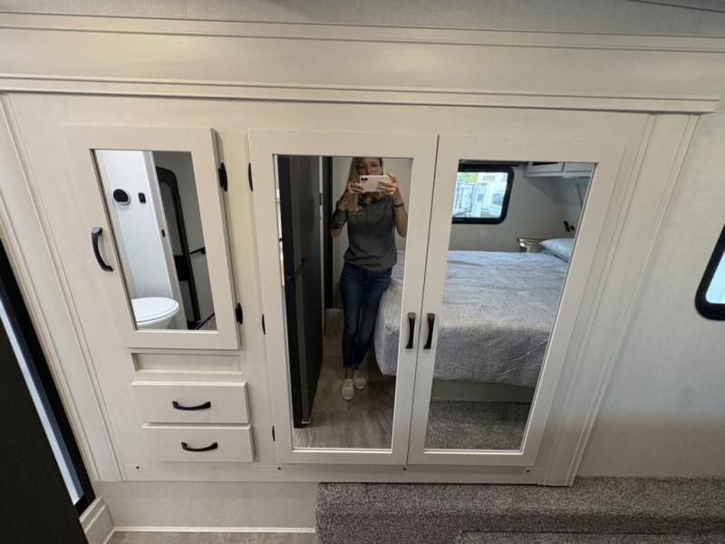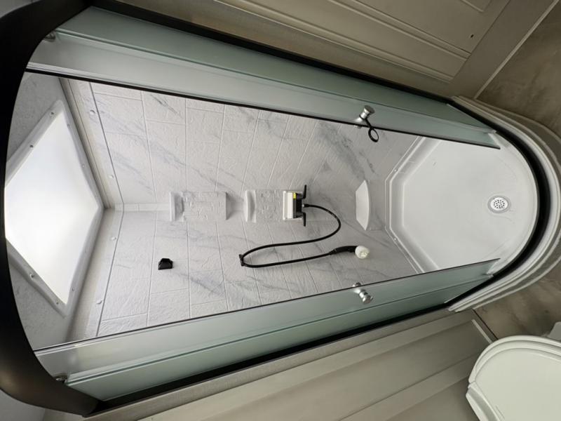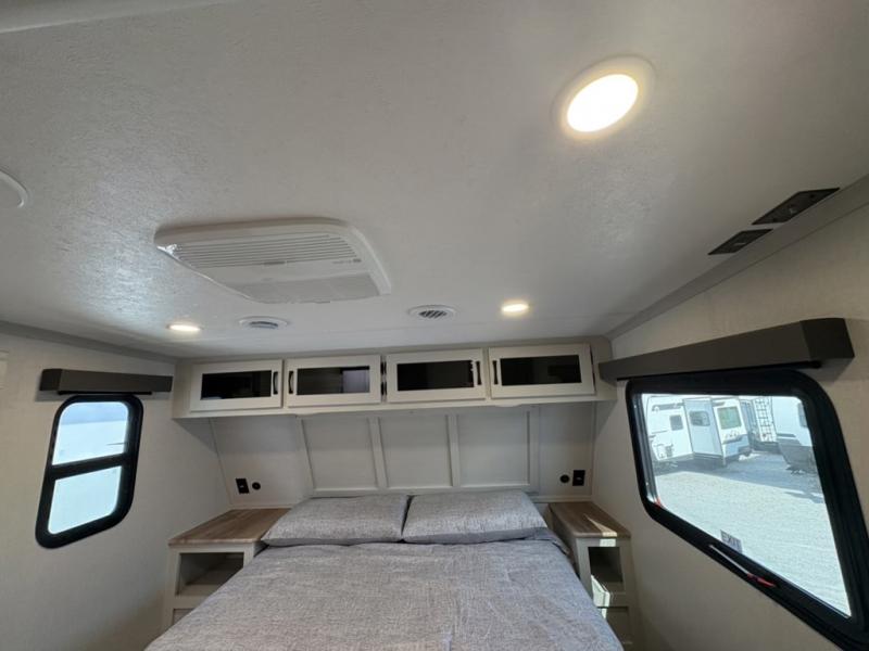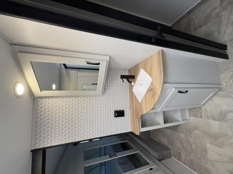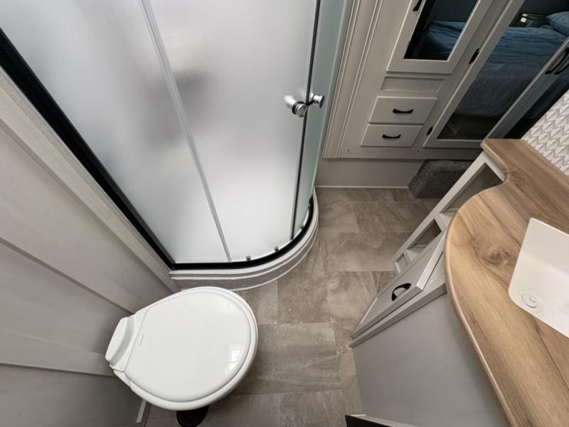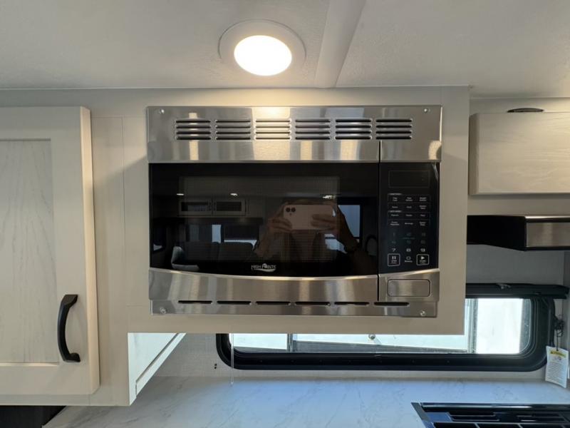 Get ready for a luxurious getaway in this fifth wheel! The rear living area is the perfect place to wind down your nights by relaxing on either the 78" tri-fold hide-a-bed sofa or the theater seating across from the entertainment center. You could even play a few card games at the free-spanning table while enjoying snacks that were stored in the pantry. The kitchen island comes with two bar stools so you can have two helpers get dinner ready while you're cooking on the three burner cooktop. The dual entry bathroom is easy for everyone to access and has a radius shower with glass doors to freshen up in, plus it leads directly into the front master suite where you will find a queen bed to lay your head on at night and a wardrobe/linen slide to keep your clothes looking their best!