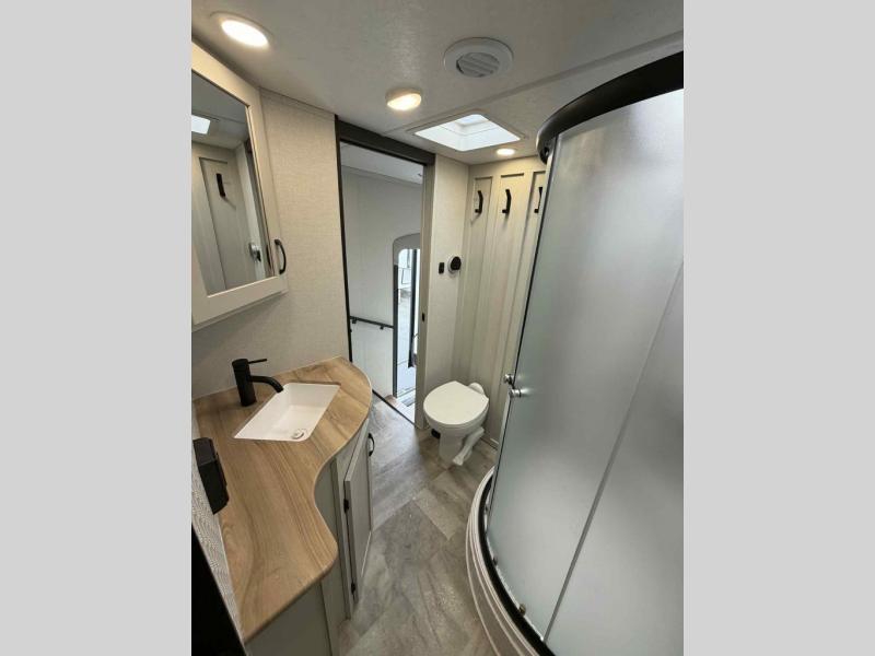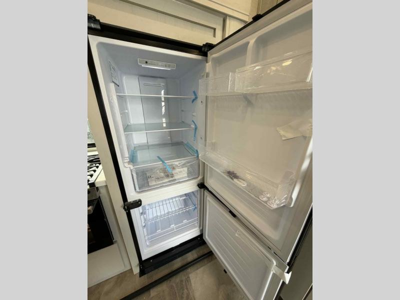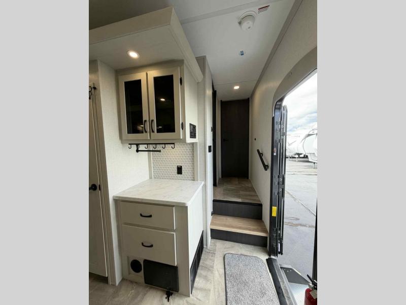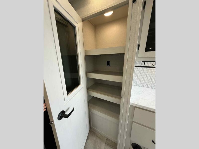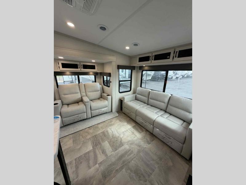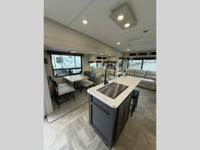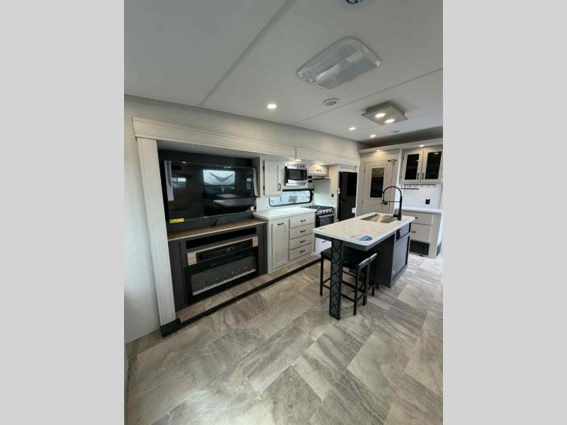 Get ready for a luxurious getaway in this fifth wheel! The rear living area is the perfect place to wind down your nights by relaxing on either the 78" tri-fold hide-a-bed sofa or the theater seating across from the entertainment center. You could even play a few card games at the free-spanning table while enjoying snacks that were stored in the pantry. The kitchen island comes with two bar stools so you can have two helpers get dinner ready while you're cooking on the three burner cooktop. The dual entry bathroom is easy for everyone to access and has a radius shower with glass doors to freshen up in, plus it leads directly into the front master suite where you will find a queen bed to lay your head on at night and a wardrobe/linen slide to keep your clothes looking their best!