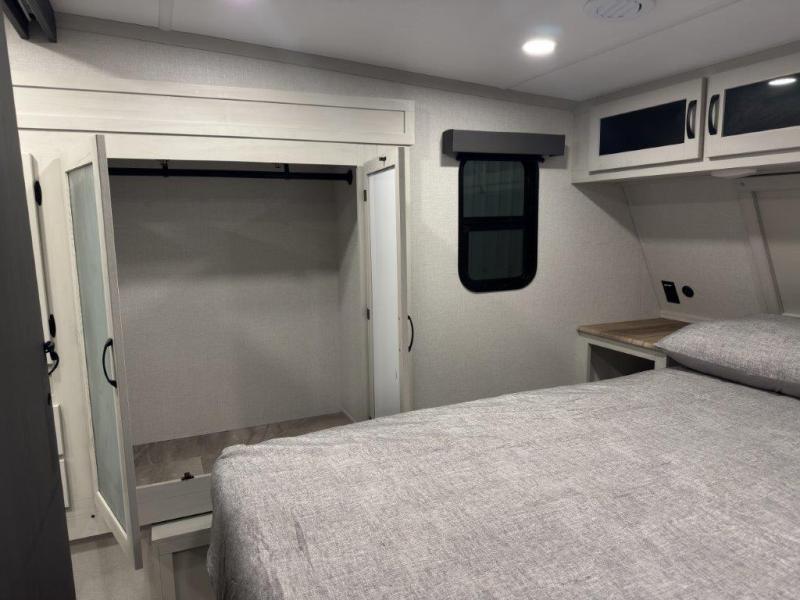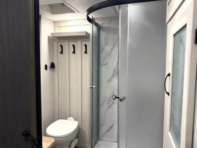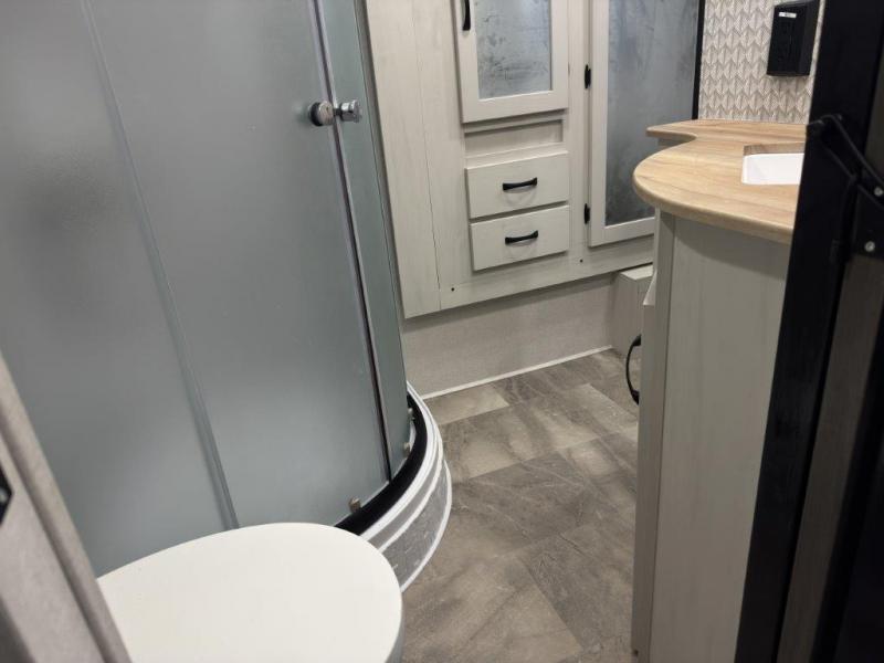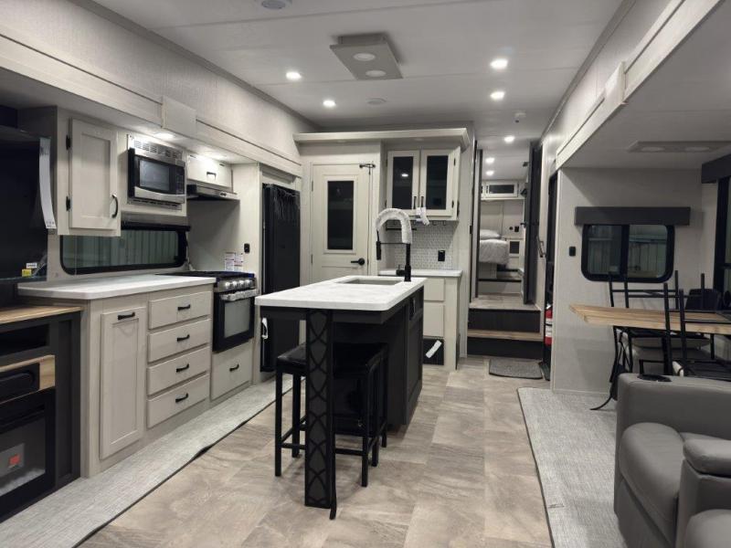 Get ready for a luxurious getaway in this fifth wheel! The rear living area is the perfect place to wind down your nights by relaxing on either the 78" tri-fold hide-a-bed sofa or the theater seating across from the entertainment center. You could even play a few card games at the free-spanning table while enjoying snacks that were stored in the pantry. The kitchen island comes with two bar stools so you can have two helpers get dinner ready while you're cooking on the three burner cooktop. The dual entry bathroom is easy for everyone to access and has a radius shower with glass doors to freshen up in, plus it leads directly into the front master suite where you will find a queen bed to lay your head on at night and a wardrobe/linen slide to keep your clothes looking their best!