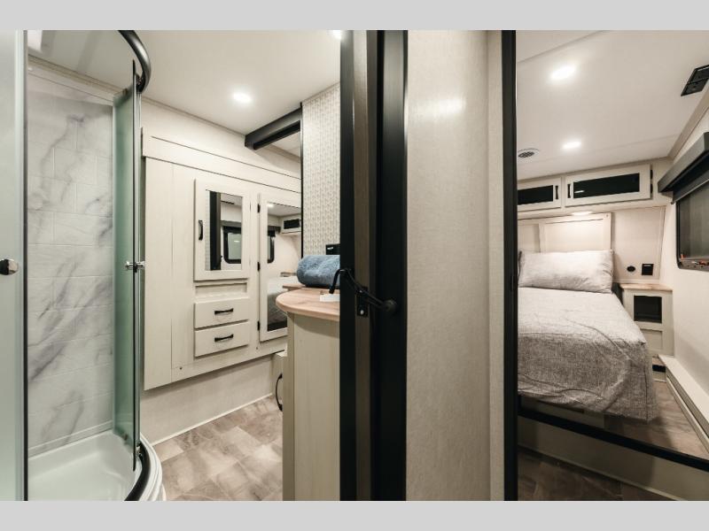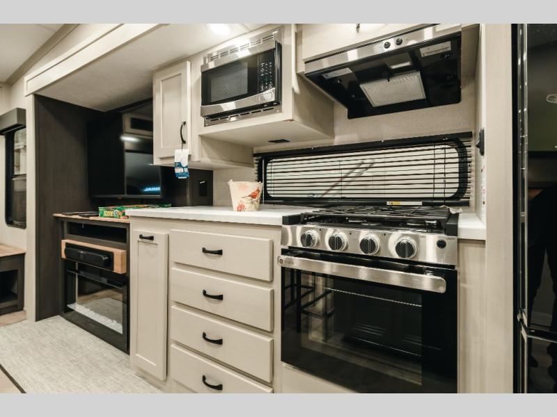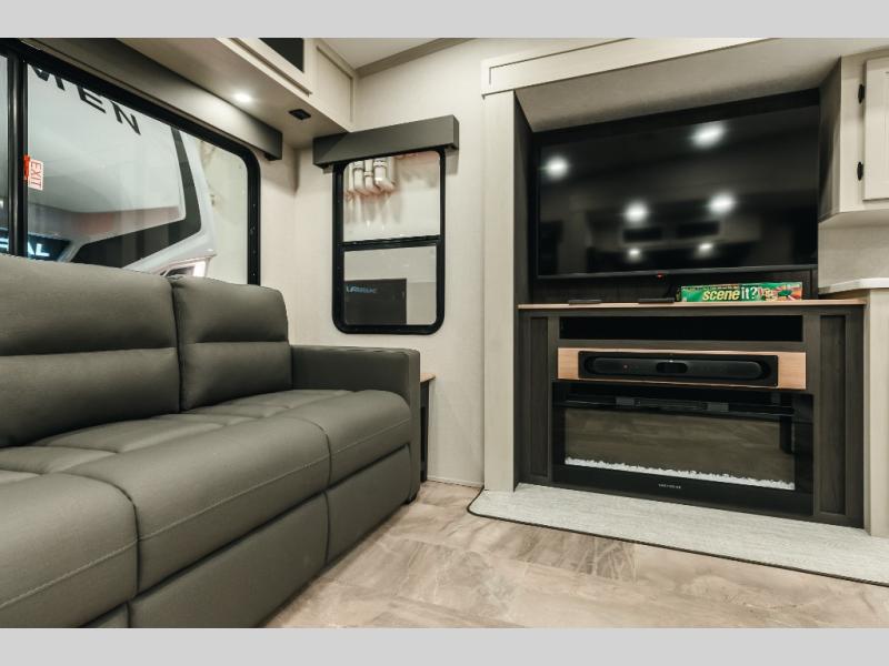 Get ready for a luxurious getaway in this fifth wheel! The rear living area is the perfect place to wind down your nights by relaxing on either the 78" tri-fold hide-a-bed sofa or the theater seating across from the entertainment center. You could even play a few card games at the free-spanning table while enjoying snacks that were stored in the pantry. The kitchen island comes with two bar stools so you can have two helpers get dinner ready while you're cooking on the three burner cooktop. The dual entry bathroom is easy for everyone to access and has a radius shower with glass doors to freshen up in, plus it leads directly into the front master suite where you will find a queen bed to lay your head on at night and a wardrobe/linen slide to keep your clothes looking their best!