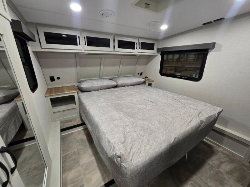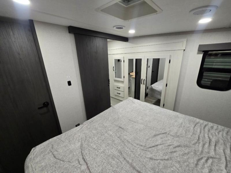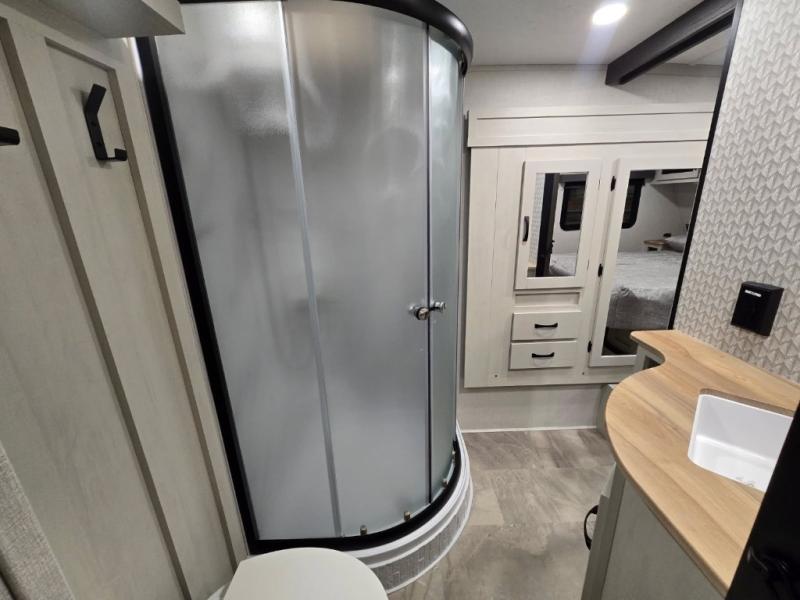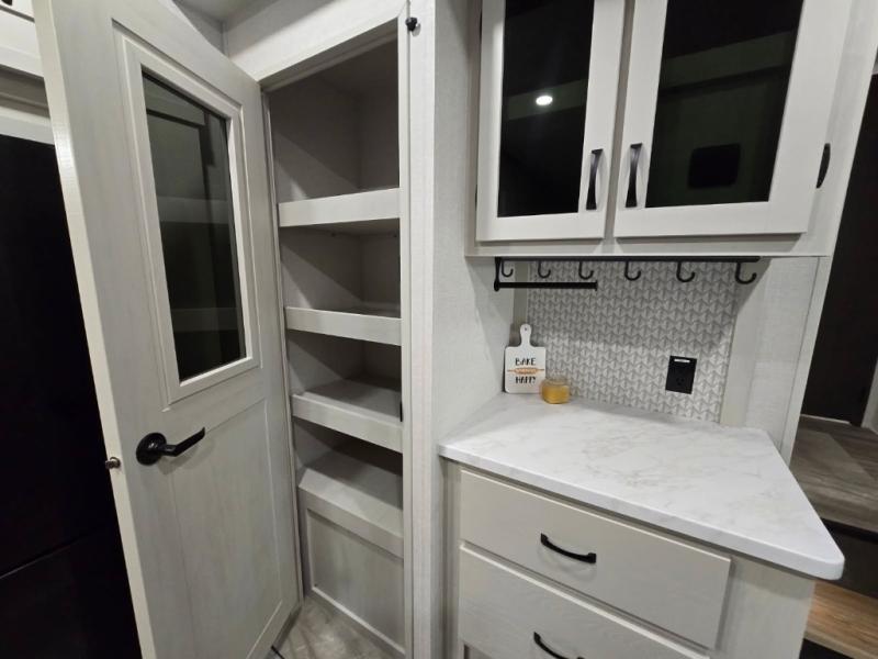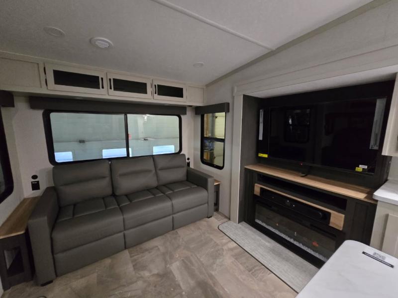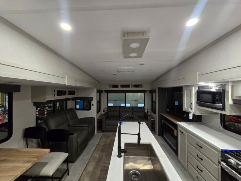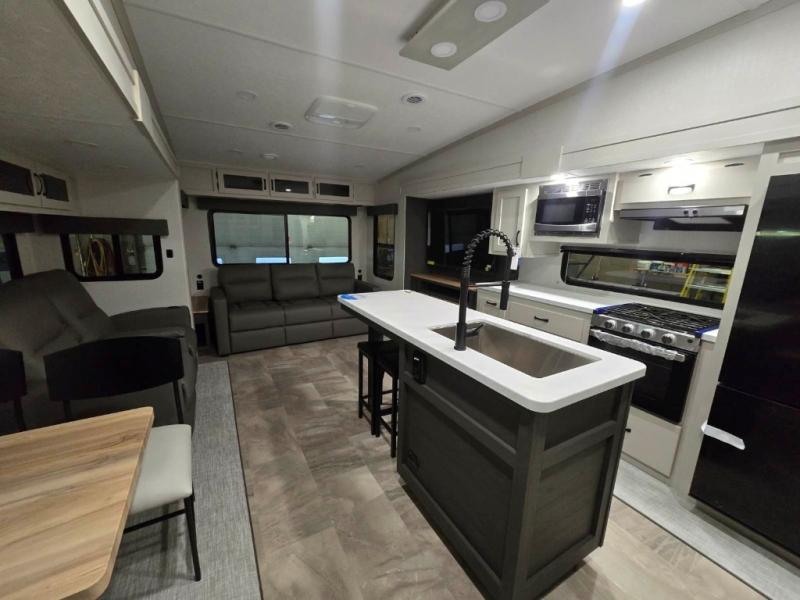 Get ready for a luxurious getaway in this fifth wheel! The rear living area is the perfect place to wind down your nights by relaxing on either the 78" tri-fold hide-a-bed sofa or the theater seating across from the entertainment center. You could even play a few card games at the free-spanning table while enjoying snacks that were stored in the pantry. The kitchen island comes with two bar stools so you can have two helpers get dinner ready while you're cooking on the three burner cooktop. The dual entry bathroom is easy for everyone to access and has a radius shower with glass doors to freshen up in, plus it leads directly into the front master suite where you will find a queen bed to lay your head on at night and a wardrobe/linen slide to keep your clothes looking their best!