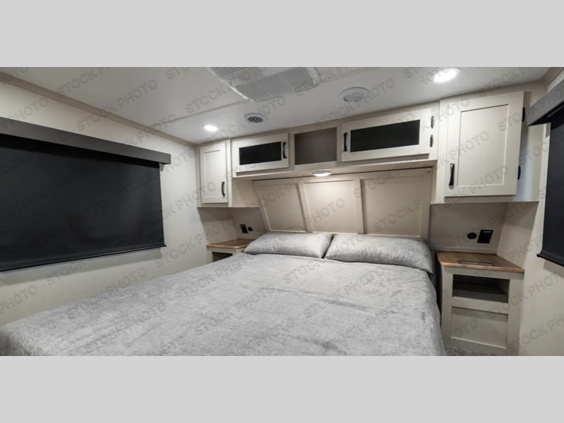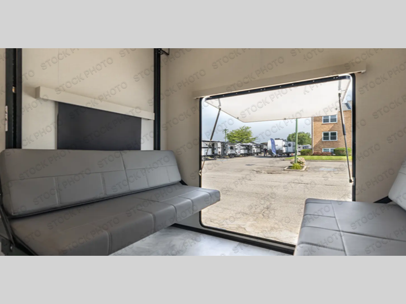 This unique fifth wheel allows you to bring along bikes, kayaks, and extra camp gear thanks to the rear Pack Max storage door on gas struts. Once you've unloaded your gear, you can relax on the roll over sofas that will convert to a queen-size bed. There is also a top queen bed above the sofas for more sleeping space, along with a door to make this your guests' bedroom at night. You'll have the front bedroom all to yourselves with a queen bed, dual nightstands, and a wardrobe for clothes, and the full bath is close by for easy nighttime use. In the morning, everyone can meet in the combined kitchen and living area to dine around the U-shaped dinette or relax on the tri-fold sofa.