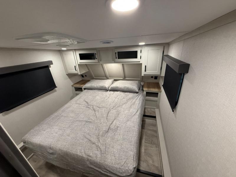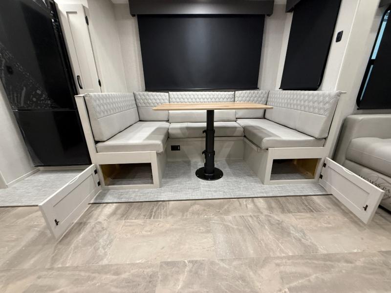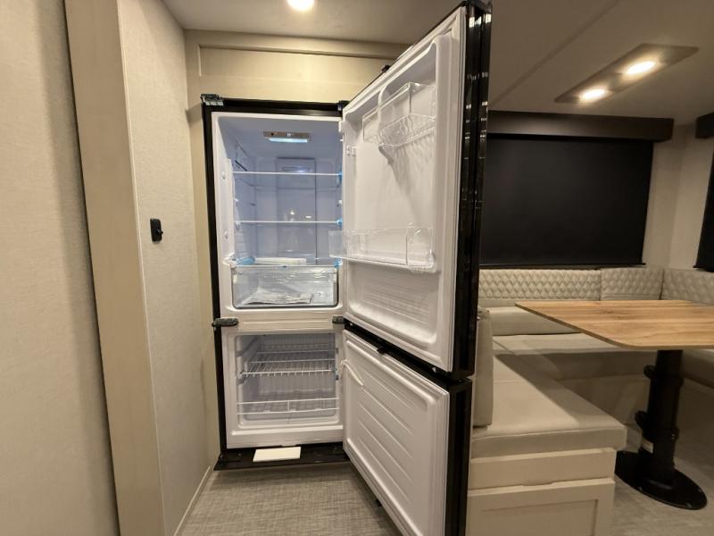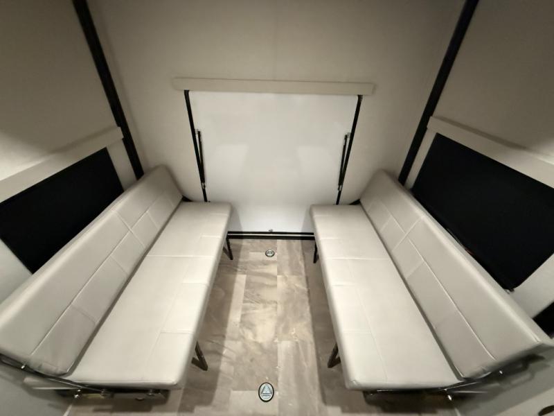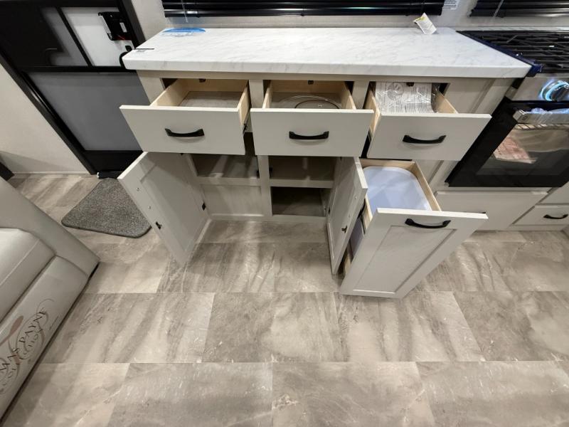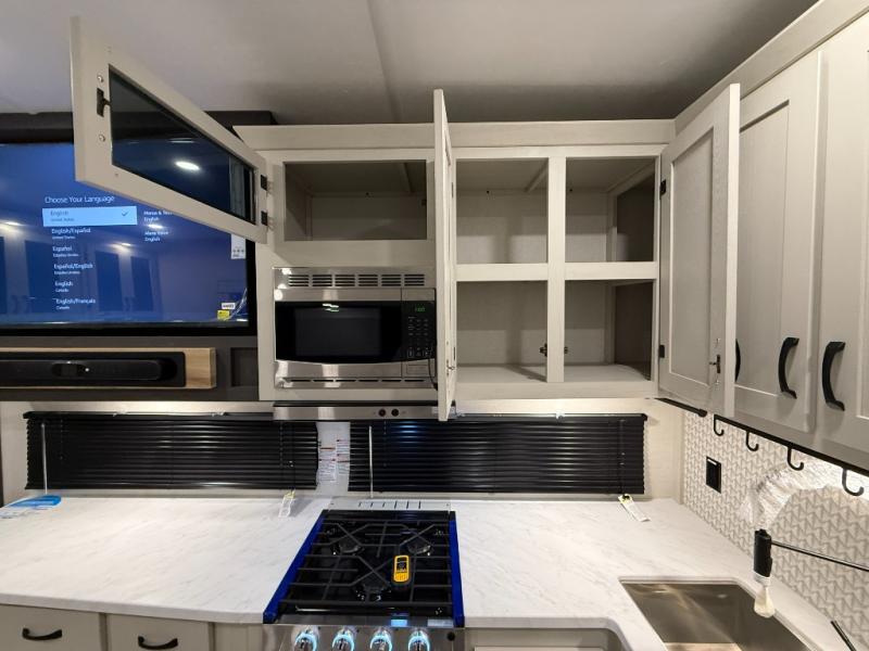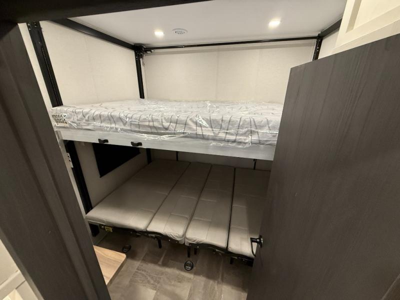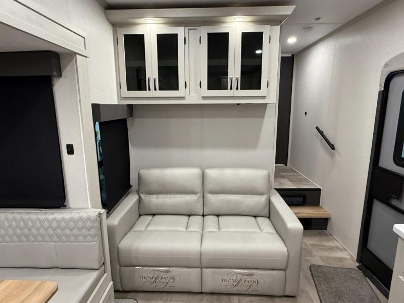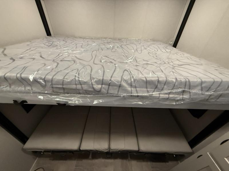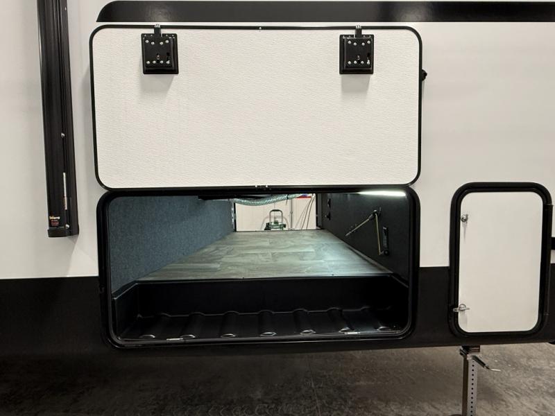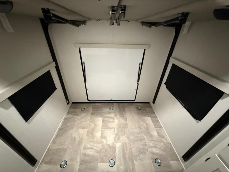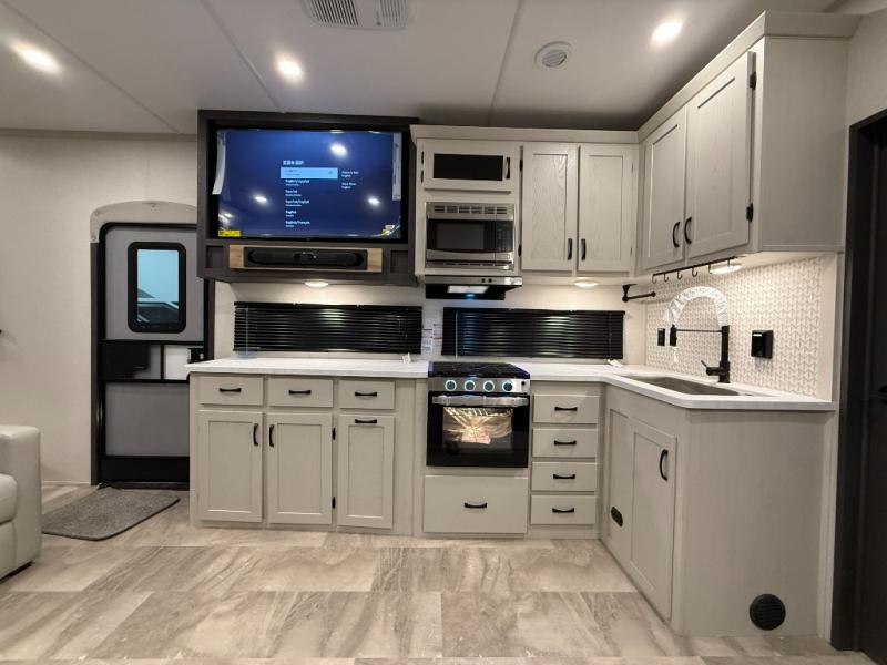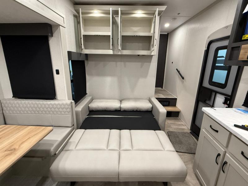 This unique fifth wheel allows you to bring along bikes, kayaks, and extra camp gear thanks to the rear Pack Max storage door on gas struts. Once you've unloaded your gear, you can relax on the roll over sofas that will convert to a queen-size bed. There is also a top queen bed above the sofas for more sleeping space, along with a door to make this your guests' bedroom at night. You'll have the front bedroom all to yourselves with a queen bed, dual nightstands, and a wardrobe for clothes, and the full bath is close by for easy nighttime use. In the morning, everyone can meet in the combined kitchen and living area to dine around the U-shaped dinette or relax on the tri-fold sofa.