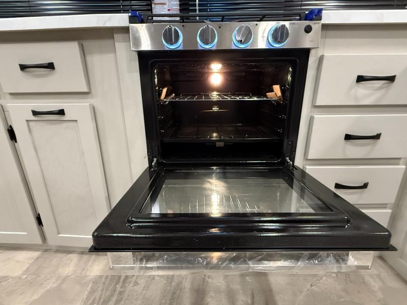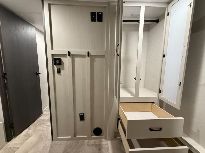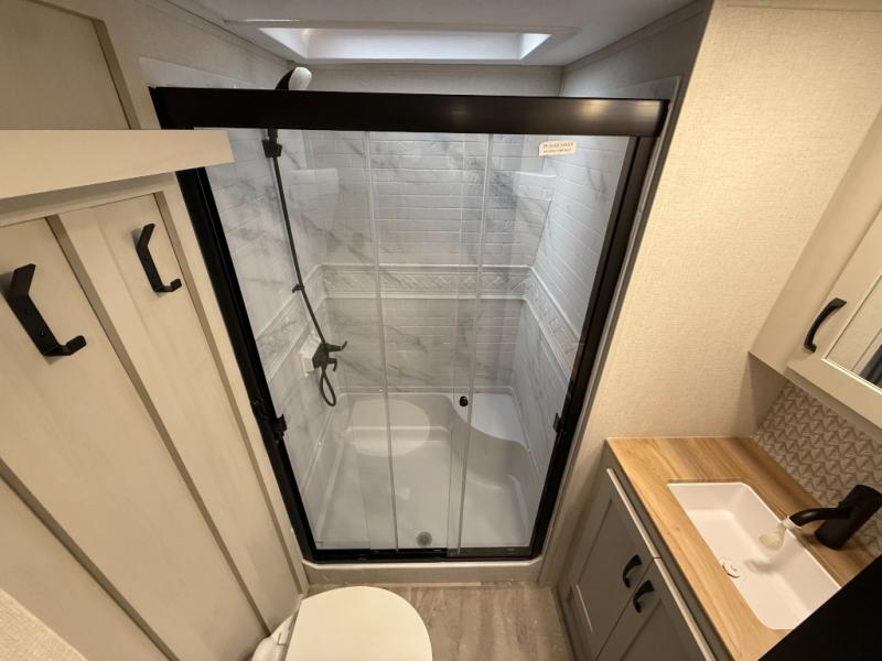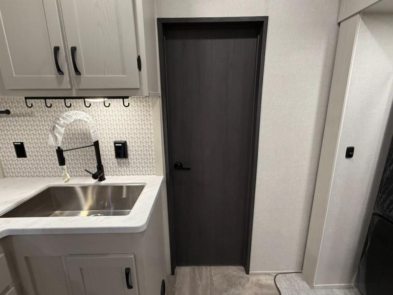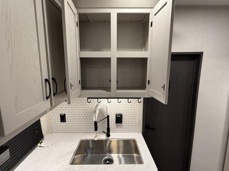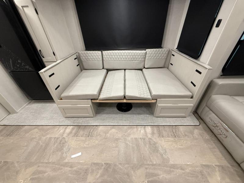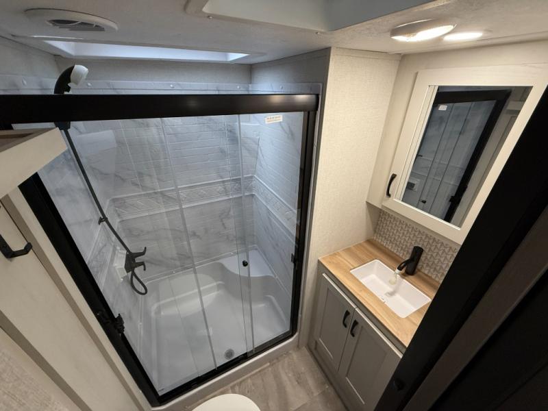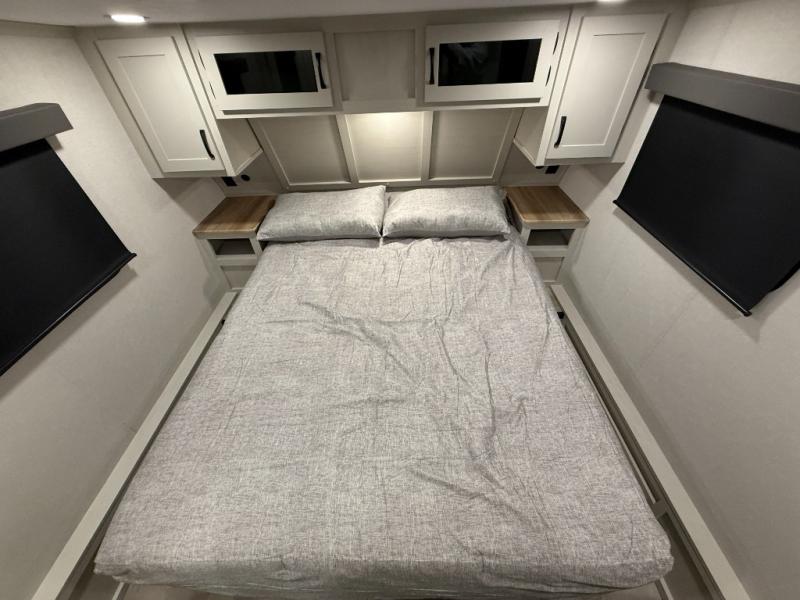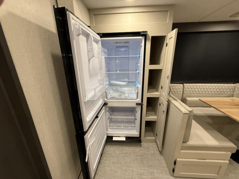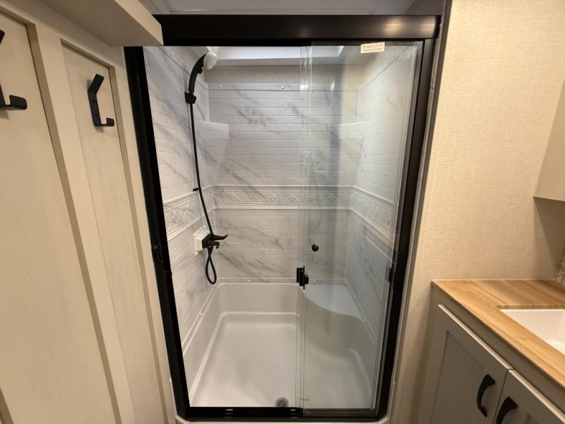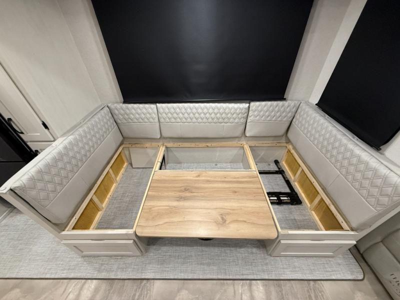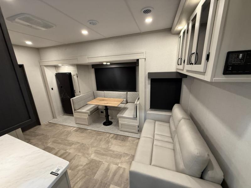 This unique fifth wheel allows you to bring along bikes, kayaks, and extra camp gear thanks to the rear Pack Max storage door on gas struts. Once you've unloaded your gear, you can relax on the roll over sofas that will convert to a queen-size bed. There is also a top queen bed above the sofas for more sleeping space, along with a door to make this your guests' bedroom at night. You'll have the front bedroom all to yourselves with a queen bed, dual nightstands, and a wardrobe for clothes, and the full bath is close by for easy nighttime use. In the morning, everyone can meet in the combined kitchen and living area to dine around the U-shaped dinette or relax on the tri-fold sofa.