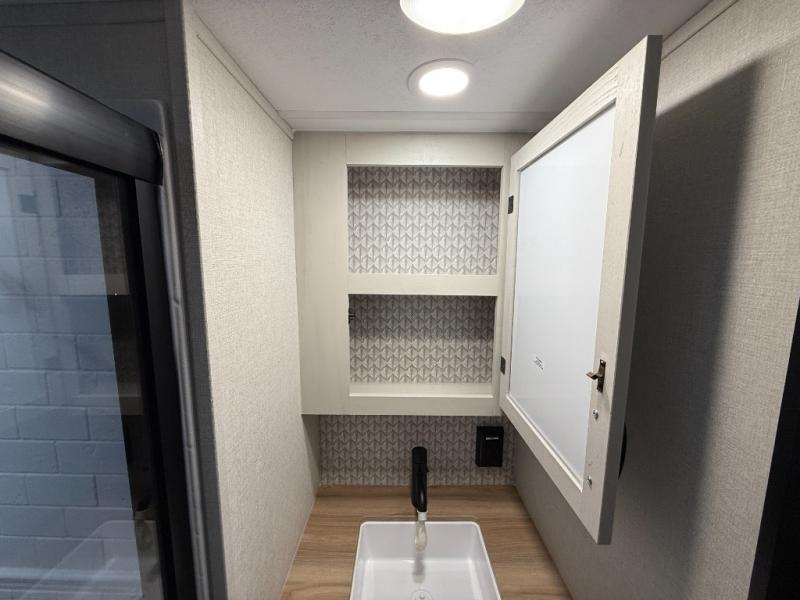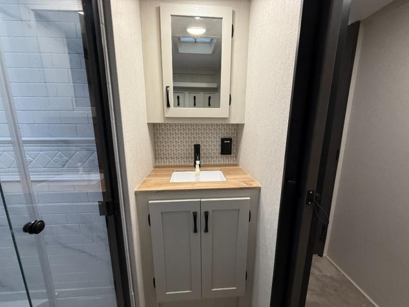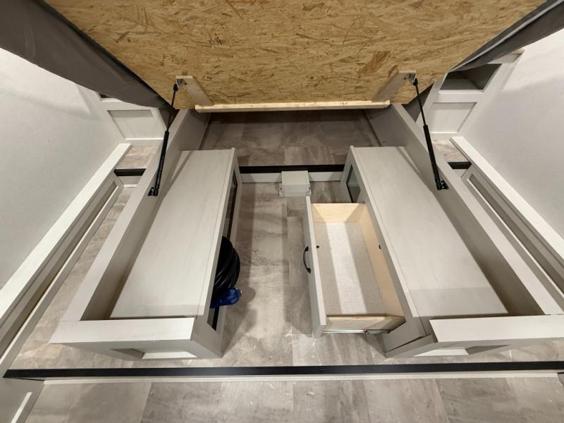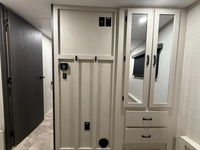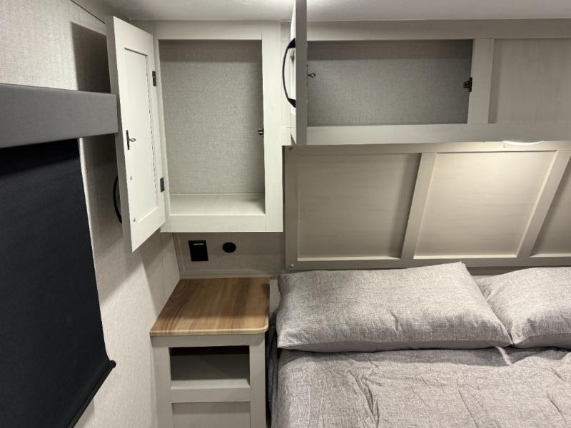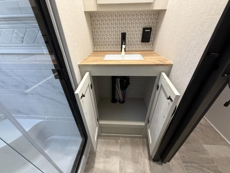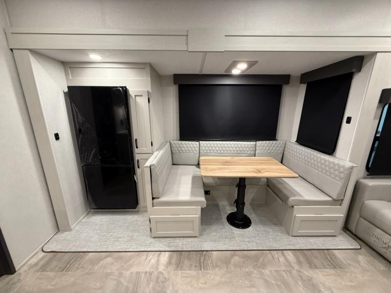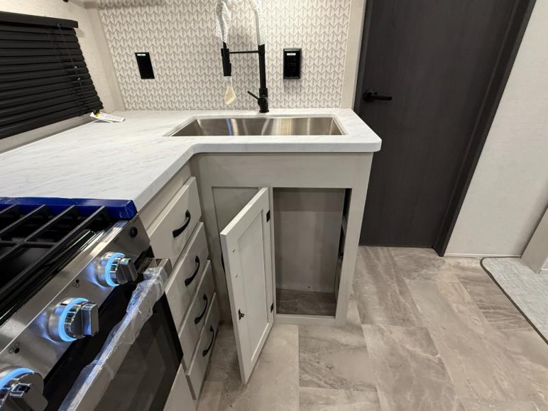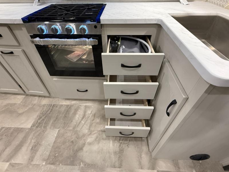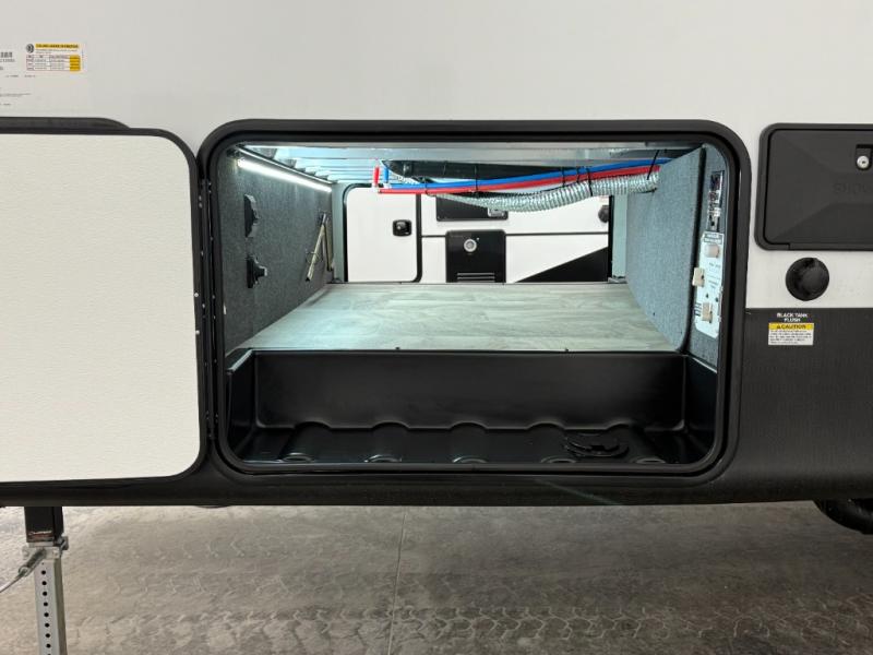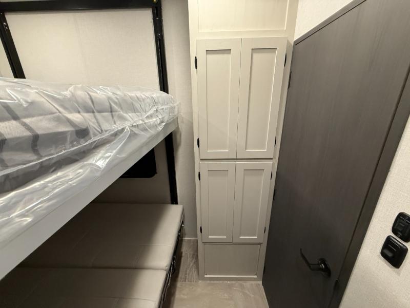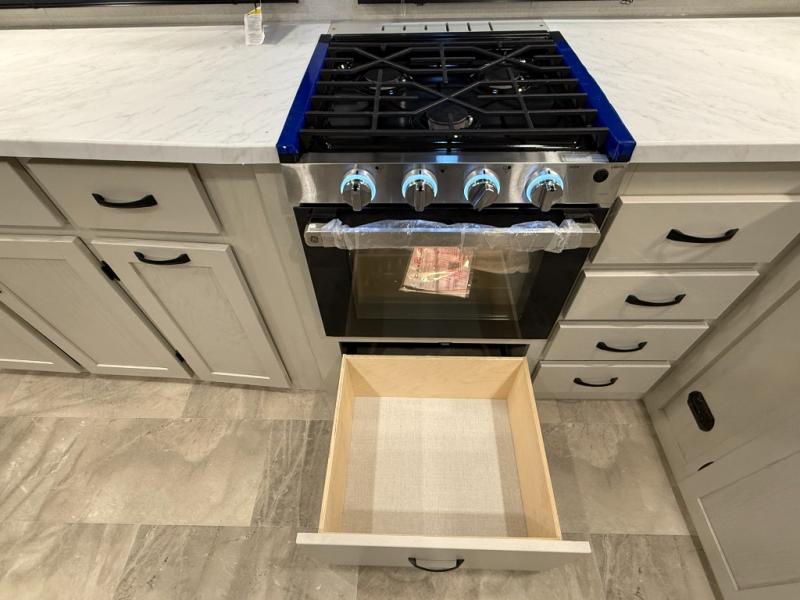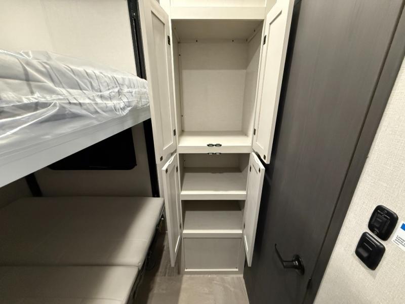 This unique fifth wheel allows you to bring along bikes, kayaks, and extra camp gear thanks to the rear Pack Max storage door on gas struts. Once you've unloaded your gear, you can relax on the roll over sofas that will convert to a queen-size bed. There is also a top queen bed above the sofas for more sleeping space, along with a door to make this your guests' bedroom at night. You'll have the front bedroom all to yourselves with a queen bed, dual nightstands, and a wardrobe for clothes, and the full bath is close by for easy nighttime use. In the morning, everyone can meet in the combined kitchen and living area to dine around the U-shaped dinette or relax on the tri-fold sofa.
