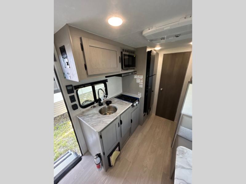 You can sleep five people in this Clipper 3K Series travel trailer with the 54" x 74" bed at the front, the booth dinette, and the 28" x 72" bunks. There is a private bathroom that everyone can use to stay clean, and the chef of the group can cook meals on the cooktop in the kitchen. There is a storage cabinet in the kitchen plus overhead cabinets for even more storage, and there is a pass-through exterior storage for larger gear. When it's raining outside, simply put out the 10' power awning for protection.