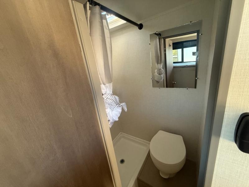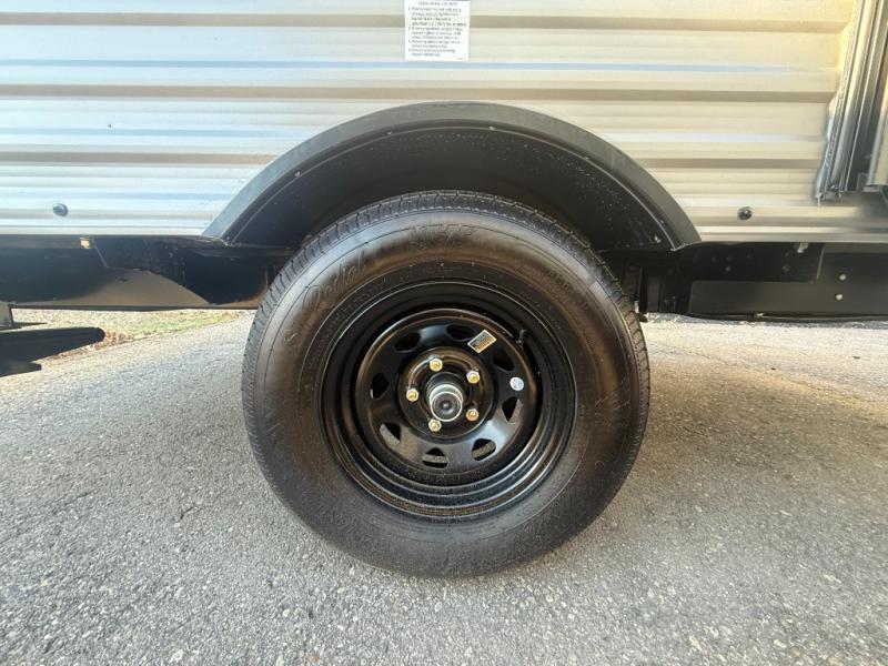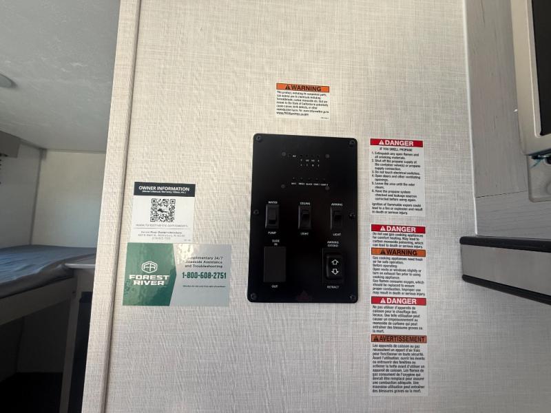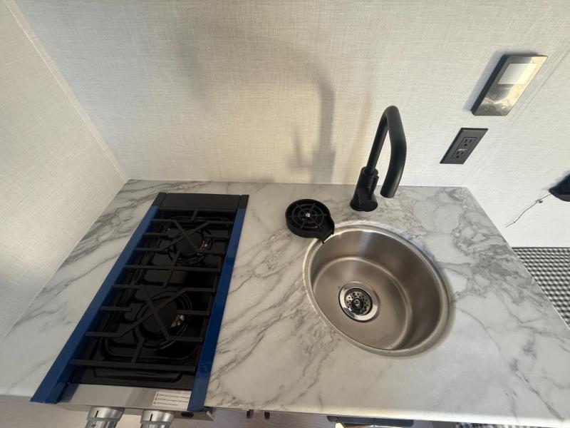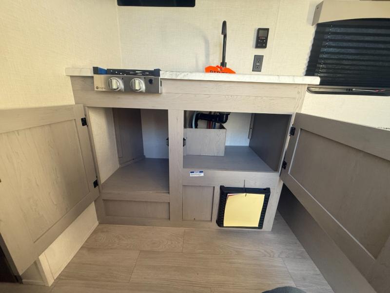 Lightweight camping with at-home comforts is possible with this travel trailer in tow! Once you arrive at the campground, you can unload the exterior storage, put out the awning, then head inside to make lunch on the two-burner cooktop. There is a refrigerator to keep your items fresh, plus a sink with a cup rinse for added convenience. Your guests or little ones are sure to love the 29" x 70" bunk beds, and the private bath is close to the bunks for easy nighttime use. You'll have the front 54" x 74" RV queen bed to yourselves, along with an overhead shelf and bedroom storage for your things.