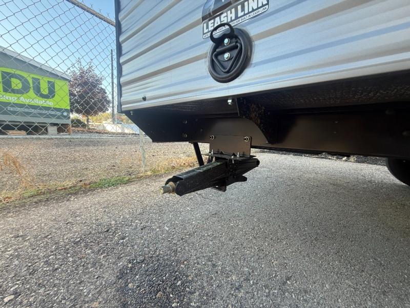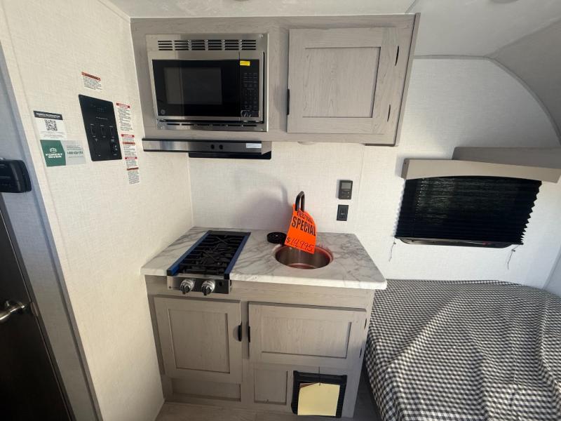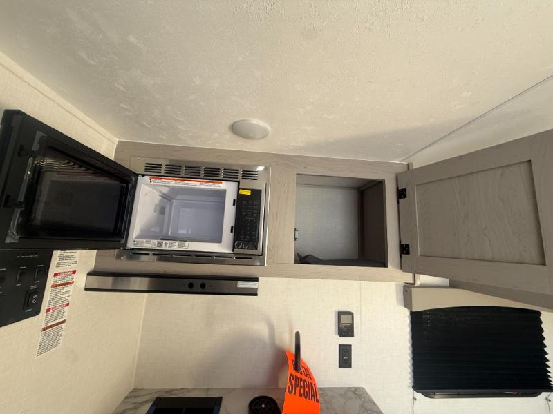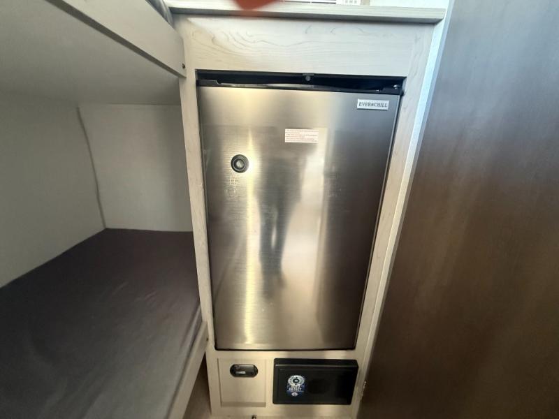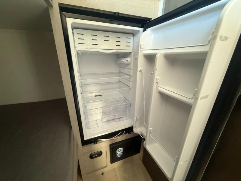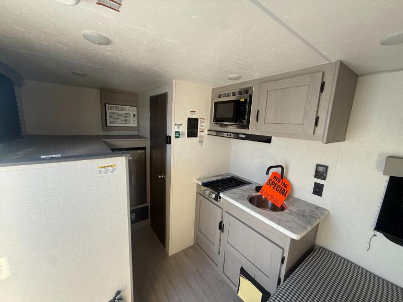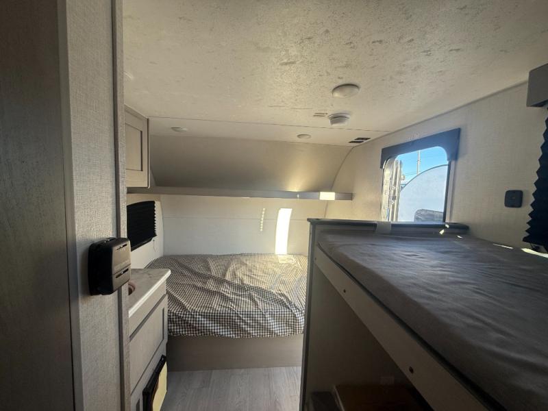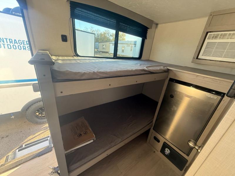 Lightweight camping with at-home comforts is possible with this travel trailer in tow! Once you arrive at the campground, you can unload the exterior storage, put out the awning, then head inside to make lunch on the two-burner cooktop. There is a refrigerator to keep your items fresh, plus a sink with a cup rinse for added convenience. Your guests or little ones are sure to love the 29" x 70" bunk beds, and the private bath is close to the bunks for easy nighttime use. You'll have the front 54" x 74" RV queen bed to yourselves, along with an overhead shelf and bedroom storage for your things.