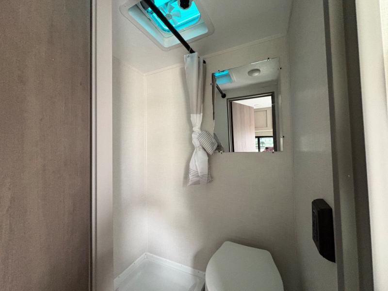 Lightweight camping with at-home comforts is possible with this travel trailer in tow! Once you arrive at the campground, you can unload the exterior storage, put out the awning, then head inside to make lunch on the two-burner cooktop. There is a refrigerator to keep your items fresh, plus a sink with a cup rinse for added convenience. Your guests or little ones are sure to love the 29" x 70" bunk beds, and the private bath is close to the bunks for easy nighttime use. You'll have the front 54" x 74" RV queen bed to yourselves, along with an overhead shelf and bedroom storage for your things.