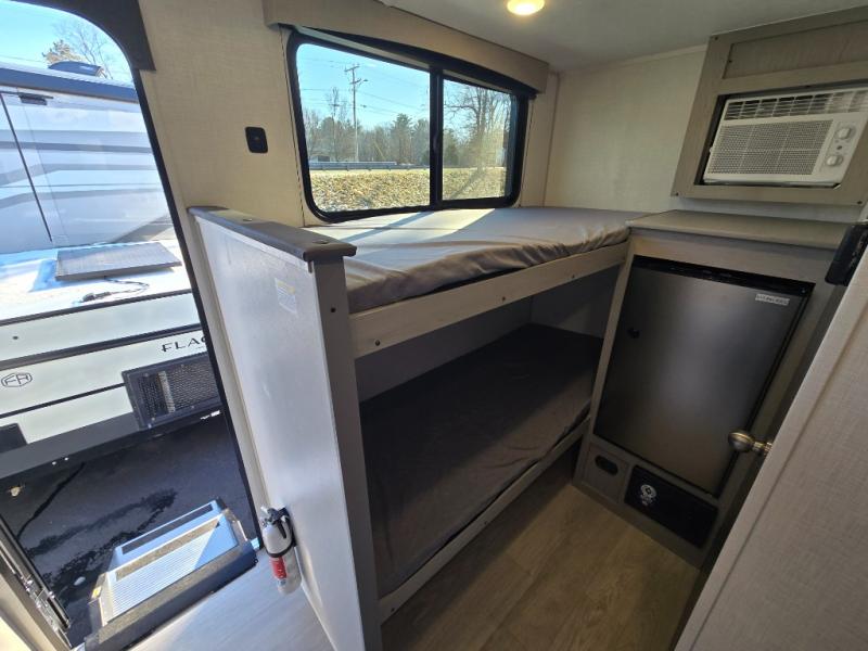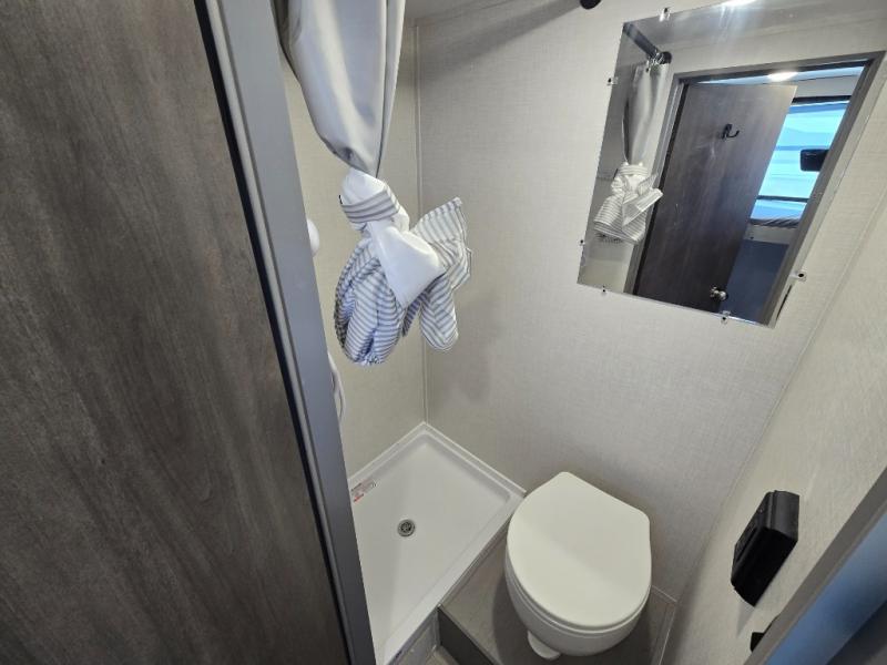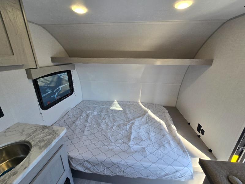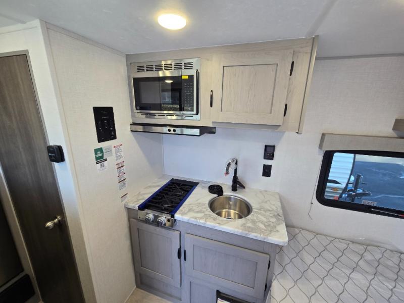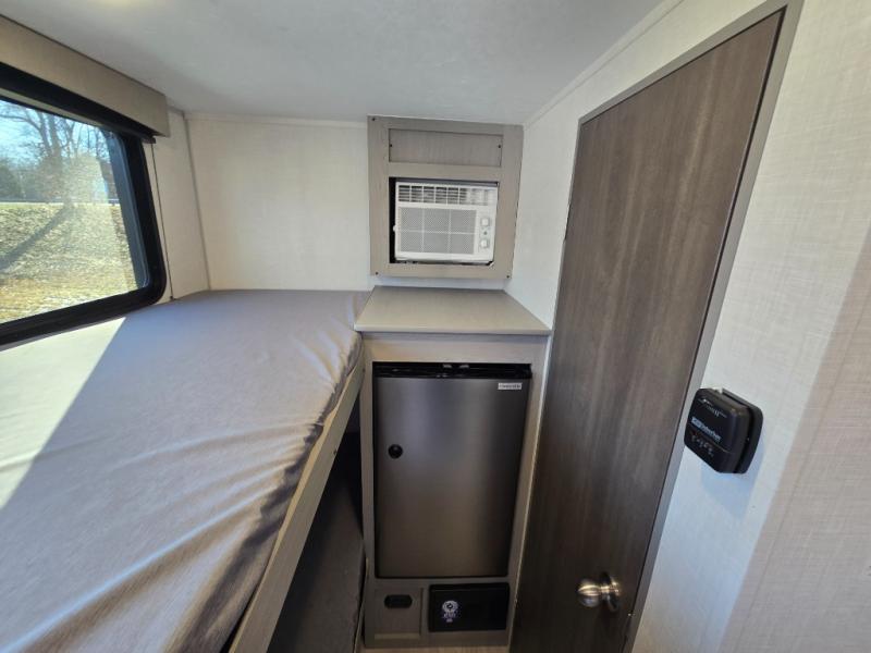 Lightweight camping with at-home comforts is possible with this travel trailer in tow! Once you arrive at the campground, you can unload the exterior storage, put out the awning, then head inside to make lunch on the two-burner cooktop. There is a refrigerator to keep your items fresh, plus a sink with a cup rinse for added convenience. Your guests or little ones are sure to love the 29" x 70" bunk beds, and the private bath is close to the bunks for easy nighttime use. You'll have the front 54" x 74" RV queen bed to yourselves, along with an overhead shelf and bedroom storage for your things.