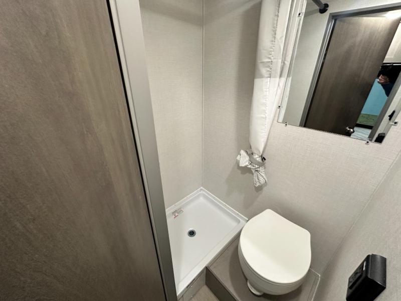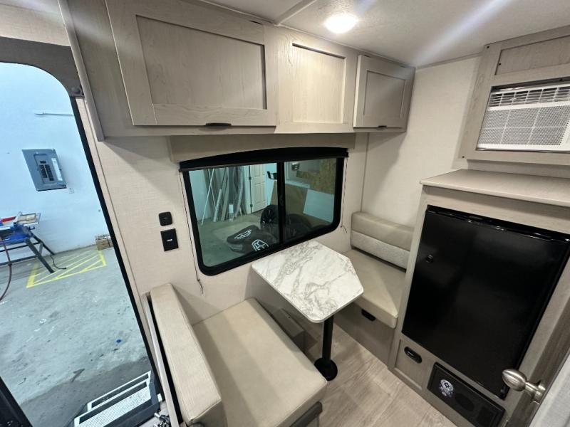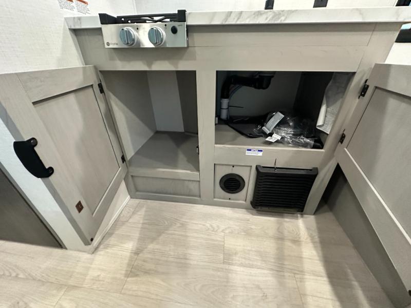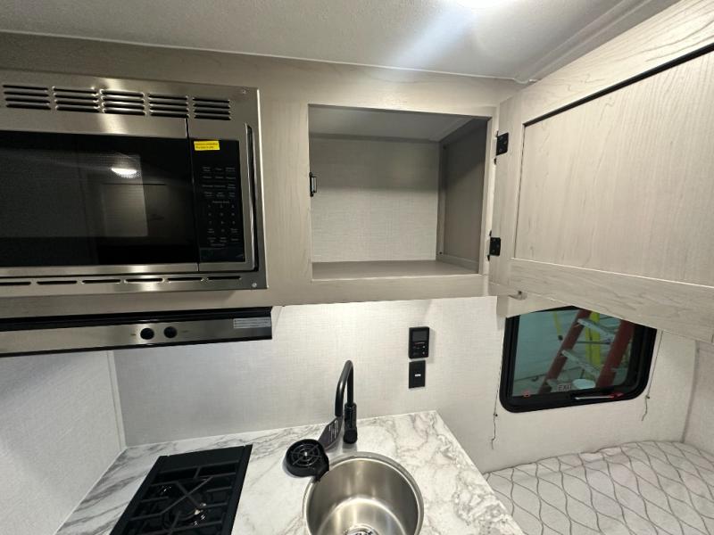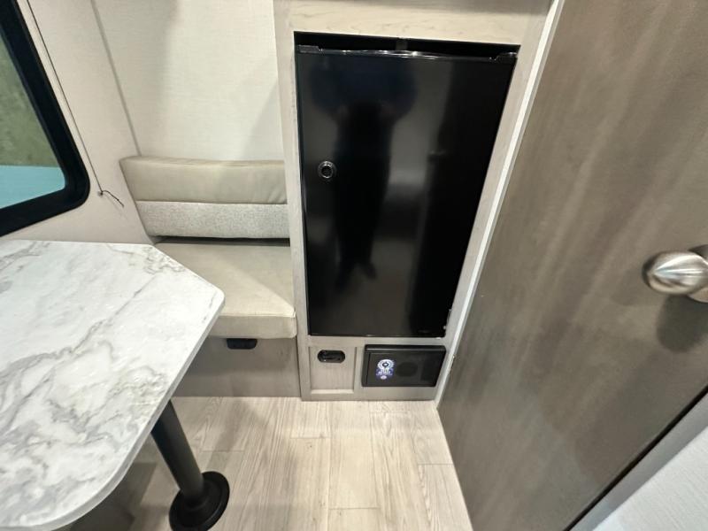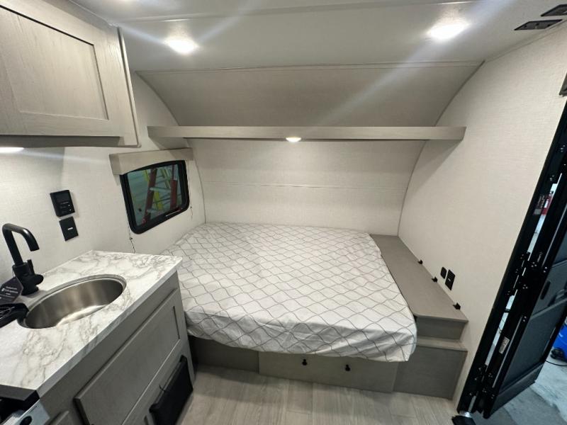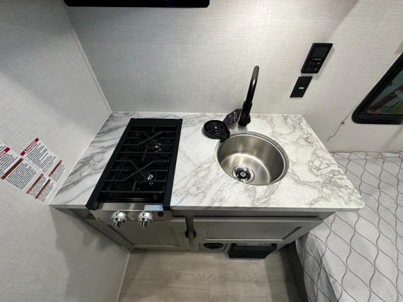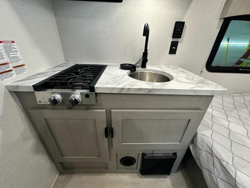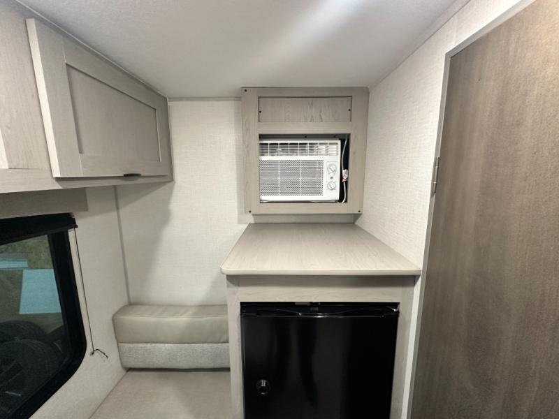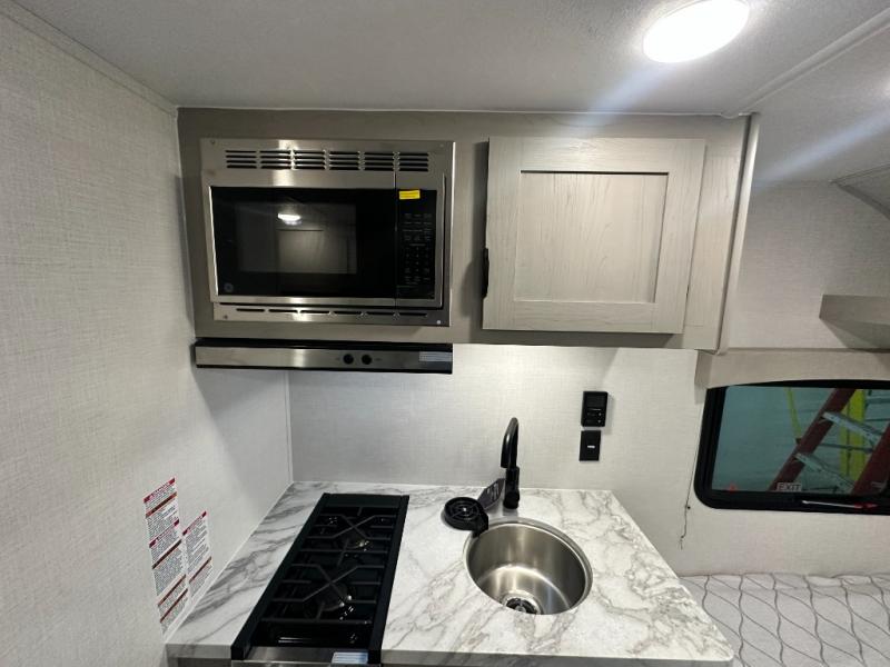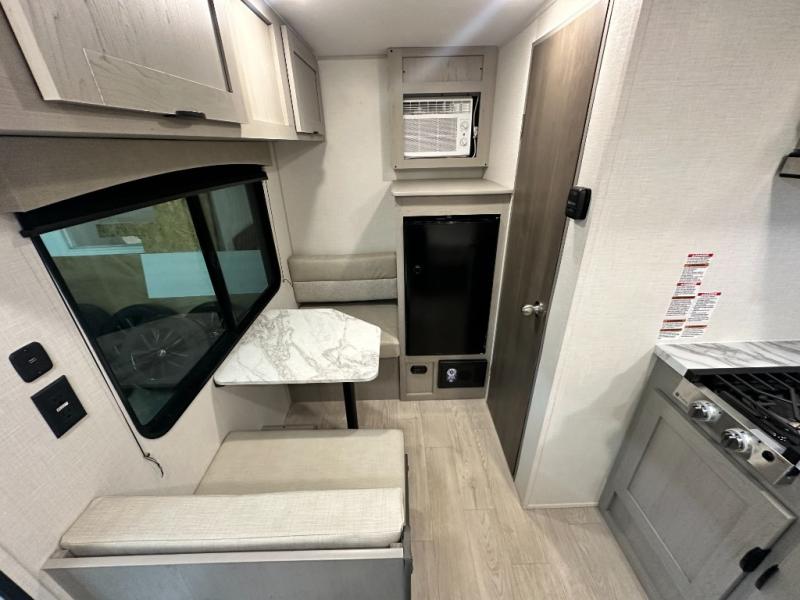 Lightweight camping with at-home comforts is possible with this travel trailer in tow! Once you arrive at the campground, you can unload the exterior storage, put out the awning, then head inside to make lunch on the two-burner cooktop. There is a refrigerator to keep your items fresh, plus a sink with a cup rinse for added convenience. The booth dinette provides a place to dine together, play a board game in the evenings, and let a guest or two little ones sleep on. You'll have the front 54" x 74" RV queen bed to yourselves, along with an overhead shelf and bedroom storage for your things. And don't overlook the private bath with a toilet and 24" x 32" shower!