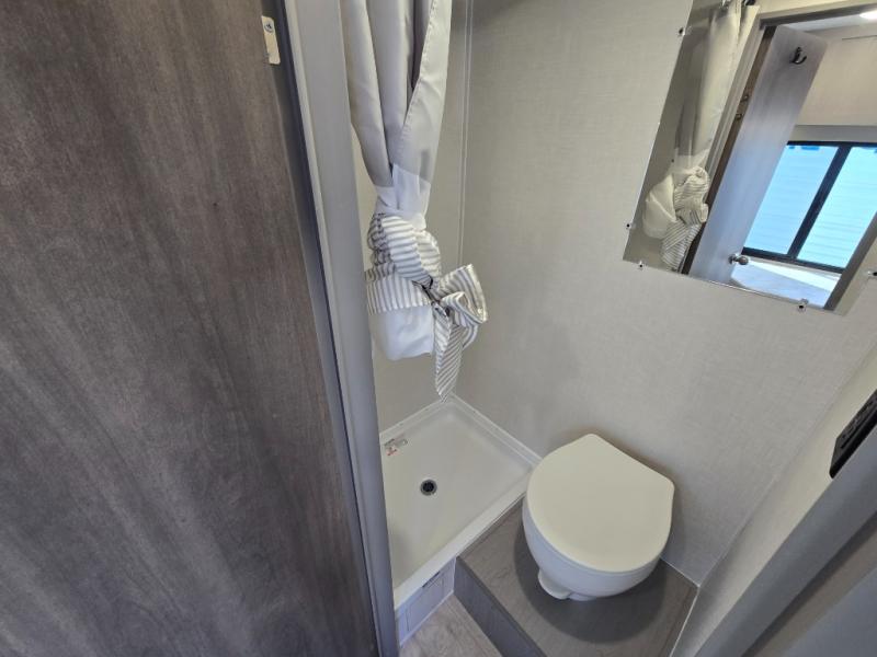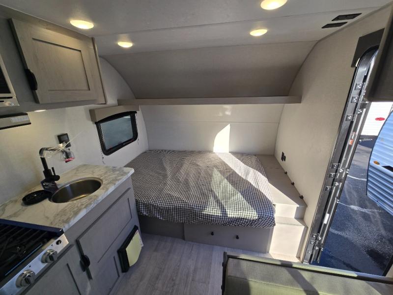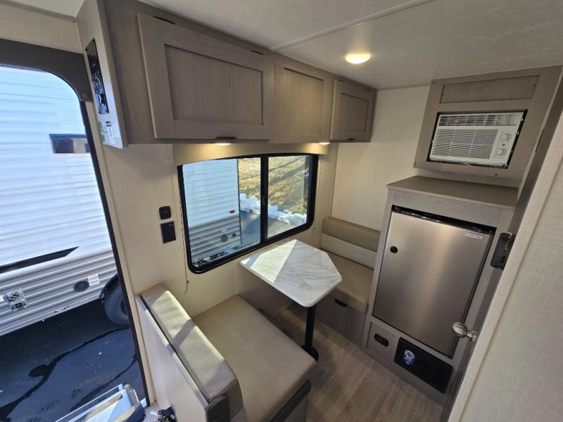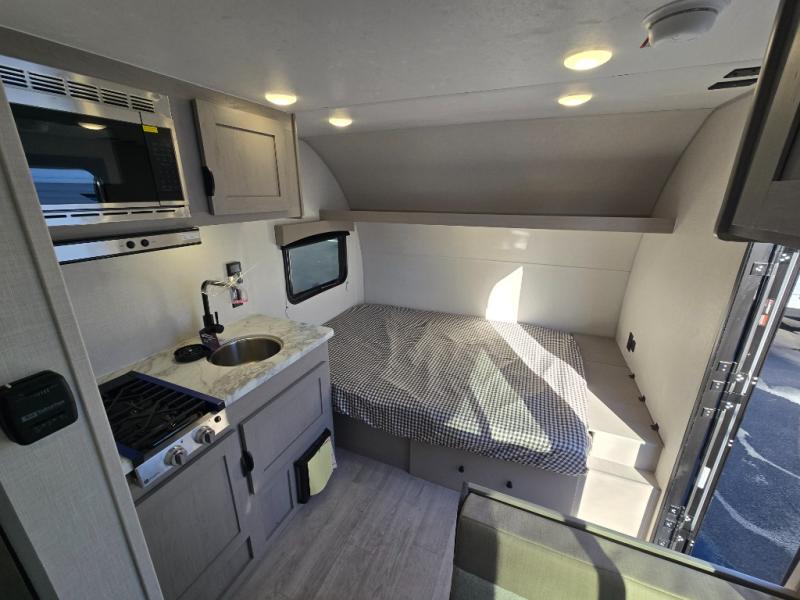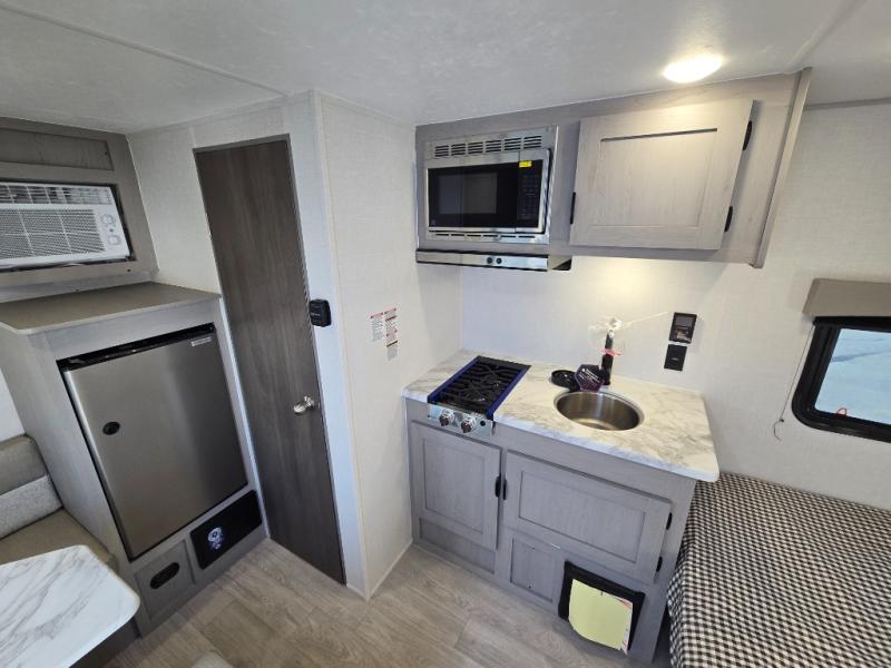Lightweight camping with at-home comforts is possible with this travel trailer in tow! Once you arrive at the campground, you can unload the exterior storage, put out the awning, then head inside to make lunch on the two-burner cooktop. There is a refrigerator to keep your items fresh, plus a sink with a cup rinse for added convenience. The booth dinette provides a place to dine together, play a board game in the evenings, and let a guest or two little ones sleep on. You'll have the front 54" x 74" RV queen bed to yourselves, along with an overhead shelf and bedroom storage for your things. And don't overlook the private bath with a toilet and 24" x 32" shower!