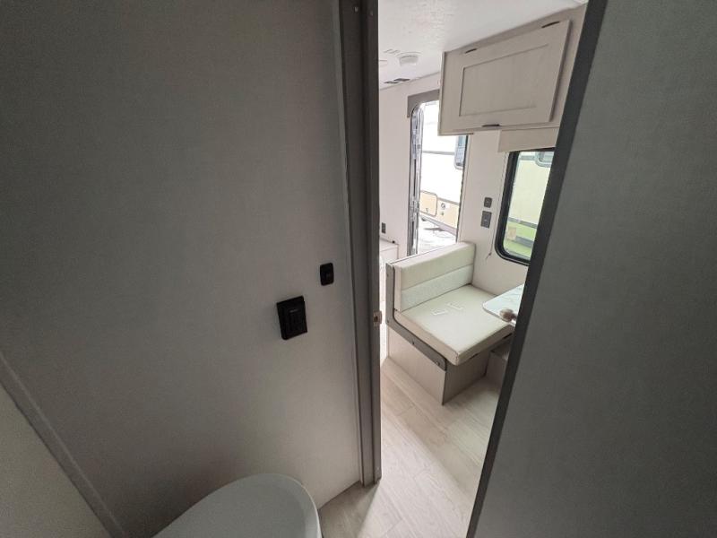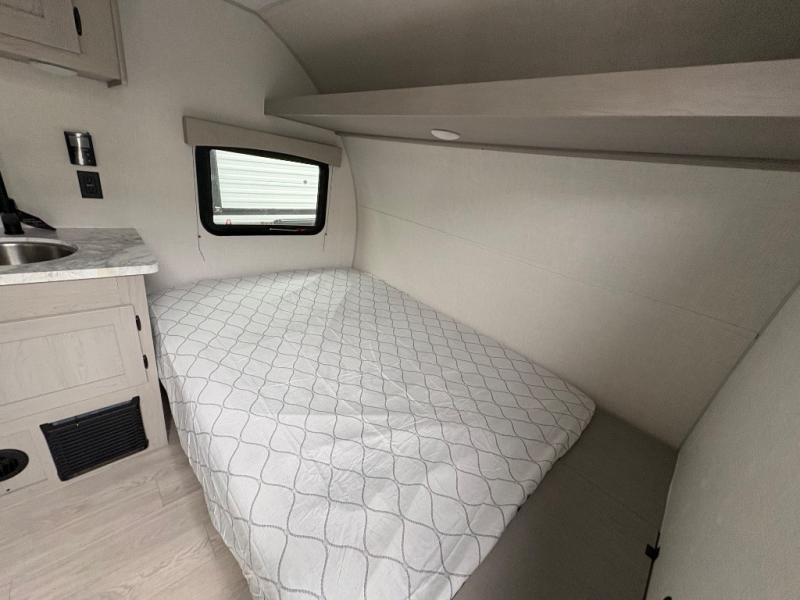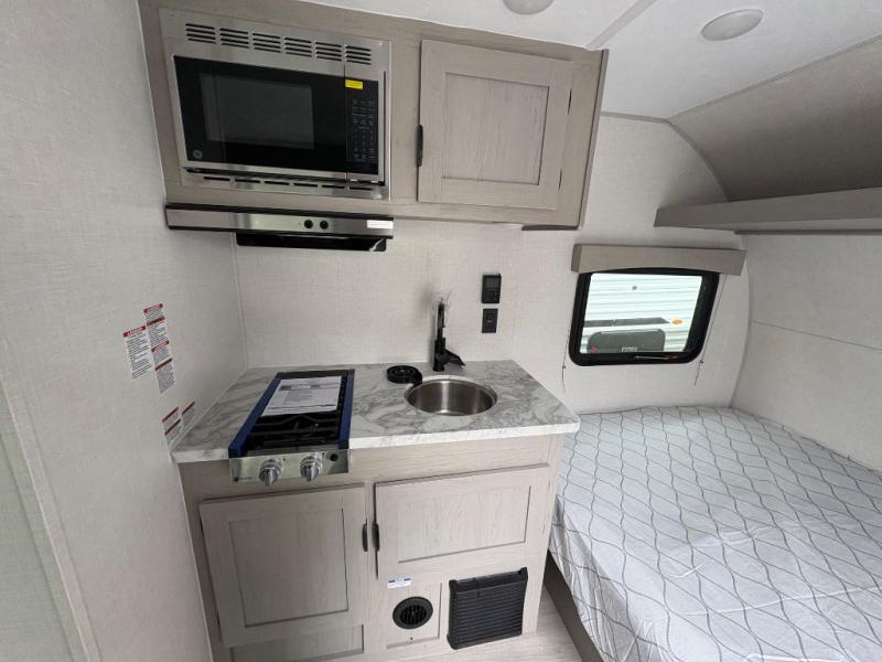 Lightweight camping with at-home comforts is possible with this travel trailer in tow! Once you arrive at the campground, you can unload the exterior storage, put out the awning, then head inside to make lunch on the two-burner cooktop. There is a refrigerator to keep your items fresh, plus a sink with a cup rinse for added convenience. The booth dinette provides a place to dine together, play a board game in the evenings, and let a guest or two little ones sleep on. You'll have the front 54" x 74" RV queen bed to yourselves, along with an overhead shelf and bedroom storage for your things. And don't overlook the private bath with a toilet and 24" x 32" shower!
