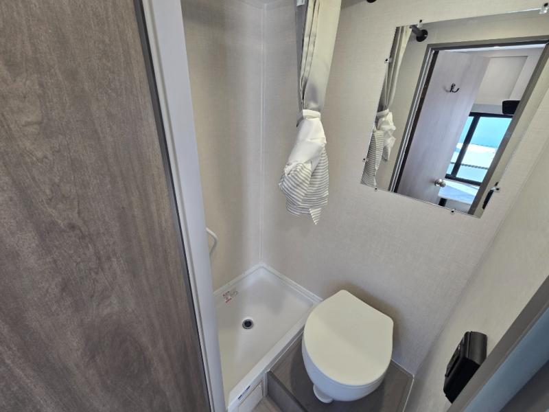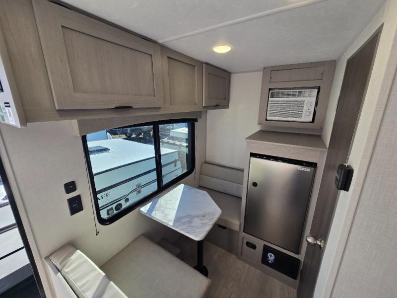 Lightweight camping with at-home comforts is possible with this travel trailer in tow! Once you arrive at the campground, you can unload the exterior storage, put out the awning, then head inside to make lunch on the two-burner cooktop. There is a refrigerator to keep your items fresh, plus a sink with a cup rinse for added convenience. The booth dinette provides a place to dine together, play a board game in the evenings, and let a guest or two little ones sleep on. You'll have the front 54" x 74" RV queen bed to yourselves, along with an overhead shelf and bedroom storage for your things. And don't overlook the private bath with a toilet and 24" x 32" shower!