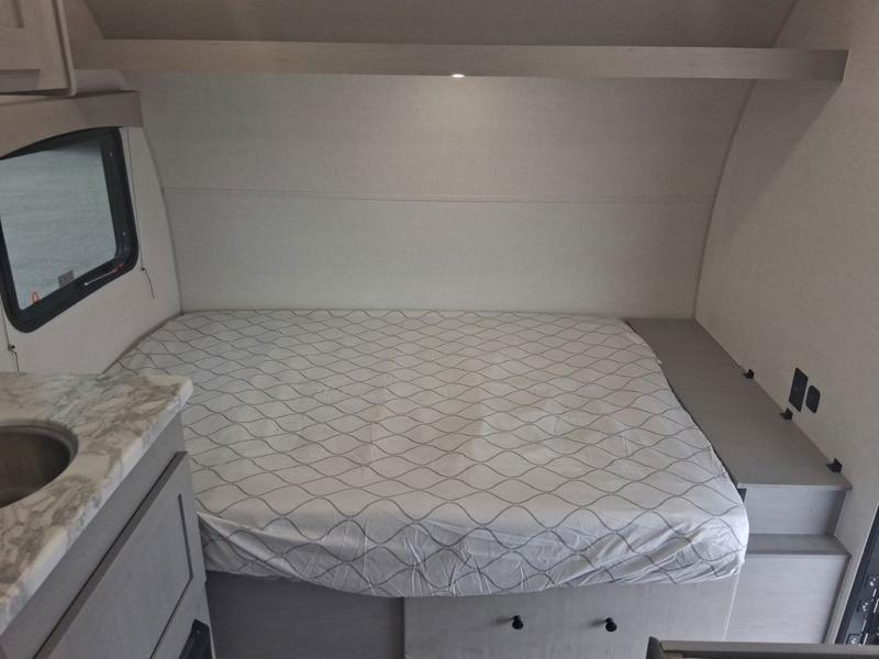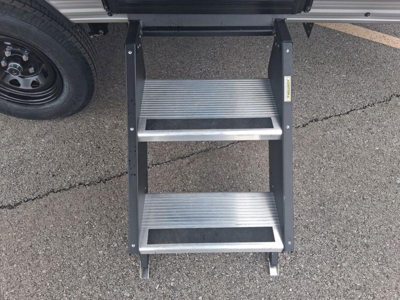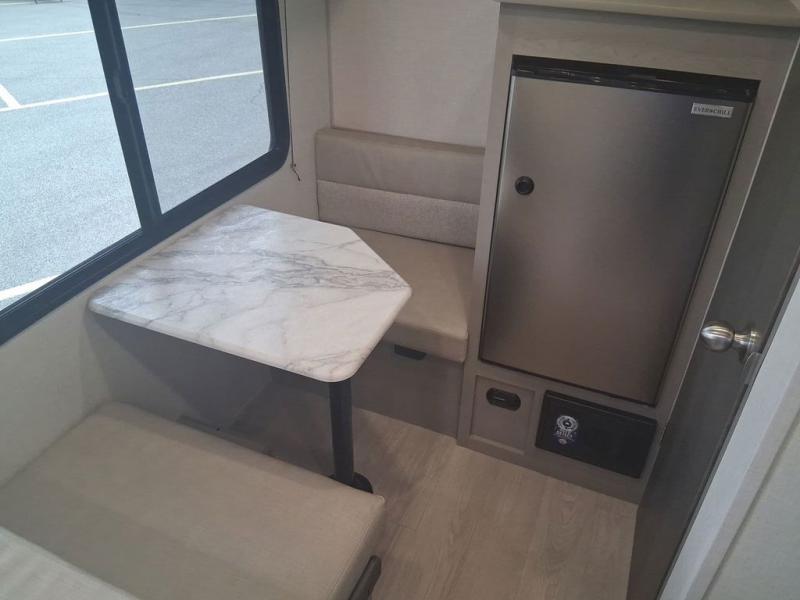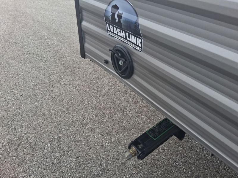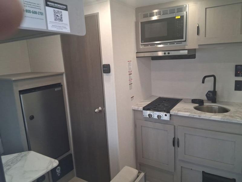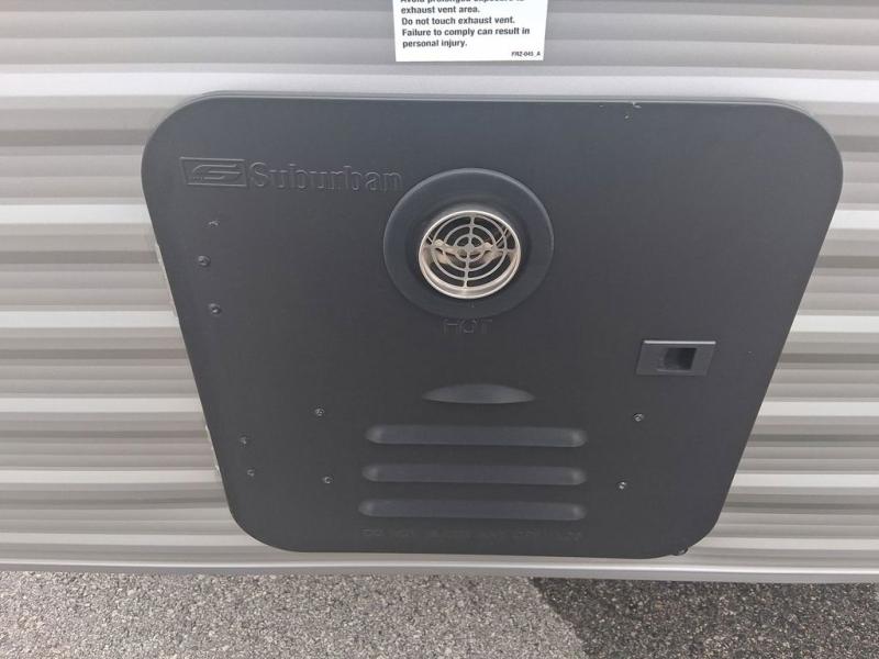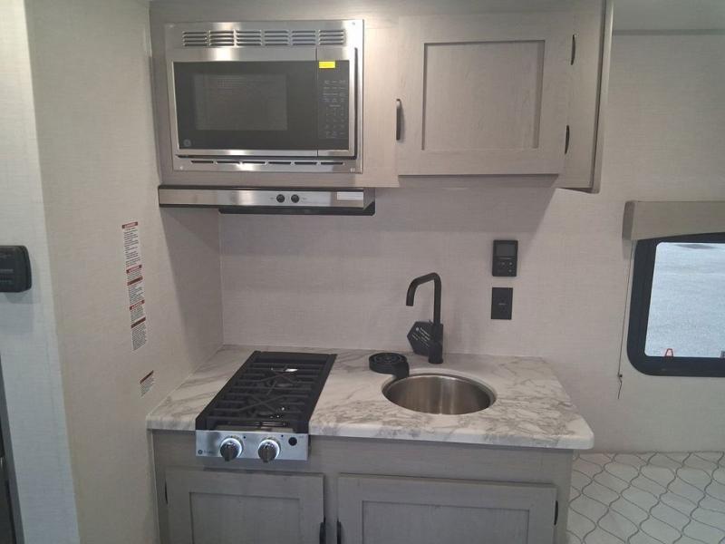 Lightweight camping with at-home comforts is possible with this travel trailer in tow! Once you arrive at the campground, you can unload the exterior storage, put out the awning, then head inside to make lunch on the two-burner cooktop. There is a refrigerator to keep your items fresh, plus a sink with a cup rinse for added convenience. The booth dinette provides a place to dine together, play a board game in the evenings, and let a guest or two little ones sleep on. You'll have the front 54" x 74" RV queen bed to yourselves, along with an overhead shelf and bedroom storage for your things. And don't overlook the private bath with a toilet and 24" x 32" shower!
