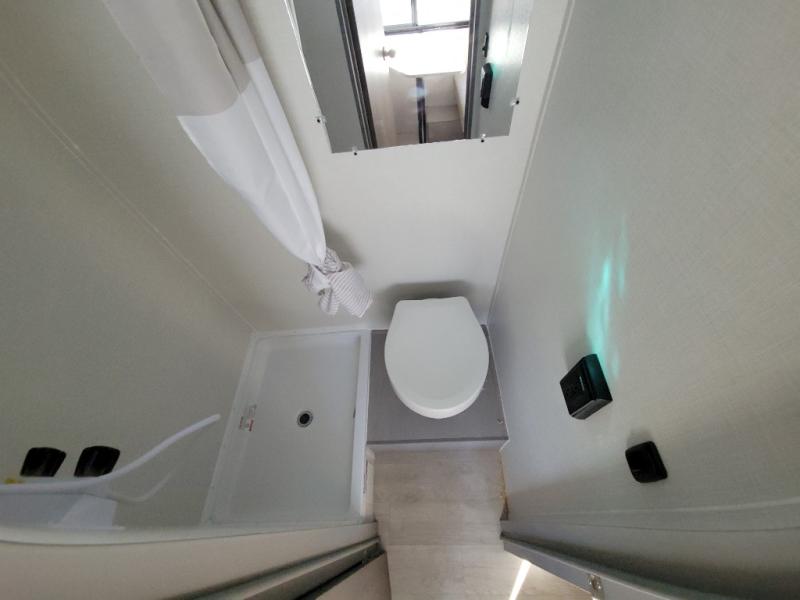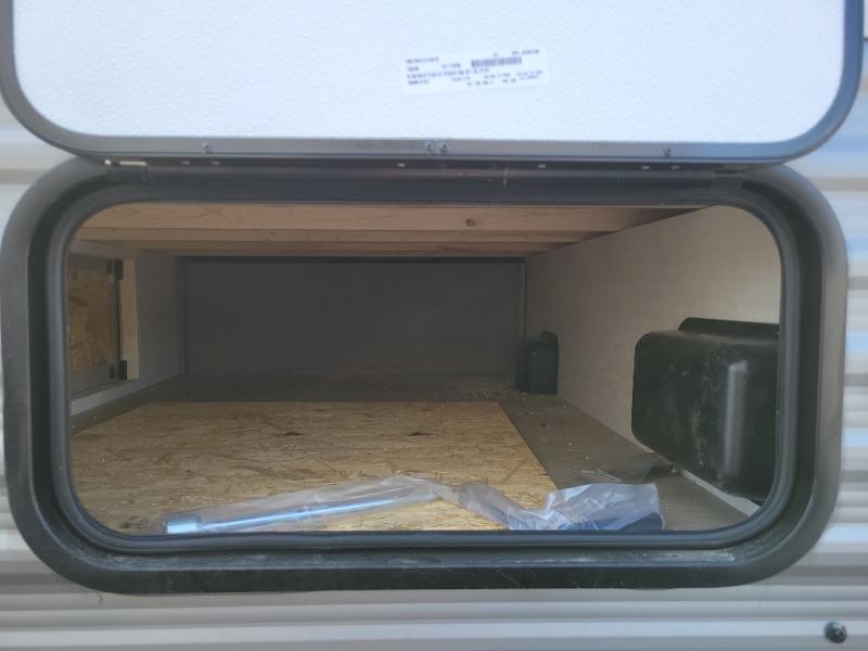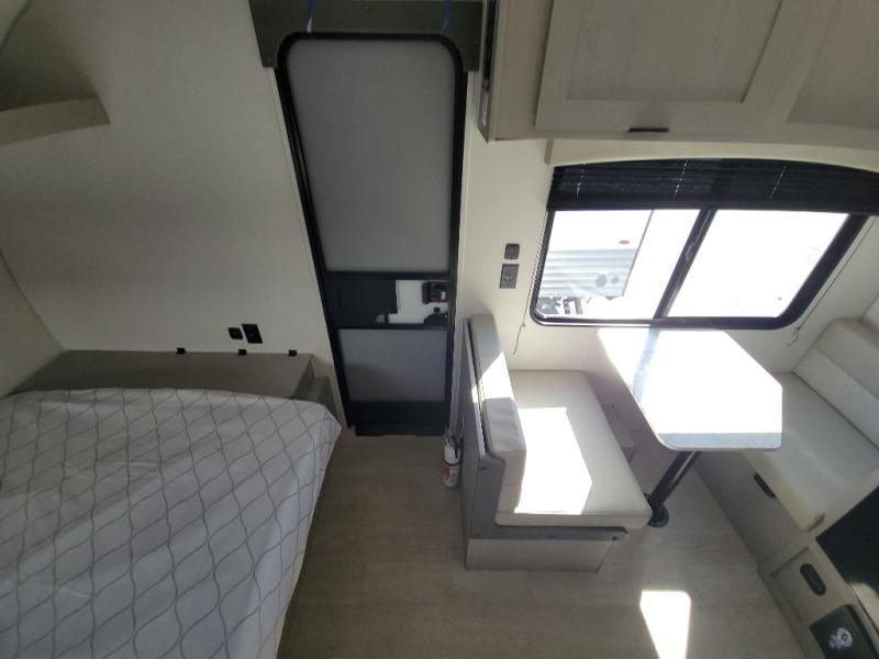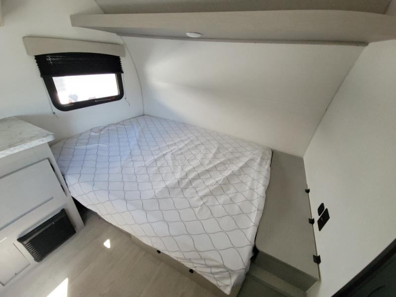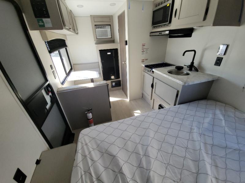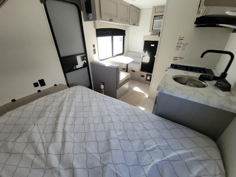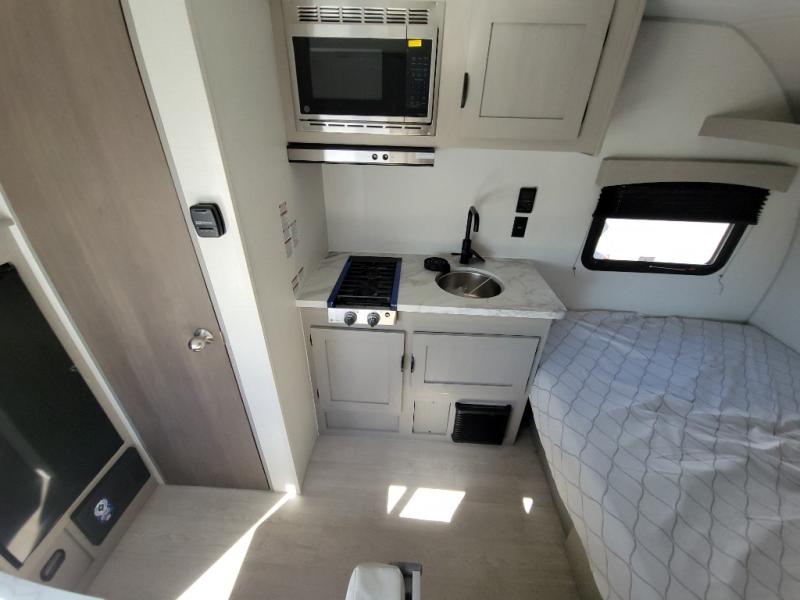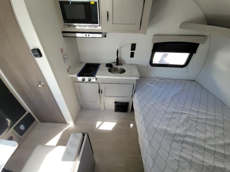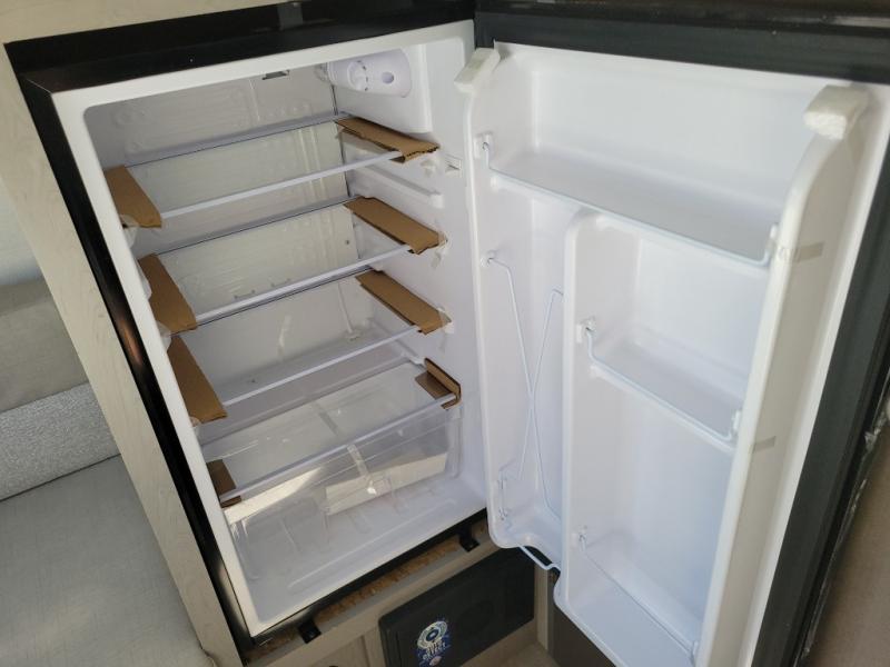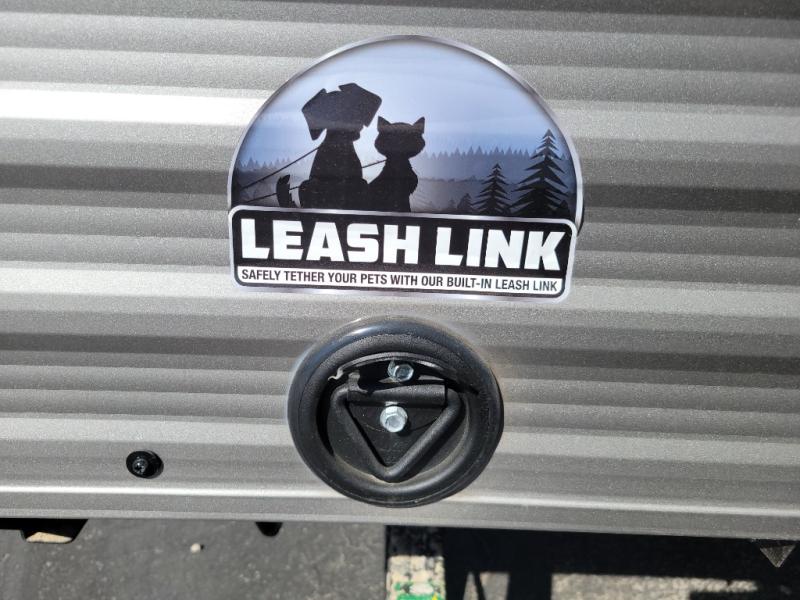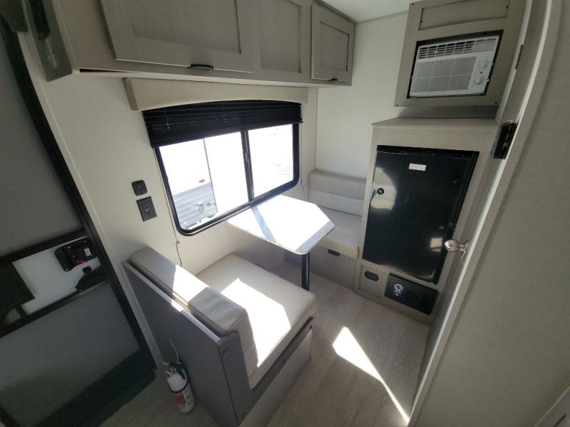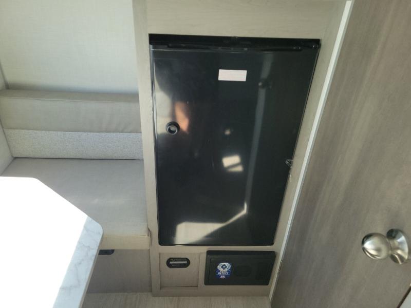 Lightweight camping with at-home comforts is possible with this travel trailer in tow! Once you arrive at the campground, you can unload the exterior storage, put out the awning, then head inside to make lunch on the two-burner cooktop. There is a refrigerator to keep your items fresh, plus a sink with a cup rinse for added convenience. The booth dinette provides a place to dine together, play a board game in the evenings, and let a guest or two little ones sleep on. You'll have the front 54" x 74" RV queen bed to yourselves, along with an overhead shelf and bedroom storage for your things. And don't overlook the private bath with a toilet and 24" x 32" shower!