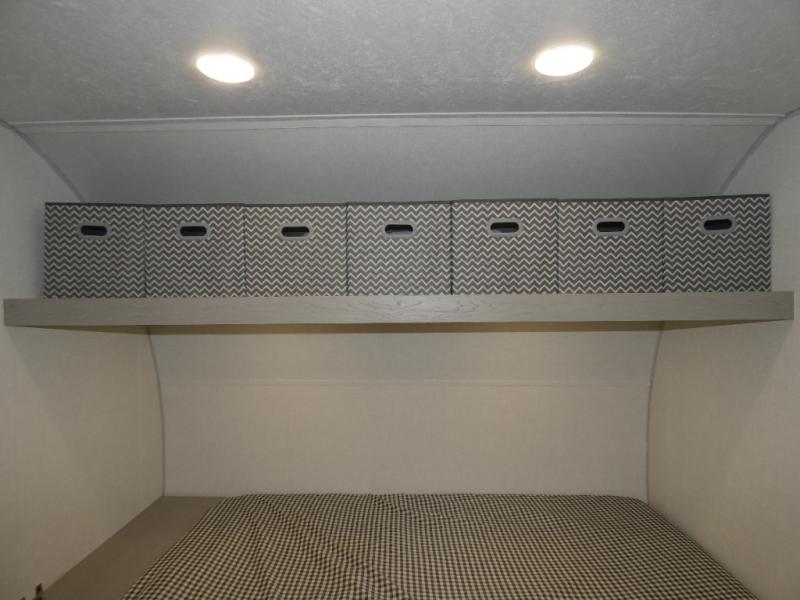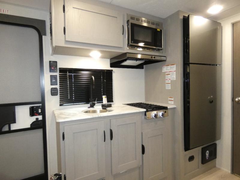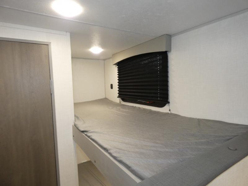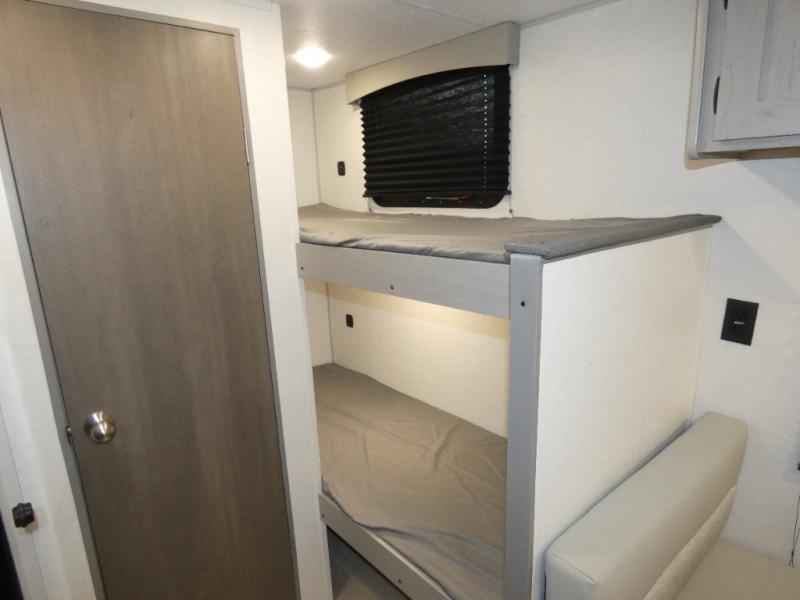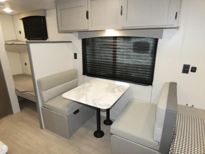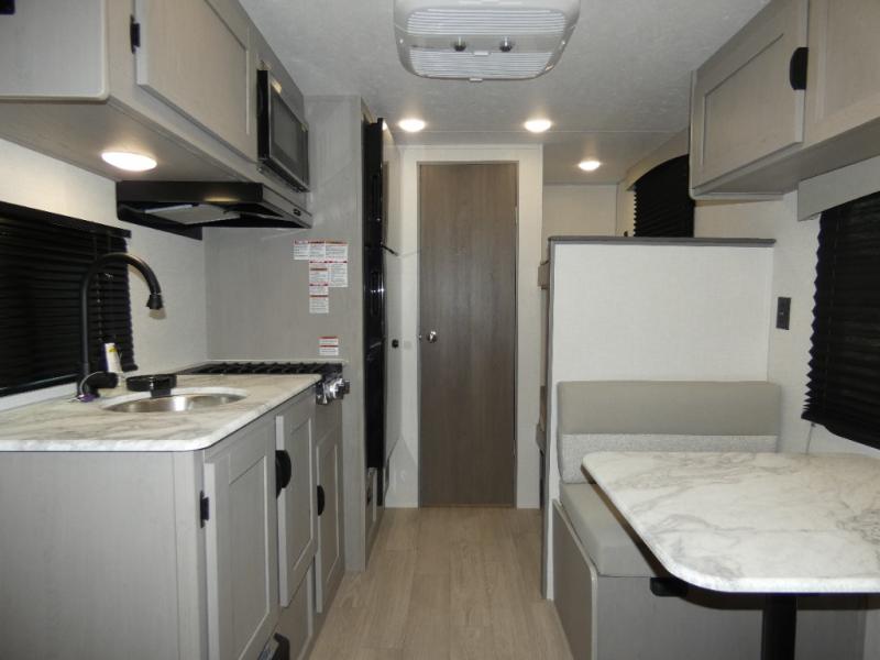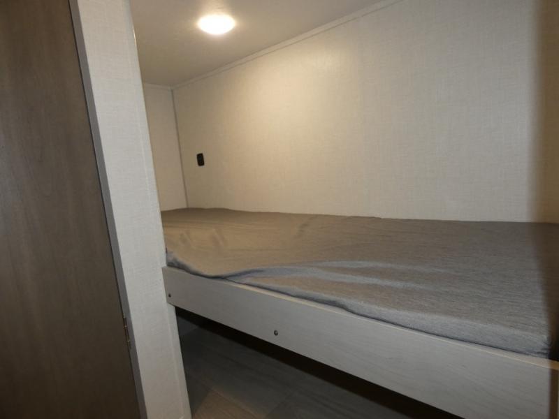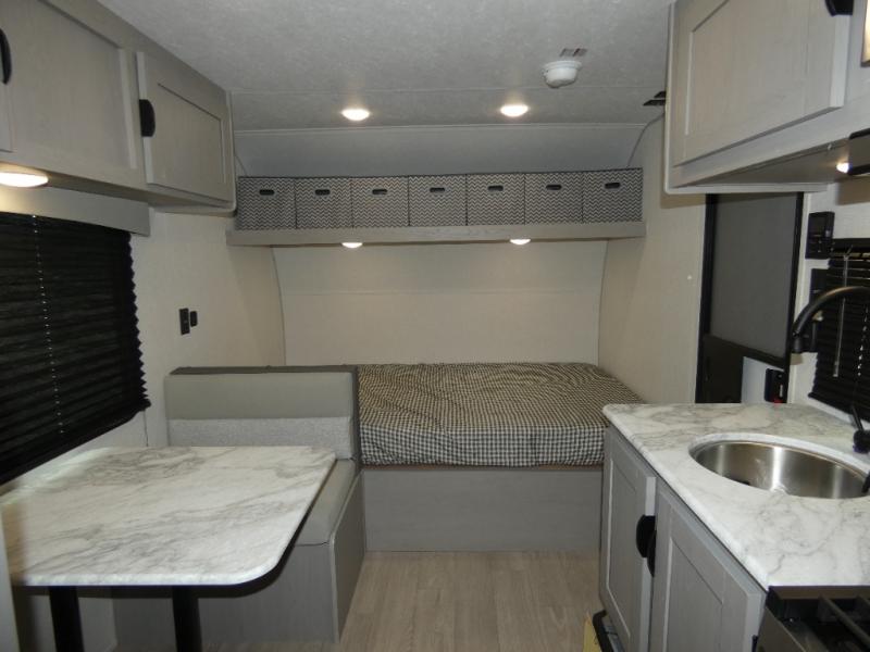 You can sleep five people in this Clipper 3K Series travel trailer with the 54" x 74" bed at the front, the booth dinette, and the 28" x 72" bunks. There is a private bathroom that everyone can use to stay clean, and the chef of the group can cook meals on the cooktop in the kitchen. There is a storage cabinet in the kitchen plus overhead cabinets for even more storage, and there is a pass-through exterior storage for larger gear. When it's raining outside, simply put out the 10' power awning for protection.