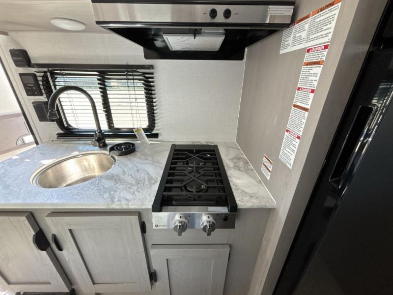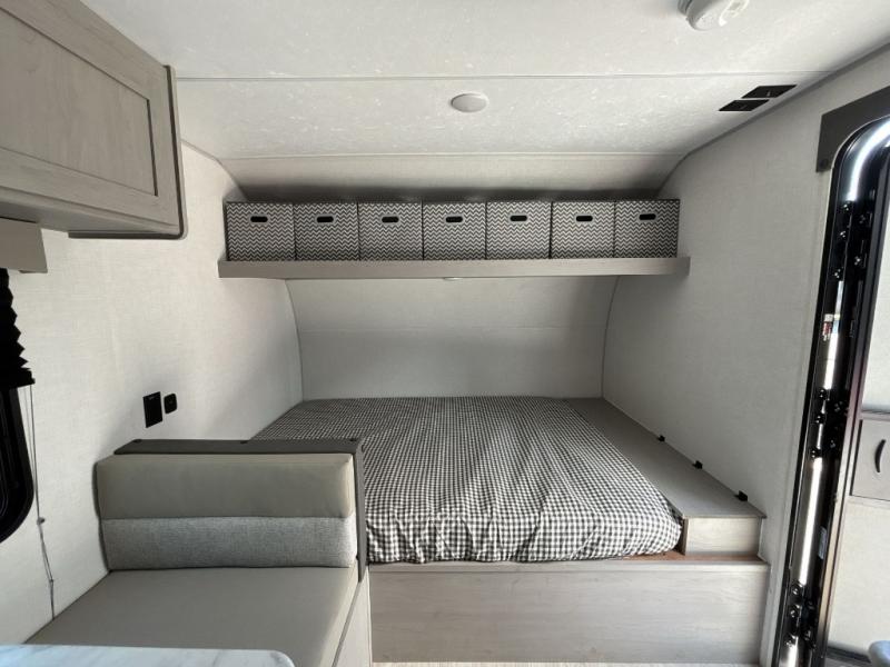 You can sleep five people in this Clipper 3K Series travel trailer with the 54" x 74" bed at the front, the booth dinette, and the 28" x 72" bunks. There is a private bathroom that everyone can use to stay clean, and the chef of the group can cook meals on the cooktop in the kitchen. There is a storage cabinet in the kitchen plus overhead cabinets for even more storage, and there is a pass-through exterior storage for larger gear. When it's raining outside, simply put out the 10' power awning for protection.
