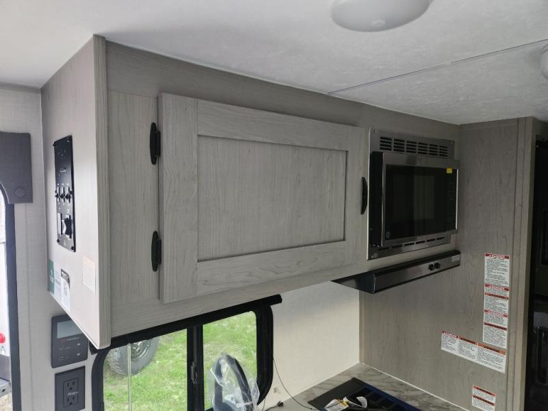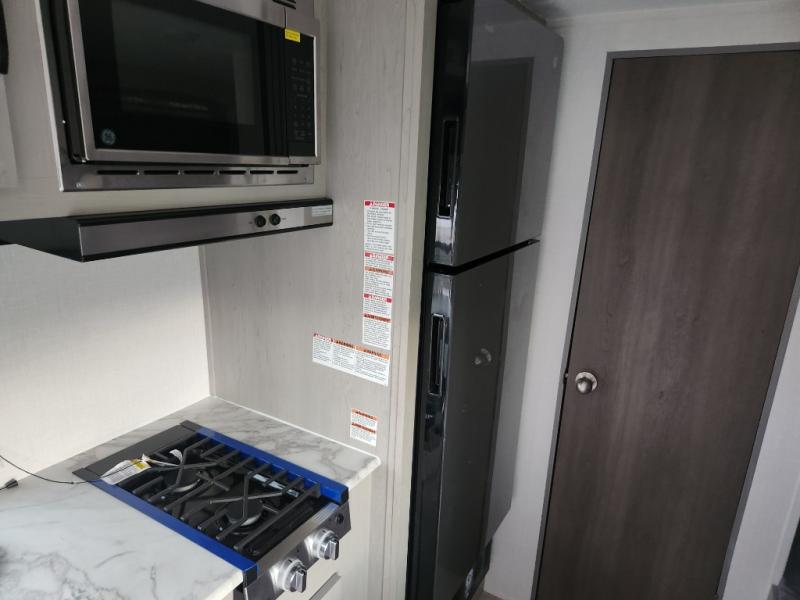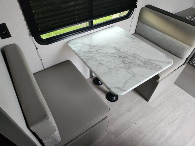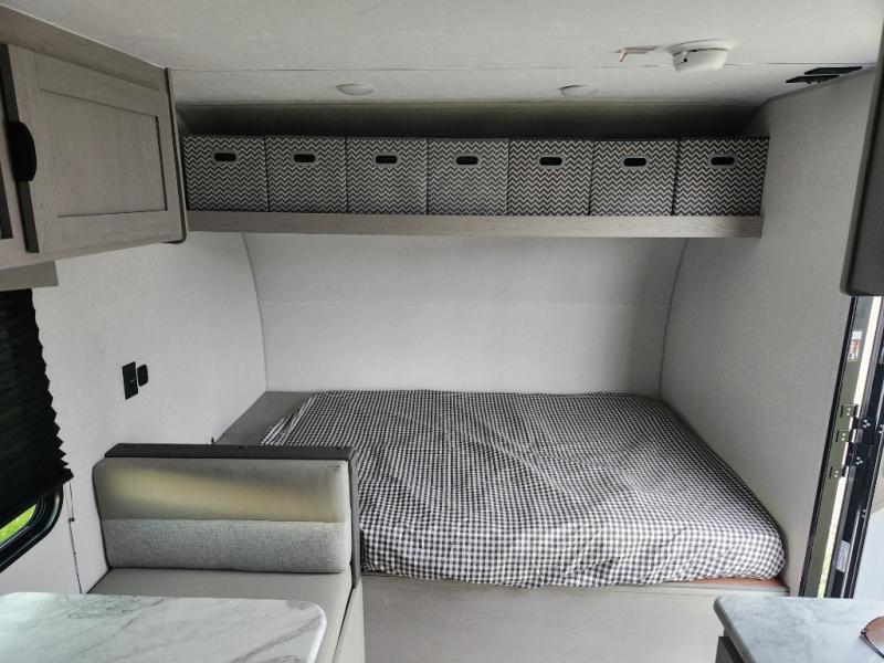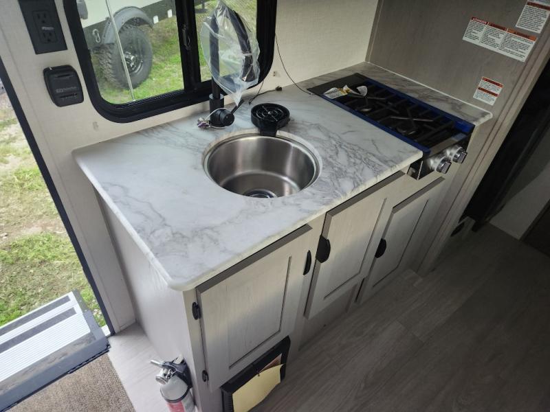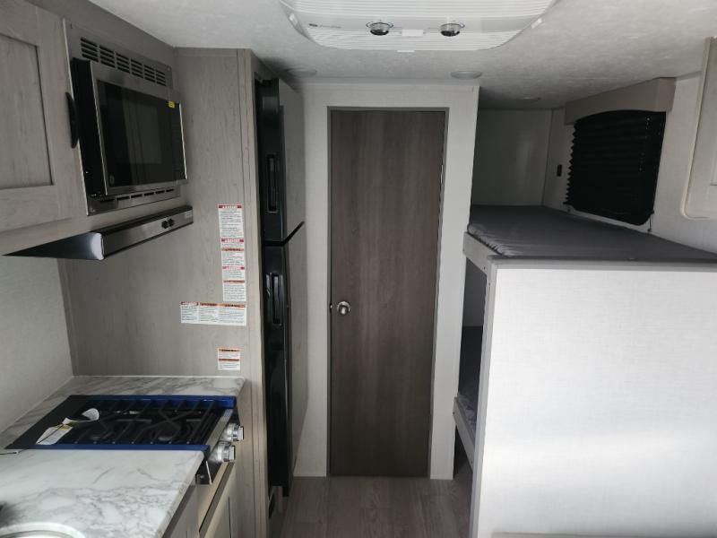 You can sleep five people in this Clipper 3K Series travel trailer with the 54" x 74" bed at the front, the booth dinette, and the 28" x 72" bunks. There is a private bathroom that everyone can use to stay clean, and the chef of the group can cook meals on the cooktop in the kitchen. There is a storage cabinet in the kitchen plus overhead cabinets for even more storage, and there is a pass-through exterior storage for larger gear. When it's raining outside, simply put out the 10' power awning for protection.