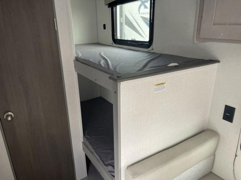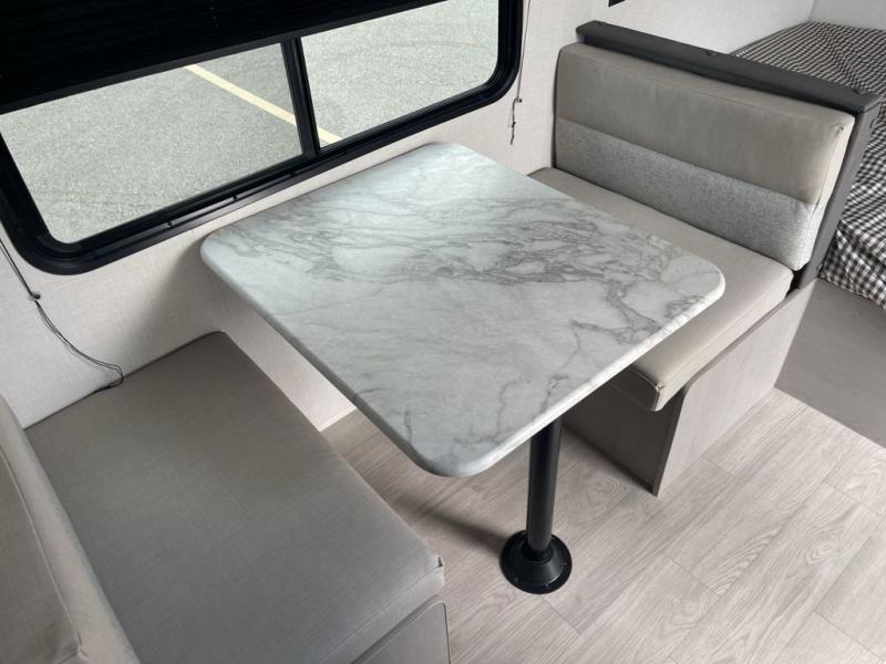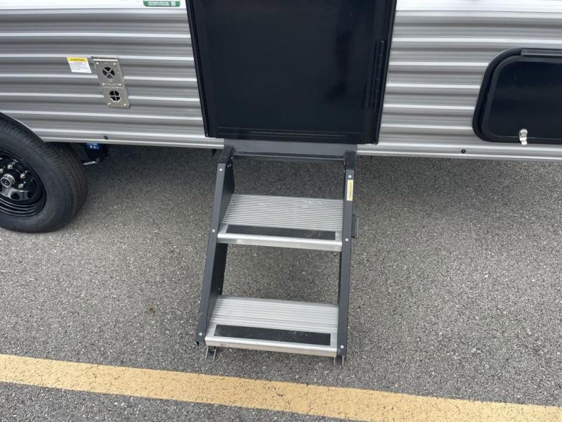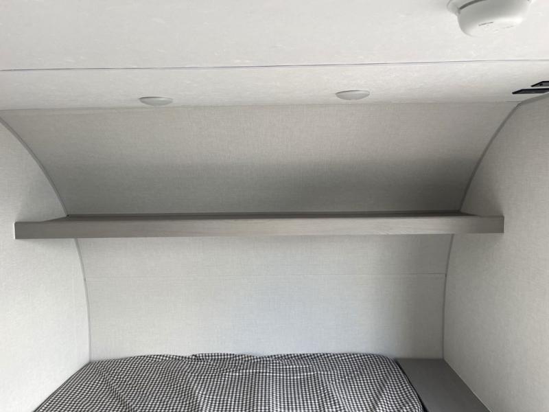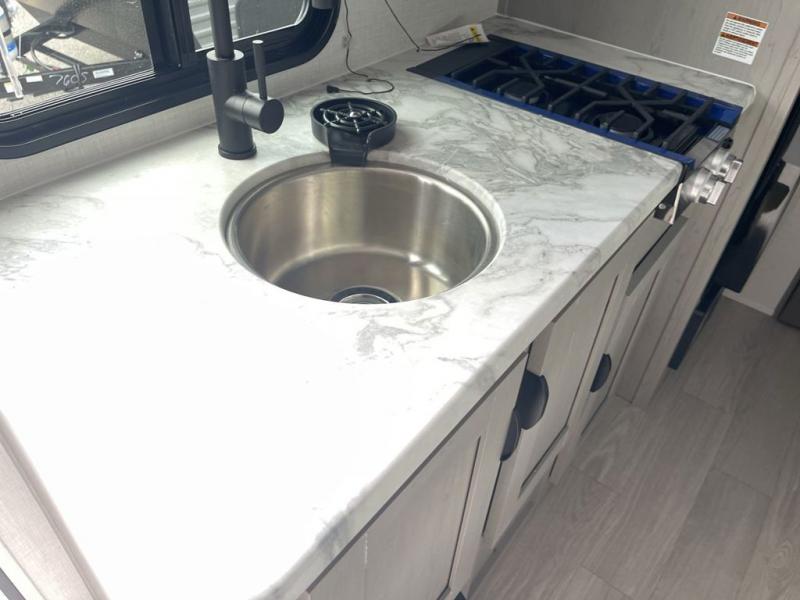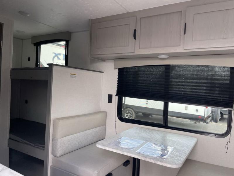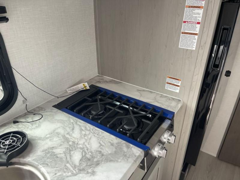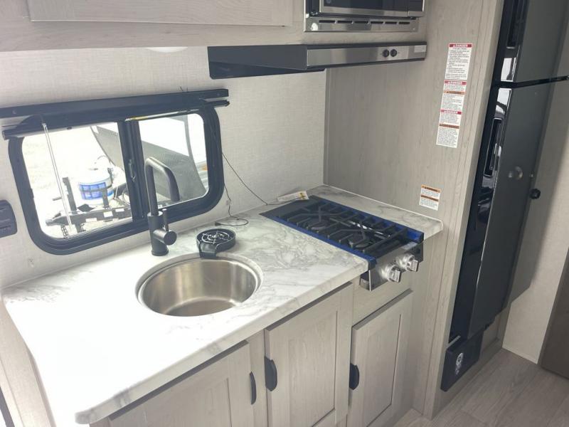 You can sleep five people in this Clipper 3K Series travel trailer with the 54" x 74" bed at the front, the booth dinette, and the 28" x 72" bunks. There is a private bathroom that everyone can use to stay clean, and the chef of the group can cook meals on the cooktop in the kitchen. There is a storage cabinet in the kitchen plus overhead cabinets for even more storage, and there is a pass-through exterior storage for larger gear. When it's raining outside, simply put out the 10' power awning for protection.