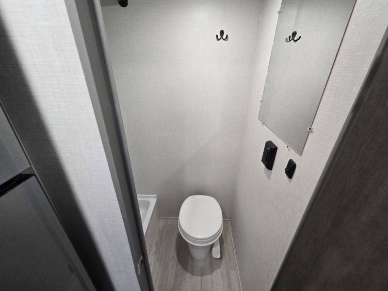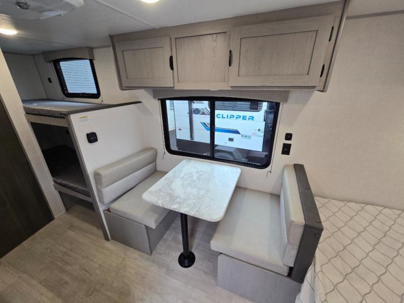 You can sleep five people in this Clipper 3K Series travel trailer with the 54" x 74" bed at the front, the booth dinette, and the 28" x 72" bunks. There is a private bathroom that everyone can use to stay clean, and the chef of the group can cook meals on the cooktop in the kitchen. There is a storage cabinet in the kitchen plus overhead cabinets for even more storage, and there is a pass-through exterior storage for larger gear. When it's raining outside, simply put out the 10' power awning for protection.