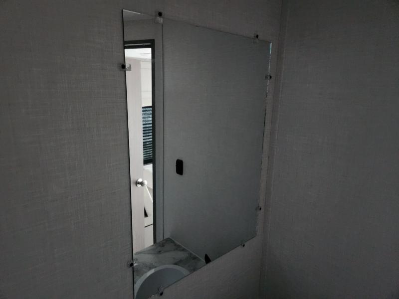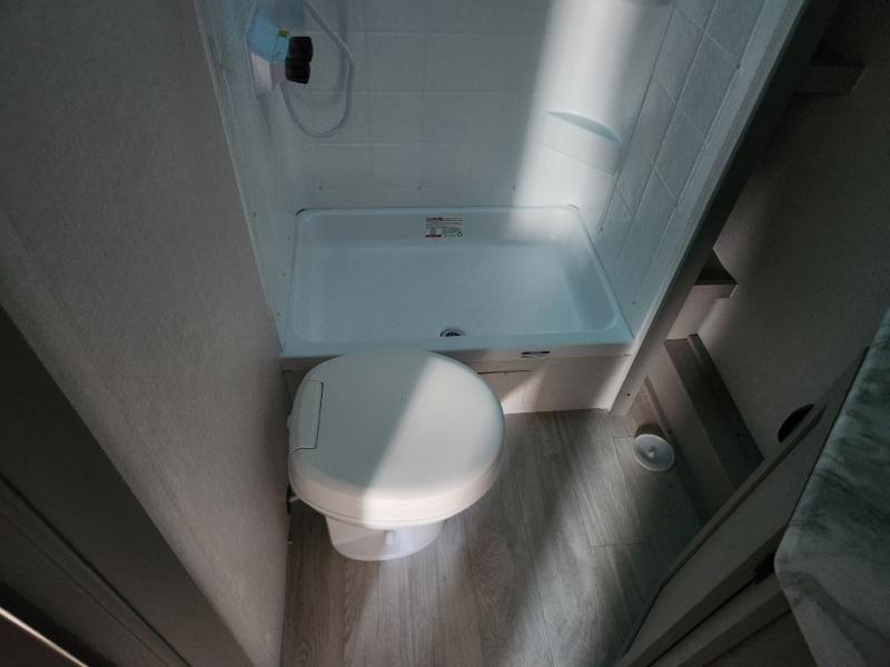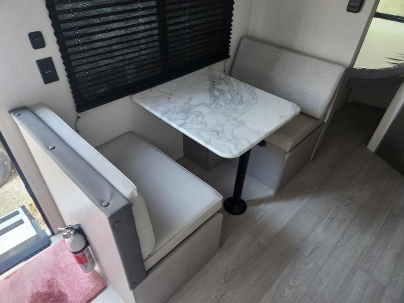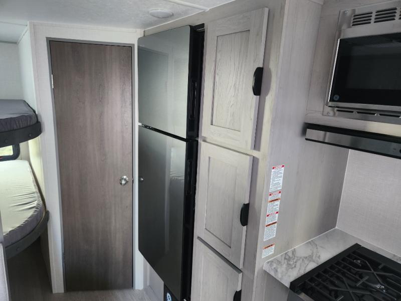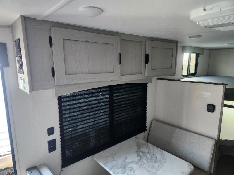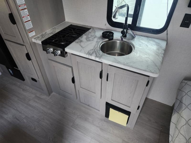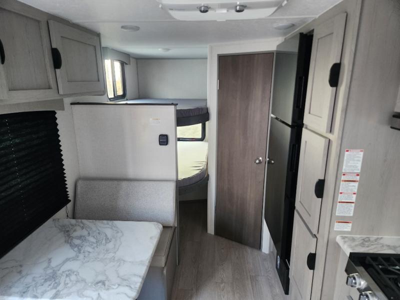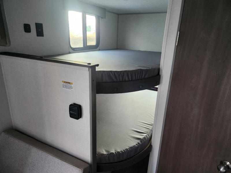 This travel trailer is perfect for a small family who wants to escape the hustle and bustle of everyday life! The front 60" x 74" bed offers a comfortable place to lay your head at night, and there is a wardrobe and overhead cabinet to store your items. Prepare a delicious home cooked meal with the two burner cooktop and eat them at the booth dinette before playing a card game or two. The kiddos and a couple of friends can sleep on the set of 42" x 72" bunk beds, and will enjoy how easy it is to access the rear corner bathroom right next to them!