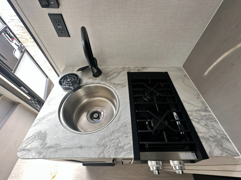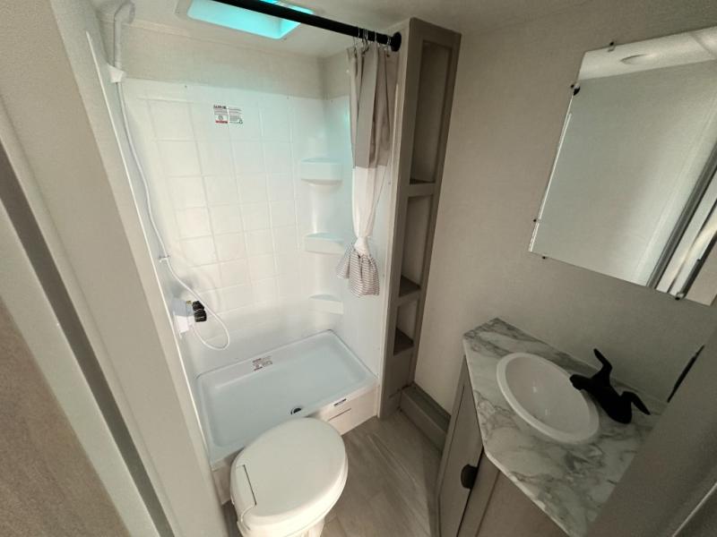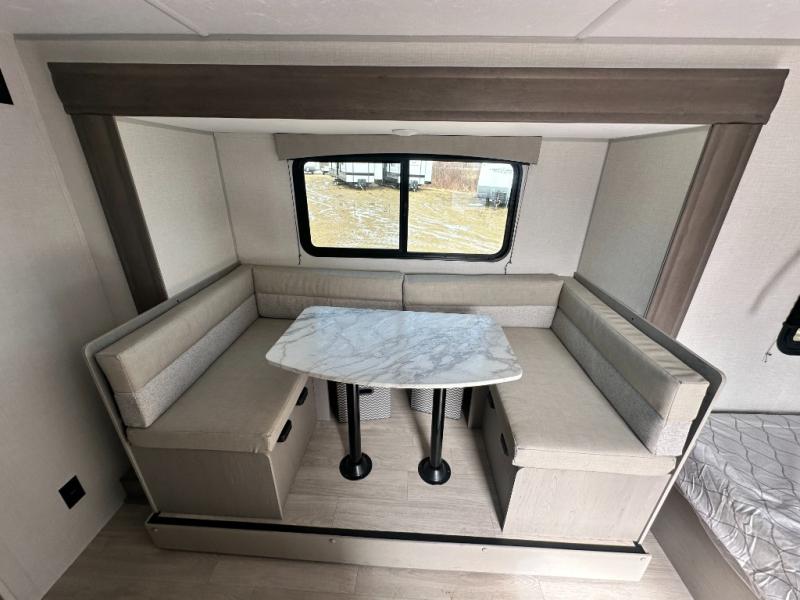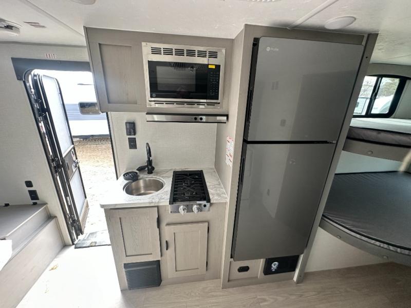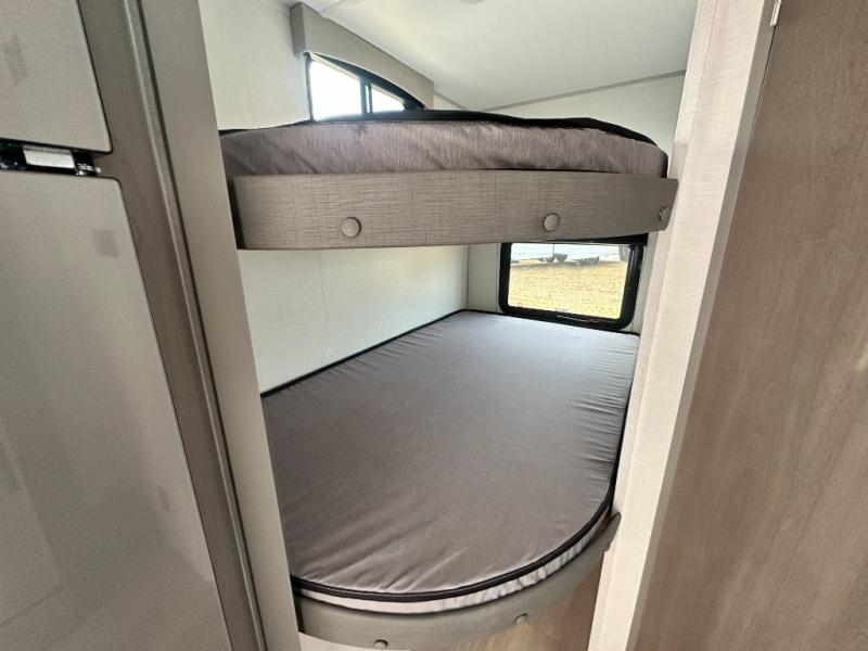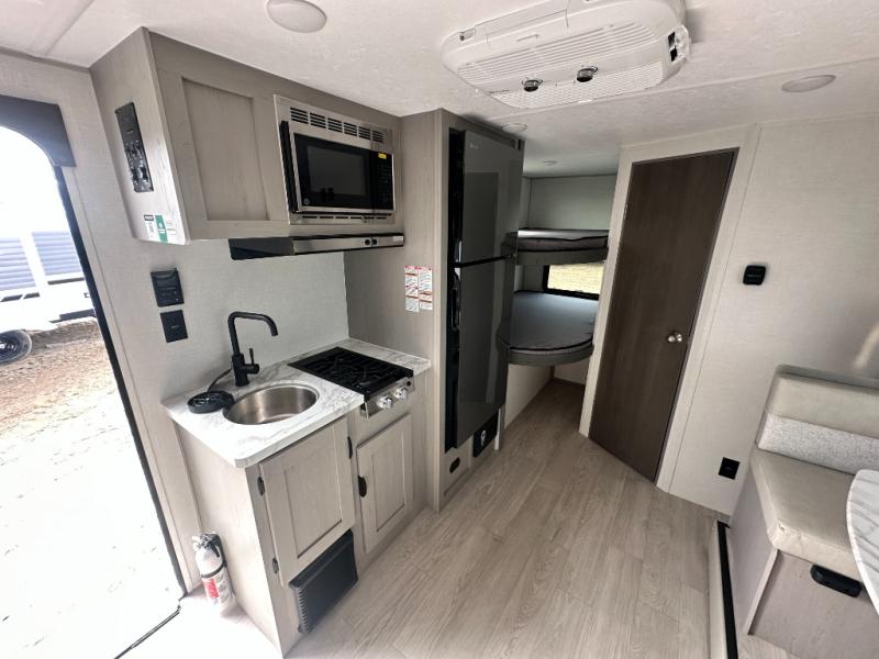 This trailer easily sleeps a family of eight and provides plenty of seating thanks to the versatile space saving Murphy wall-bed behind the U-dinette. During the day, the U-dinette provides seating for the whole gang. At night, move the table and cushions and flip down a comfortable 54" x 74" bed. There is a jackknife sofa slide, and opposite you will find the kitchen area allowing you to easily whip up meals and snacks using the two-burner cooktop, sink, overhead microwave oven, and refrigerator. A pantry cabinet is also available for all of your dry goods. At the rear of this unit, you will find sleeping for four on the 42" x 72" bunks along the roadside corner, and a full bath with shower, toilet, and vanity with sink and medicine cabinet along the curbside corner.