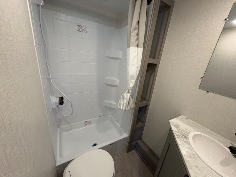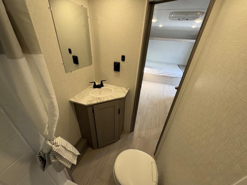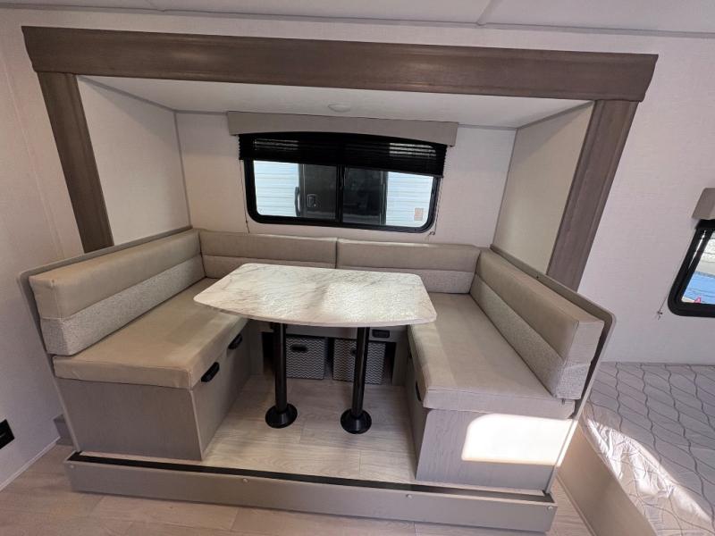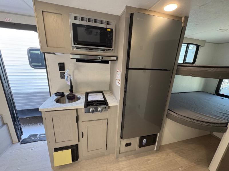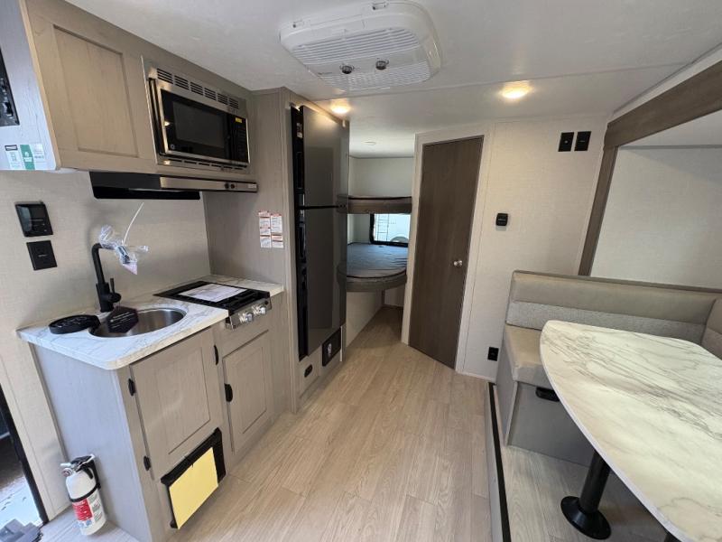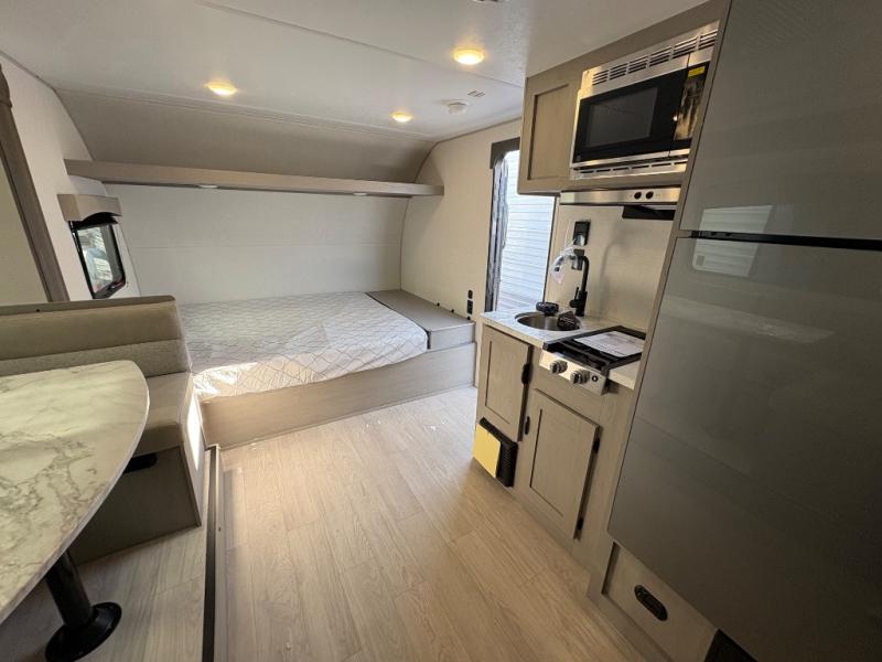 This trailer easily sleeps a family of eight and provides plenty of seating thanks to the versatile space saving Murphy wall-bed behind the U-dinette. During the day, the U-dinette provides seating for the whole gang. At night, move the table and cushions and flip down a comfortable 54" x 74" bed. There is a jackknife sofa slide, and opposite you will find the kitchen area allowing you to easily whip up meals and snacks using the two-burner cooktop, sink, overhead microwave oven, and refrigerator. A pantry cabinet is also available for all of your dry goods. At the rear of this unit, you will find sleeping for four on the 42" x 72" bunks along the roadside corner, and a full bath with shower, toilet, and vanity with sink and medicine cabinet along the curbside corner.